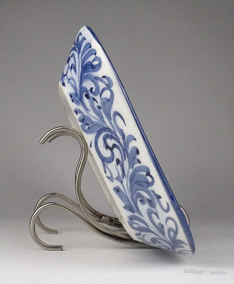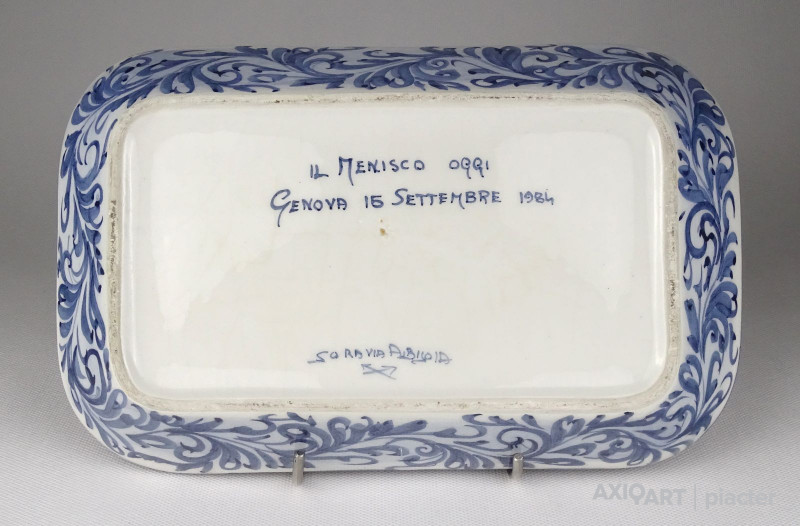 [1Q895/X025] Szép állapotú, az antik itáliai fajanszokat utánzó stílusban készült, kézzel festett fajansz tál, kínáló tál. Közepén ugró nyúl, nyuszi díszítés látható. A tál peremén kopások találhatók. Alján datált jelzés, felirat: IL MENISCO 0991 GENOVA 15 SEPTEMBRE 1984 SORAVIA ALBISOLA (Sandro Soravia - Albisola/Genova) Szélesség: 16.3 cm Hosszúság: 26 cm Súly: 0.545 kg Sandro Soravia 1931-ben született Milánóban. Jelenleg Albisolában (Savona) él és dolgozik, és sok különböző országból származó művészt szeretettel fogadnak Colombón keresztül a 13. szám alatti stúdiójában. A Ligur Kerámiatörténeti Központ munkatársa, és alkalmanként kerámiaórákat tart a savonai általános iskolákban. A kerámia alkotás áll munkásságának középpontjában, amelyet nagyon egyéni látásmód és gazdag képzelőerő jellemez. Számos kiállításon vett részt, és számos egyéni bemutatót tartott bronz-, terrakotta- és festményeiből Olaszország nagyobb városaiban, valamint Franciaországban, Spanyolországban, Hollandiában, Németországban, Brazíliában, Japánban, az Egyesült Államokban és az Egyesült Államokban. az Európai Parlamentben Strasbourgban. Együttműködött a genovai Ligur Képzőművészeti Akadémiával a környezet javítását célzó művészeti kezdeményezések projektjének kidolgozásában, és együttműködött a veronai Képzőművészeti Akadémiával. Munkásságáról vezető olasz és külföldi kritikusok írtak.   Forrás: https://www.saatchiart.com/soravia