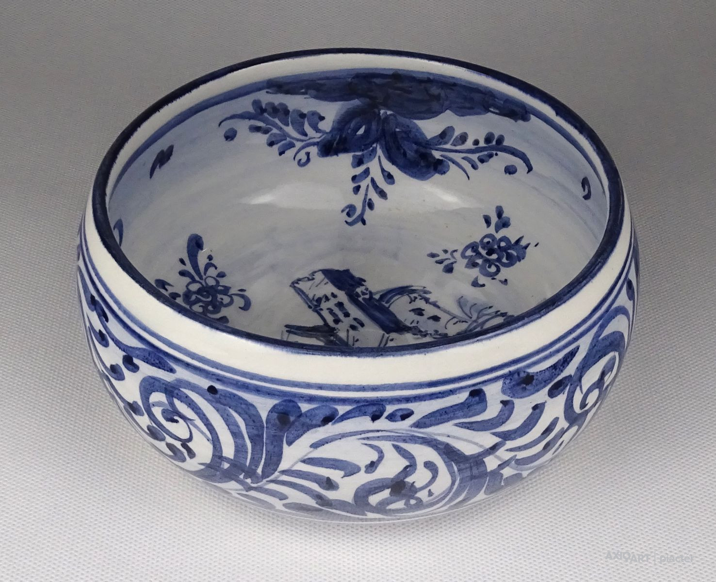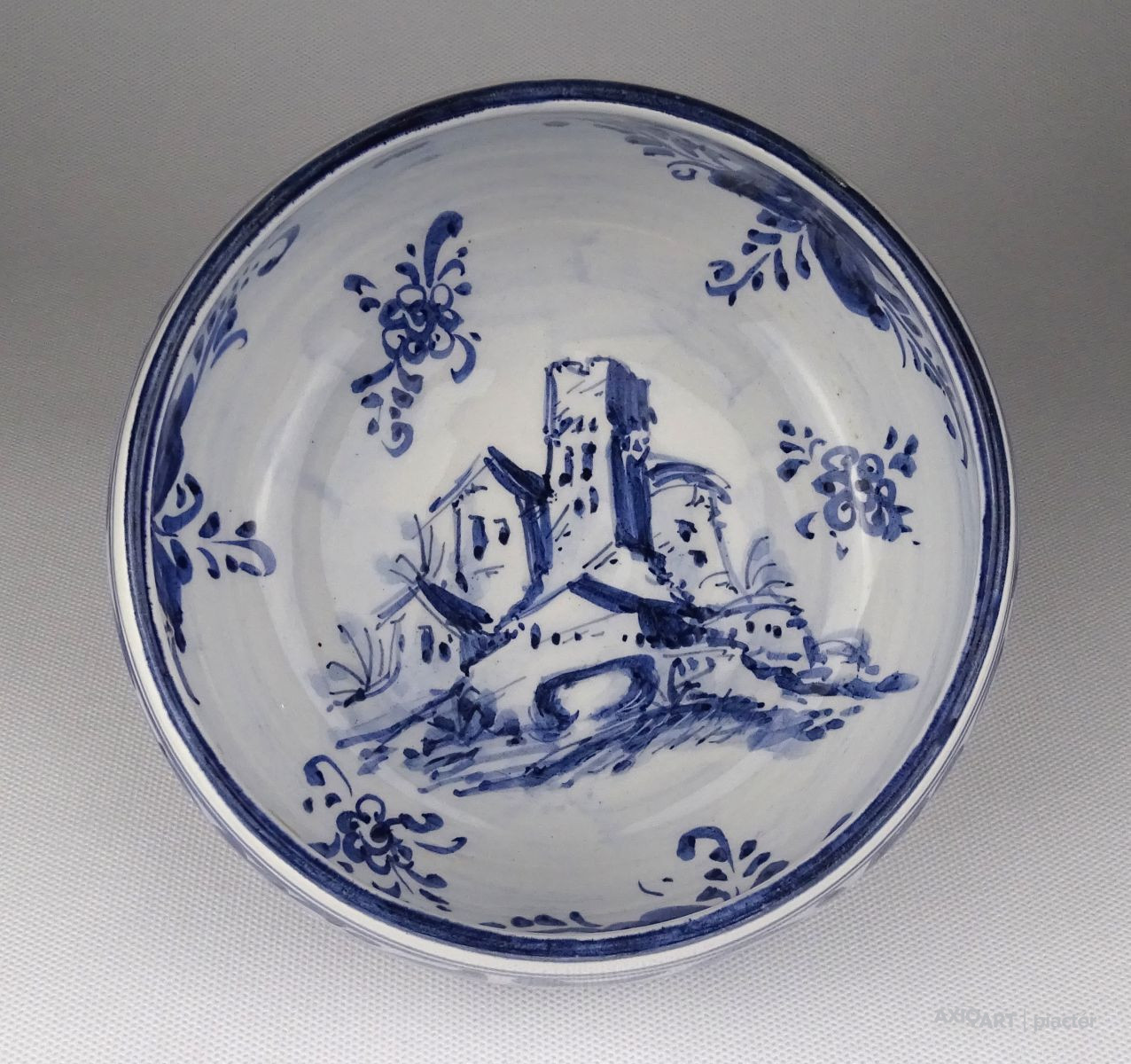 Szép állapotú, az antik itáliai fajanszokat utánzó stílusban készült, kézzel festett fajansz tál, kínáló tál. Közepén épületábrázolás látható.