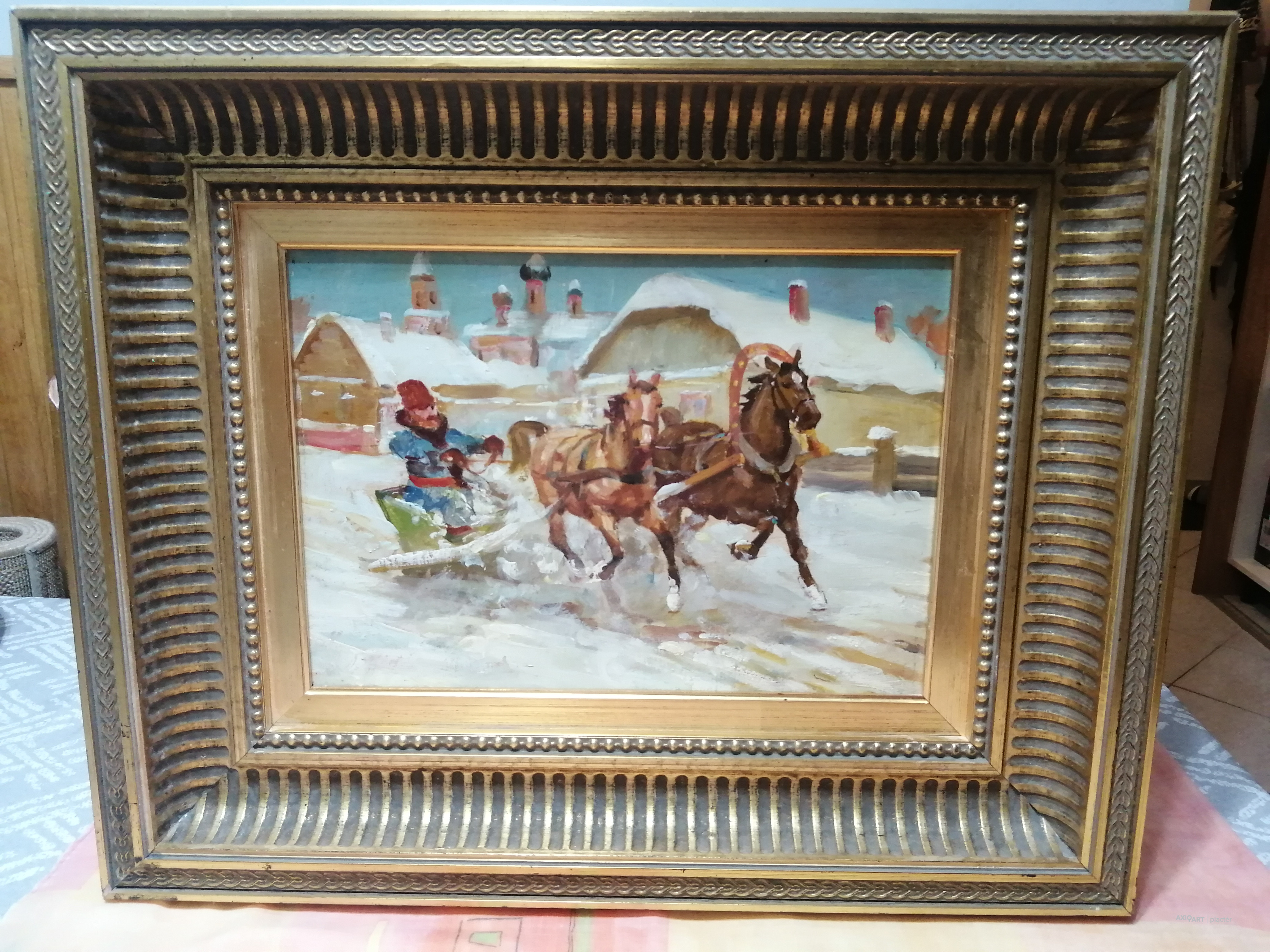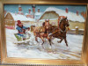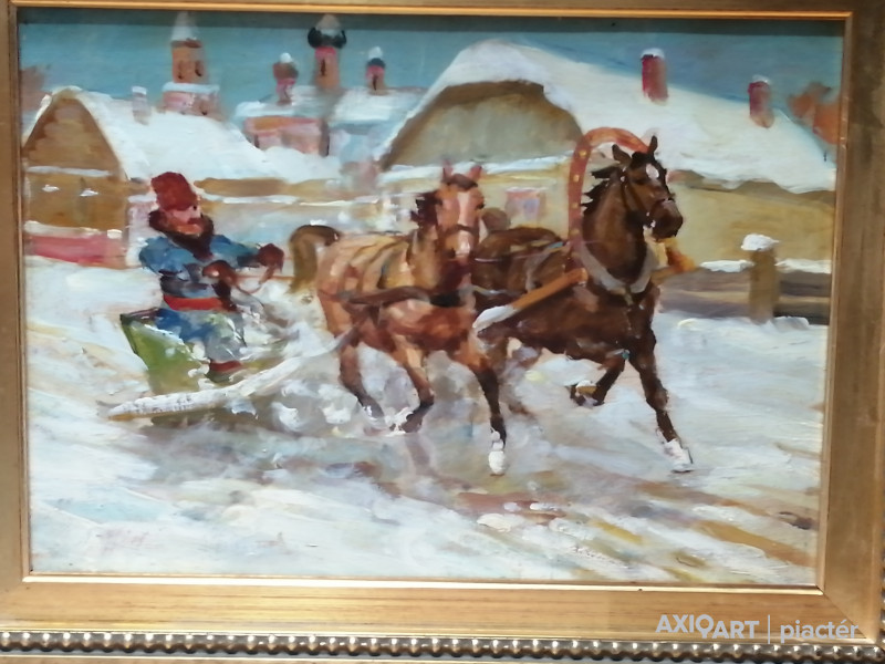 Téli életképet ábrázoló, lendületes ecsetkezelésű kompozíció: lovas szánon haladó alak, havas falusi környezetben, háttérben templomtornyokkal és paraszti épületekkel. A jelenet dinamikája, a színek frissessége és a plein air jellegű festésmód jól illeszkedik Hódi Géza ismert alföldi és életképi munkásságához. Az utolsó képen a keret apró hibája fotózva.