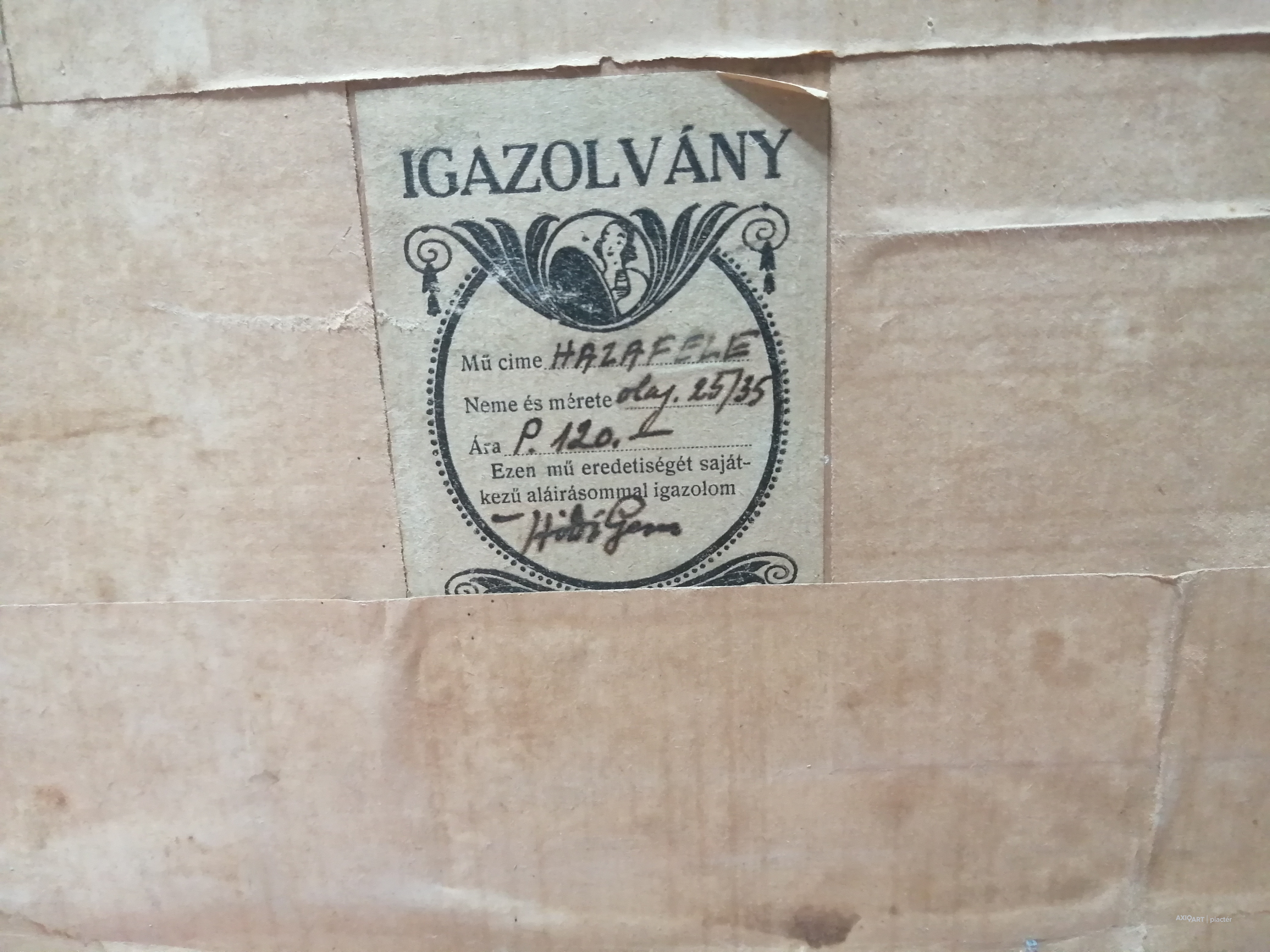 A festmény előlapon nem szignált, ugyanakkor a hátoldalon korabeli „Igazolvány” címkével rendelkezik, amelyen a mű címe (Hazafelé), technikája, mérete és a festő saját kezű aláírása szerepel.