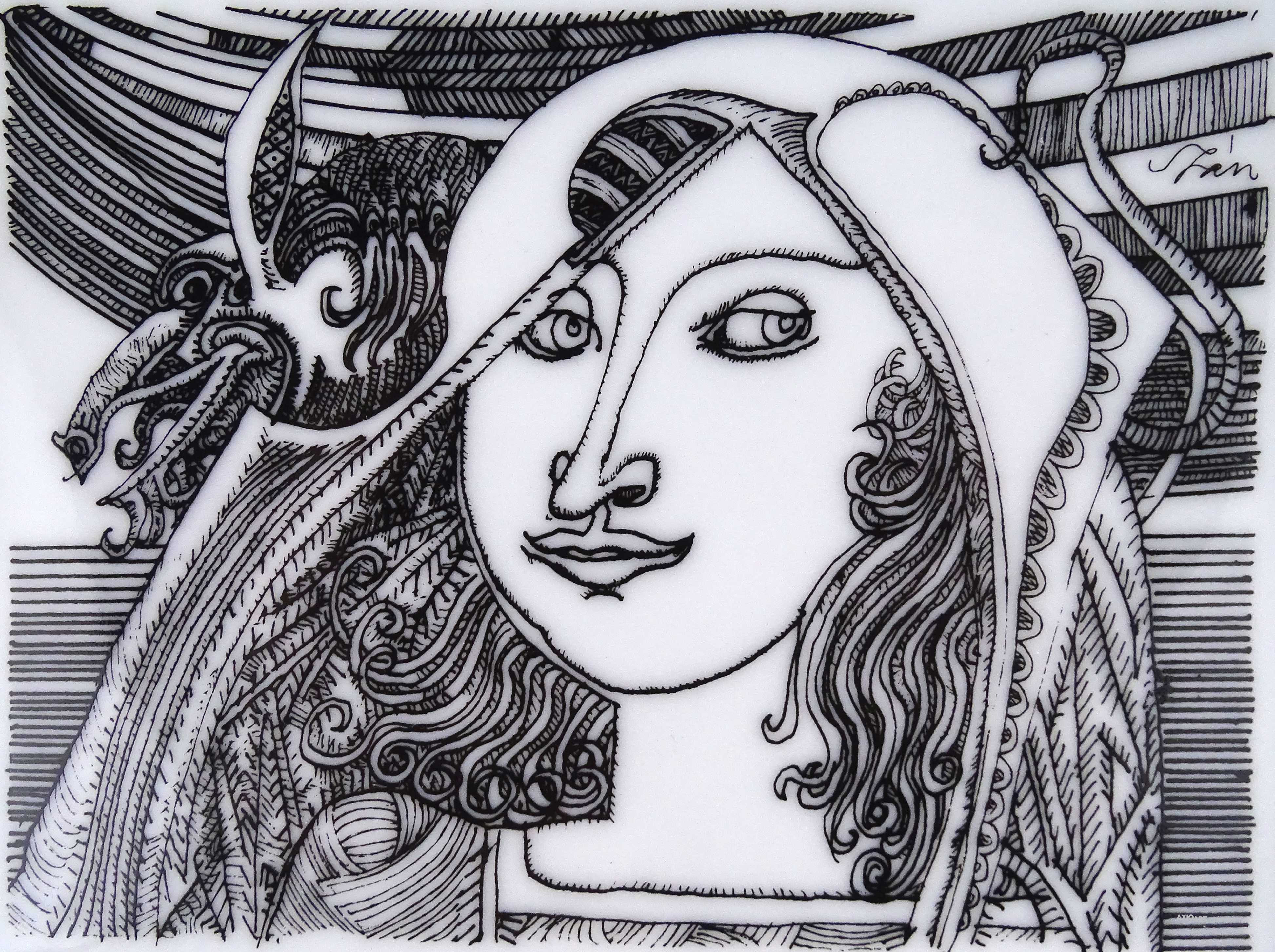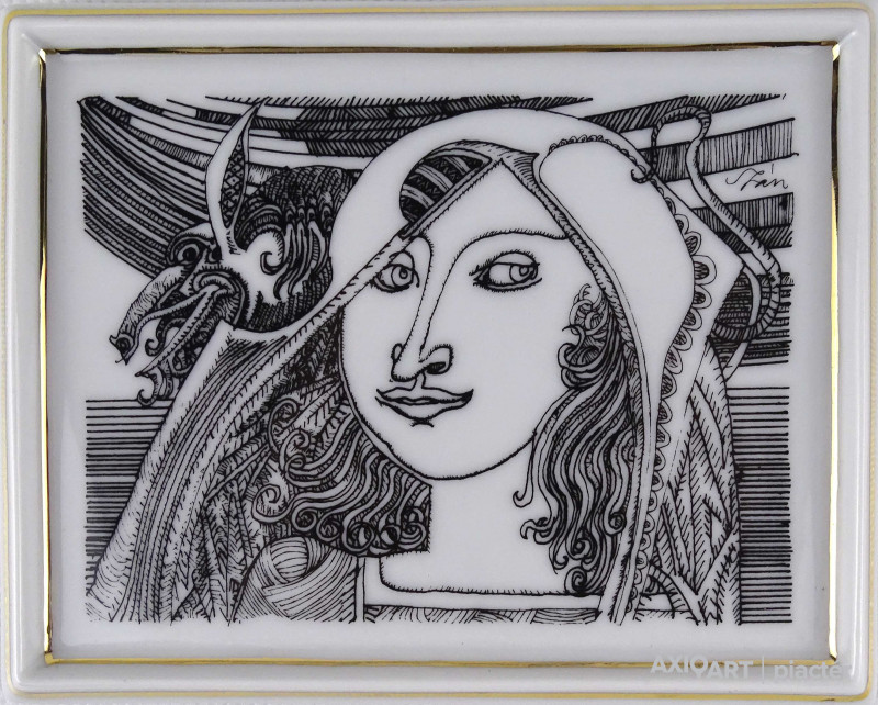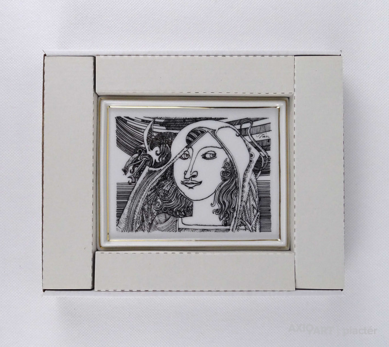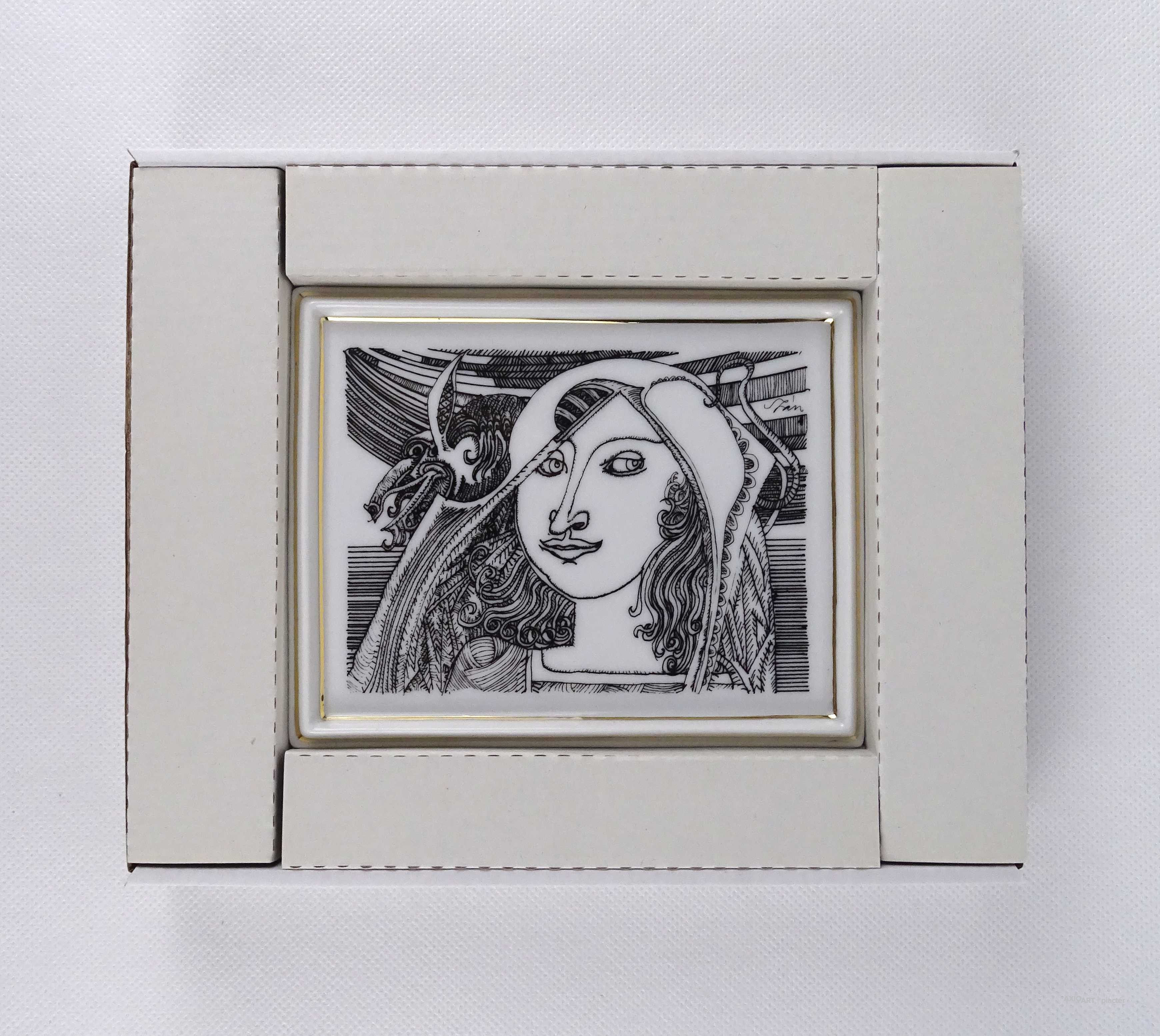 Hollóházi falikép Szász Endre STUDIÓ sárkányos női portré eredeti dobozában 15 x 12 cm