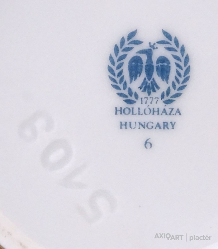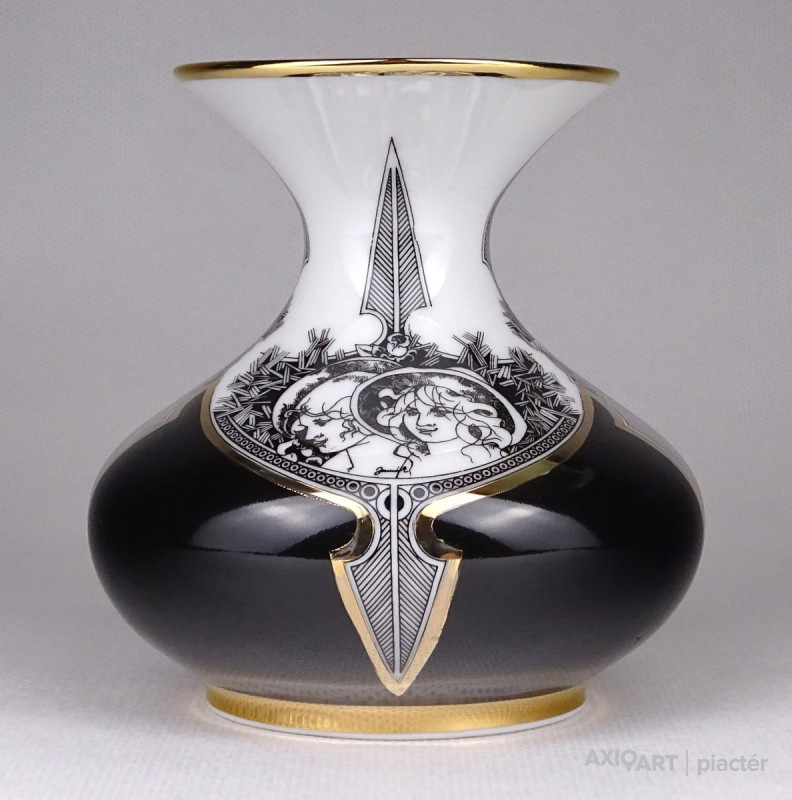 [1M847/Z022] Hibátlan állapotú, jelzett, arannyal gazdagon díszített, fekete-fehér asztali dísz váza. A váza két oldalán Jurcsák László által tervezett díszítés, női portré pár látható. Jelzés a motívumok között: JURCSÁK Alján kék színű Hollóházi márkajelzés: HOLLÓHÁZA HUNGARY Formaszám: 5109 Magasság: 10 cm Szélesség: 9.5 cm Súly: 0.185 kg