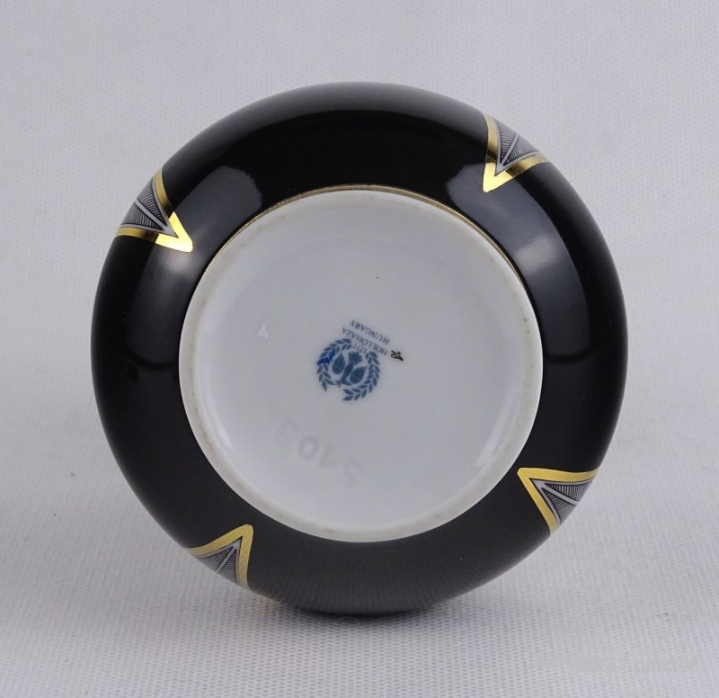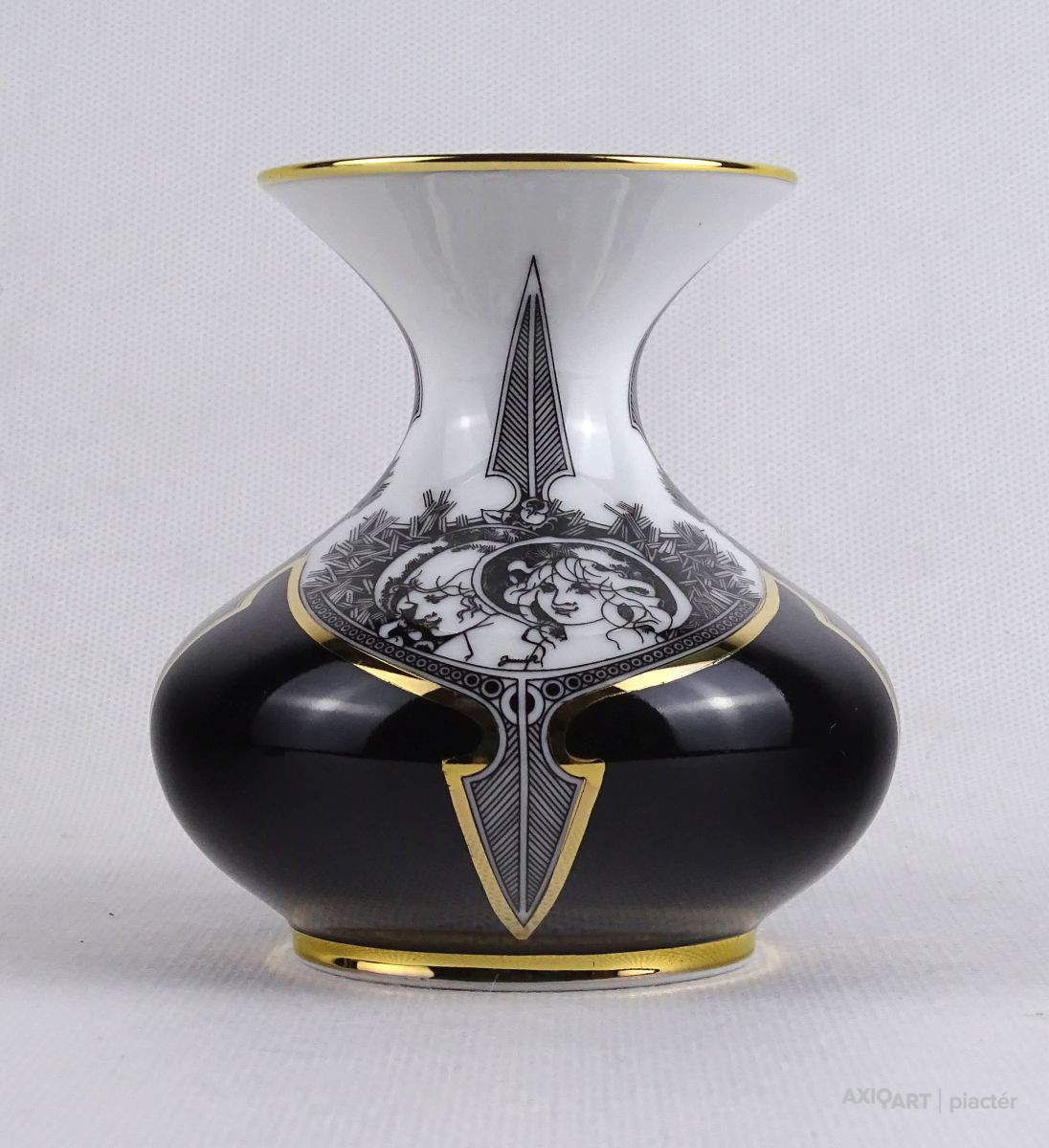 [1T654/Z009] Hibátlan állapotú, jelzett, arannyal gazdagon díszített, fekete-fehér asztali dísz váza. A váza két oldalán Jurcsák László által tervezett díszítés, női portré pár látható. Jelzés a motívumok között: JURCSÁK Alján kék színű Hollóházi márkajelzés: HOLLÓHÁZA HUNGARY Formaszám: 5109 Magasság: 10 cm Szélesség: 9.8 cm Súly: 0.17 kg