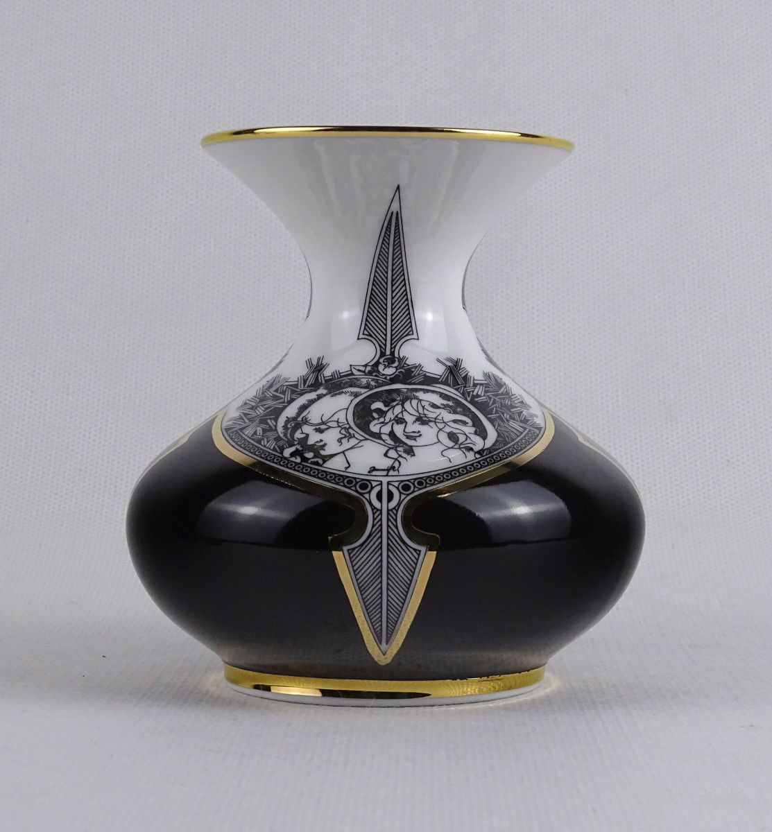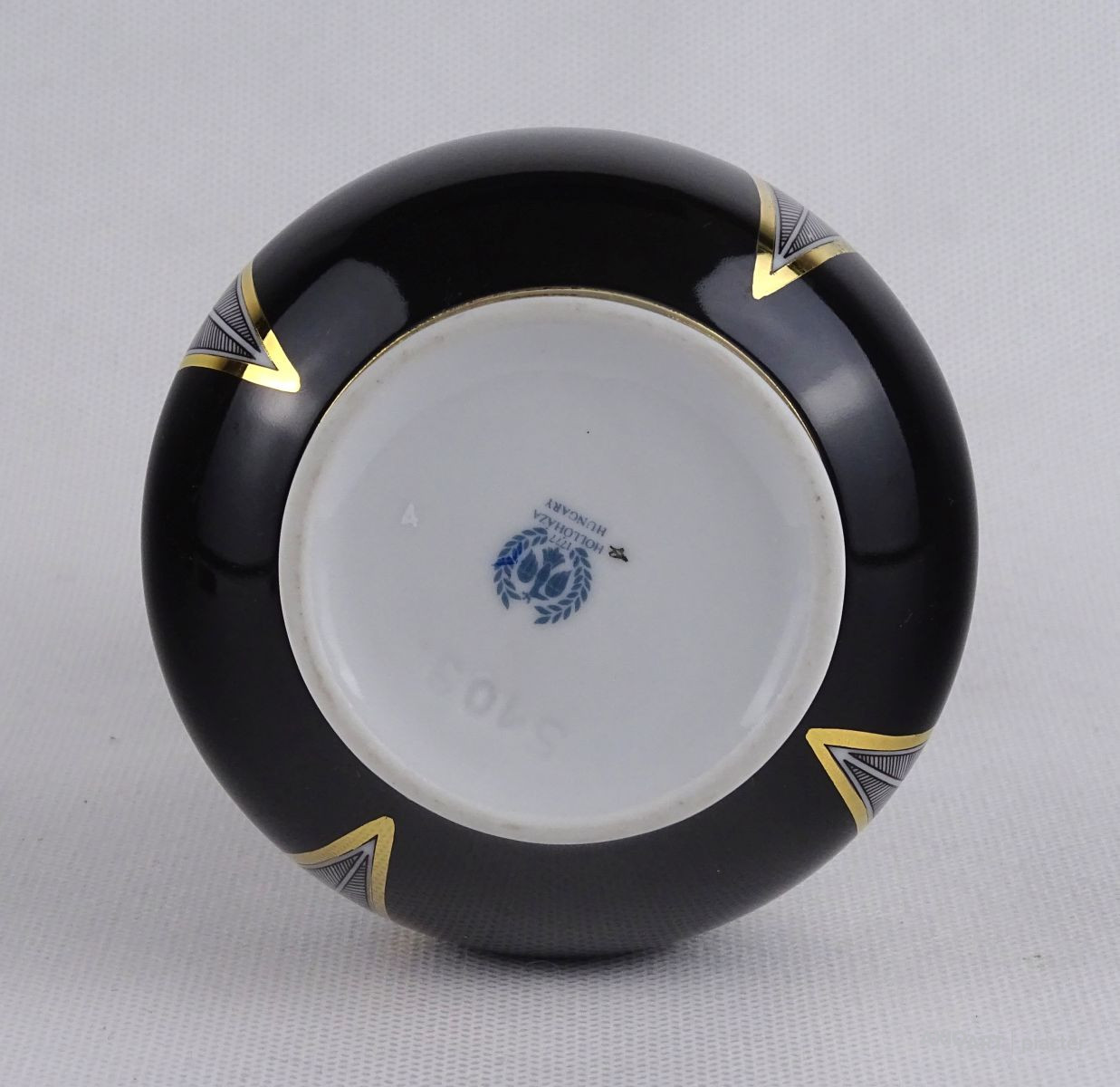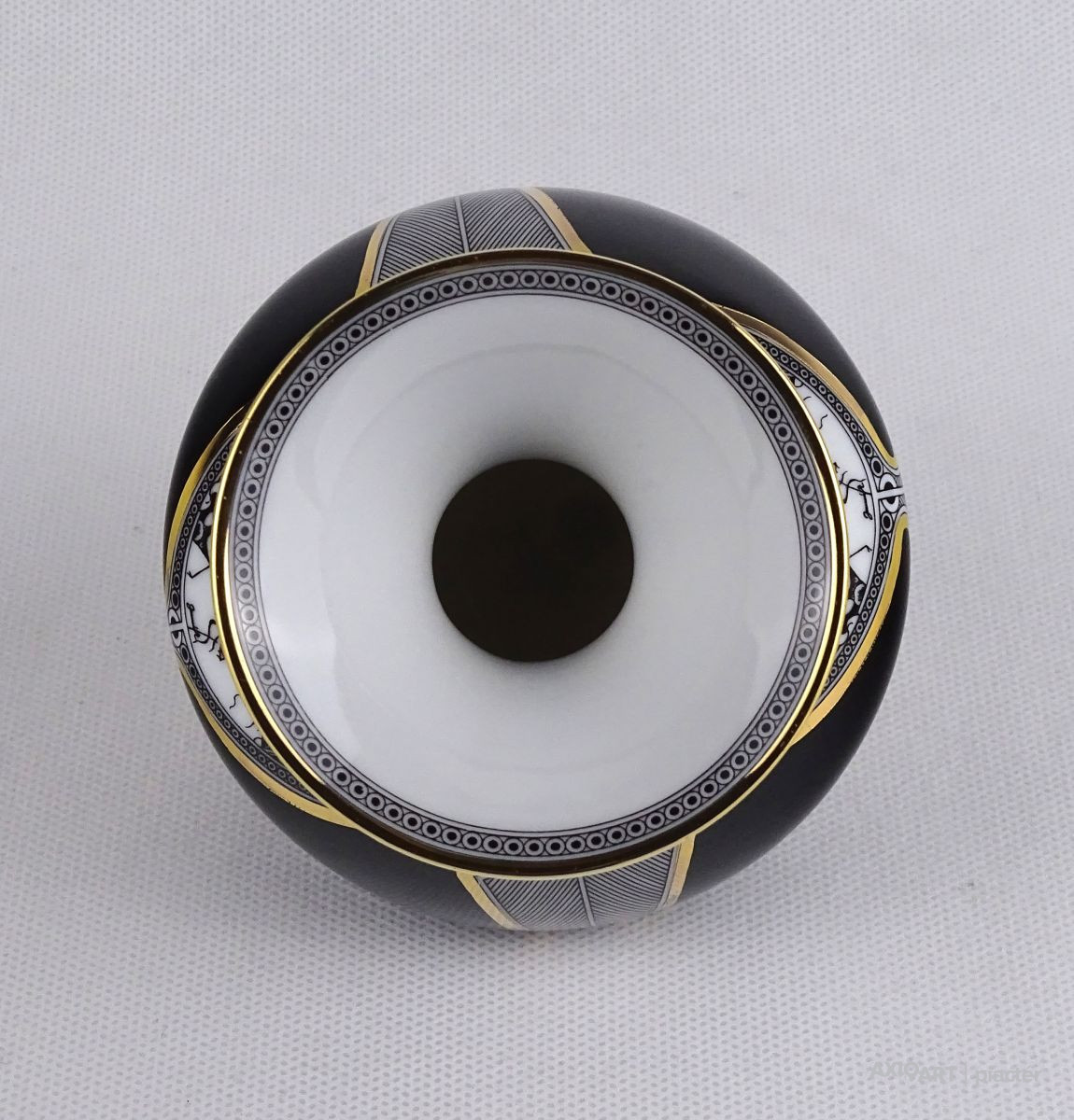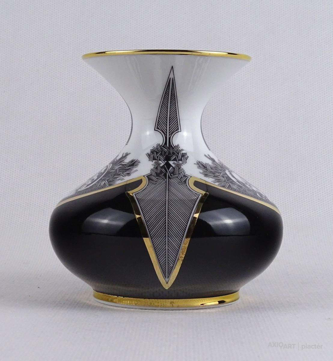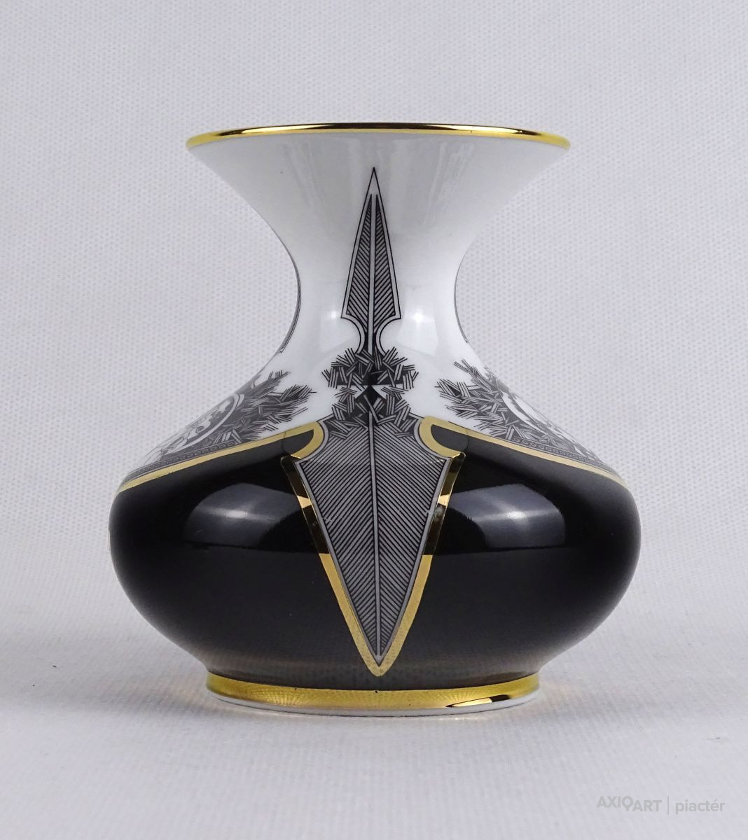 Hibátlan állapotú, jelzett, arannyal gazdagon díszített, fekete-fehér asztali dísz váza.