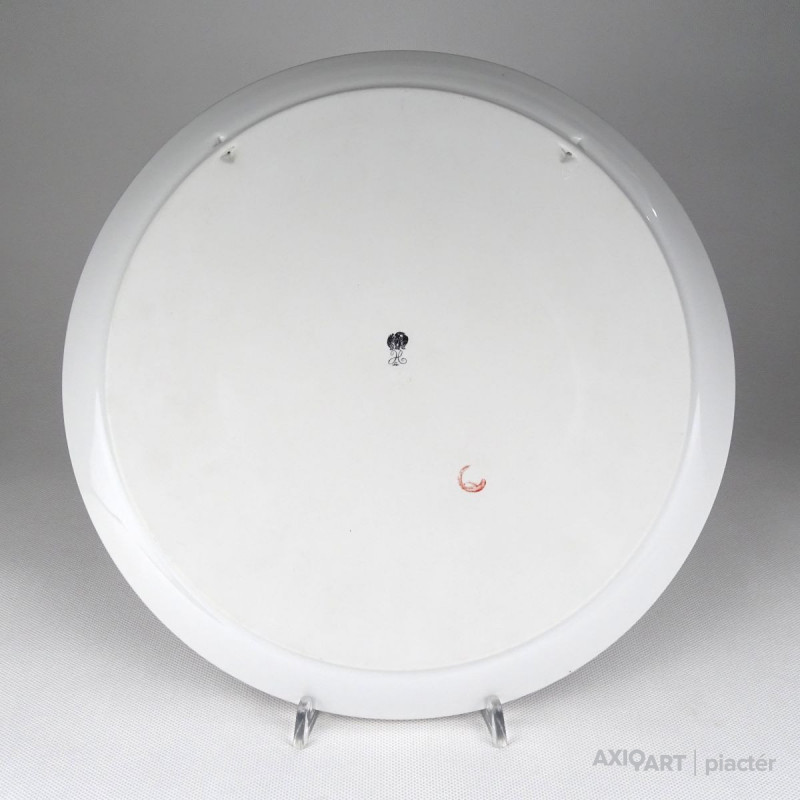 [1R833/Z022] Hibátlan állapotú nagy méretű porcelán fali dísztál, dísztányér.Oldalán körben vastagon aranyozott. A tányéron Szász Endre által készített motívum látható. Alján I. osztályú Hollóházi madaras márkajelzés és szignó található. Ez a jelzés 1979-1980 között volt használatban. A díszítő motívumok között Szász Endre szignója is megtalálható. Szélesség: 31 cm Súly: 0.95 kg   A váza magassága 20 cm. Átmérője 9 cm.