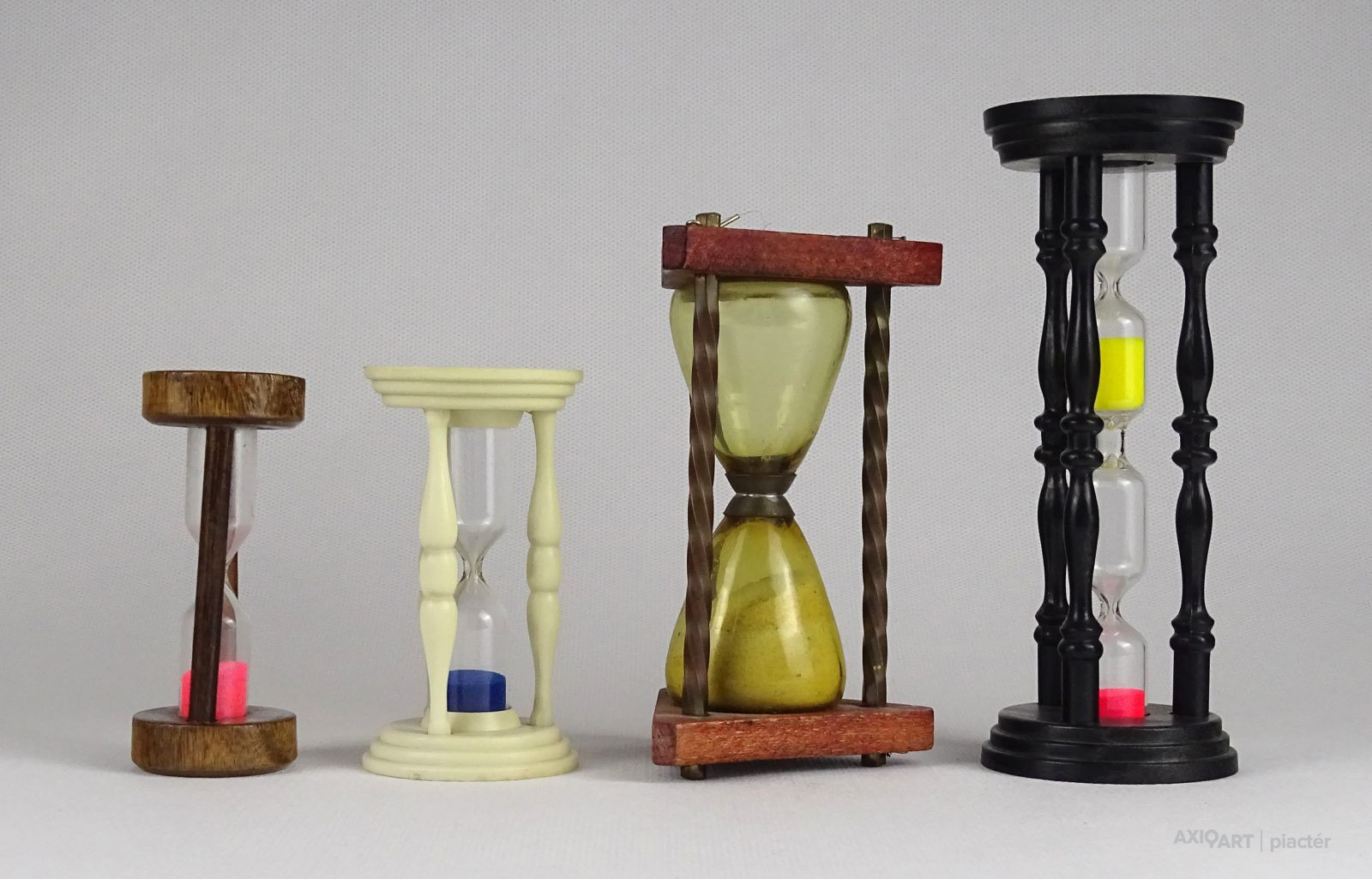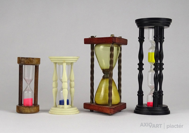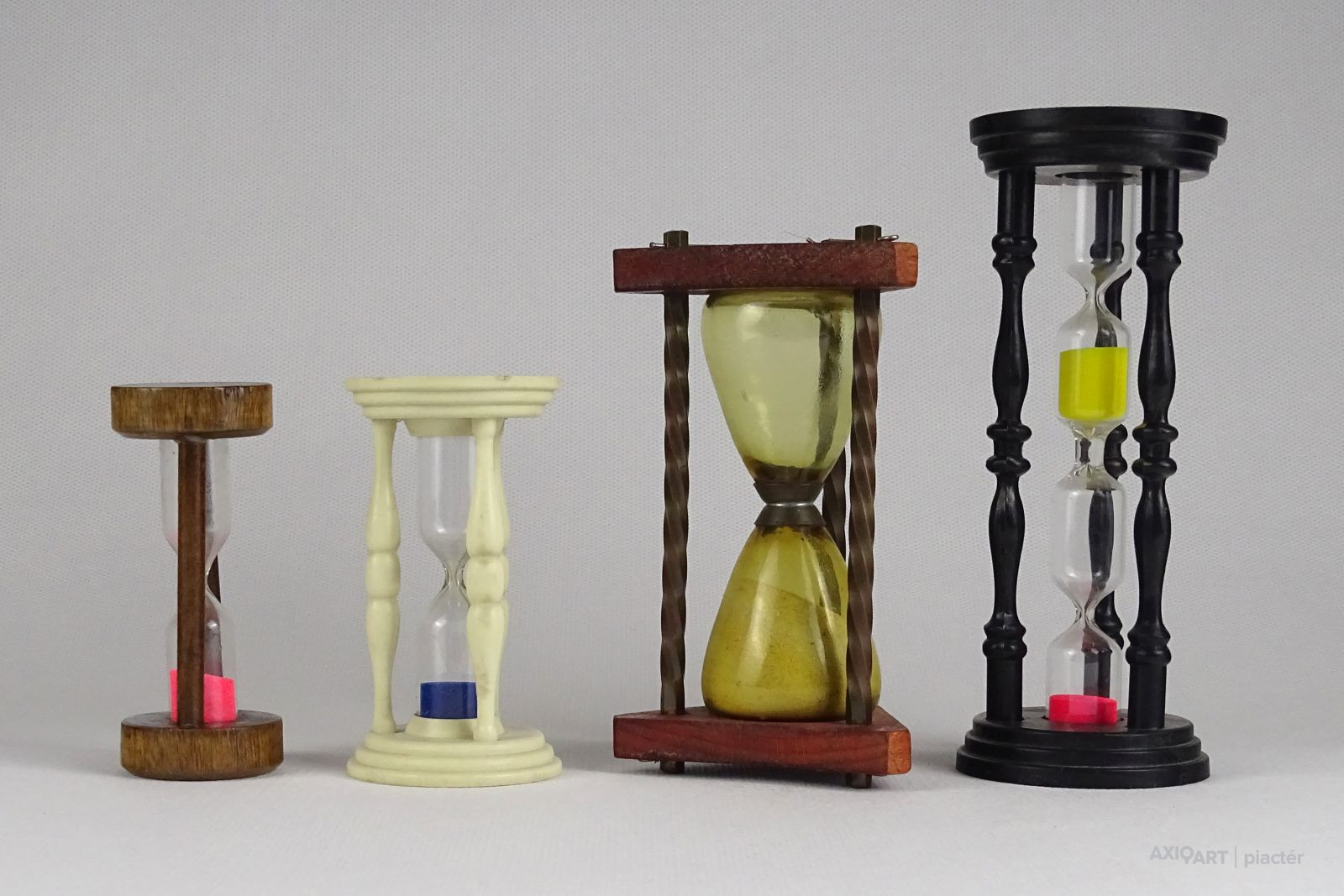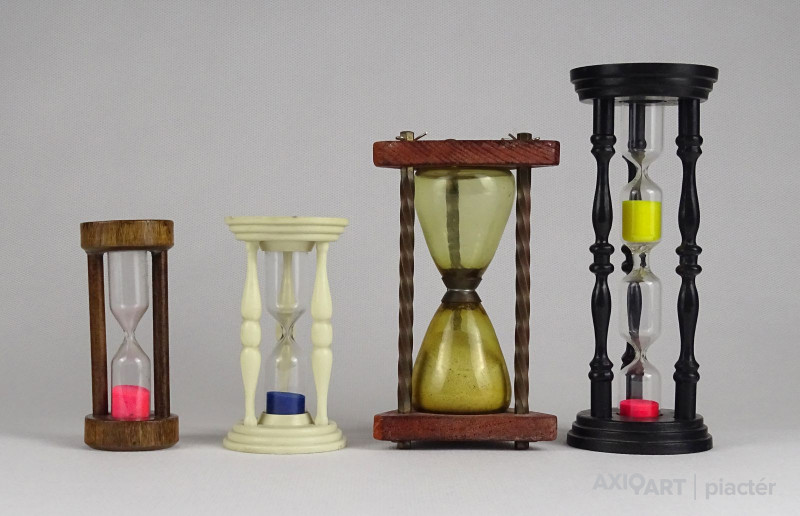 [1S599/X210] 25% ÁRENGEDMÉNY MINDEN TERMÉKÜNKRE Dec. 15-ig Öt darab homokóra: - 1 darab fehér műanyag homokóra (8.5 x 4.5 cm) Lefutási idő: ~2'50" - 1 darab fa keretes kék homokóra (8.3 x 3.5 cm) Lefutási idő: ~2'45" - 1 darab háromszög alakú talpon álló fa keretes homokóra (11.5 x 6 cm) Lefutási idő: ~3'25" - 1 darab nagy méretű fekete műanyag keretes dupla homokóra (14.3 x 5.5 cm) Lefutási idő: ~0'55" és 2'55" Súly: 0.495 kg