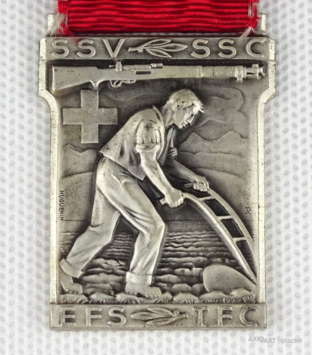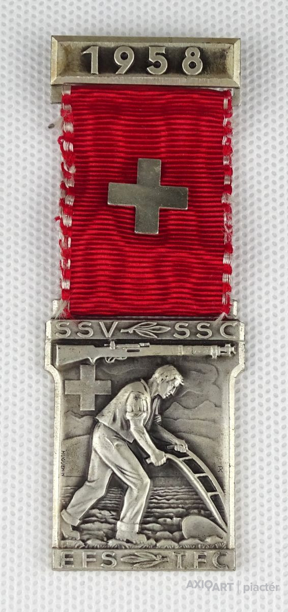 [1Q703/X024/19] Szép állapotú svájci lövész kitüntetés. Emlék adomány. Feliratok az elején: 1958 SSV SSC EFS TFC Jelzés: HUGUENIN R Hátoldalán felirat: DER WEHRHAFTE SCHWEIZER AN DER ARBEIT LA SUISSE AU TRAVAIL LA SVIZZERA AL LAVORO Jelzés: HUGUENIN LOCLE Szélesség: 3.3 cm Hosszúság: 9.3 cm Súly: 0.03 kg   A mi történelmünk 1868-ban a fiatal metsző, Fritz Huguenin és testvére, Guillocheur Albert egy kis óraház-tervező műhelyt hozott létre. Nem sokkal később felismerték, hogy a dombornyomás milyen értéket adhat munkájukhoz. Ezért vásároltak egy orsóprést, amelyre 1888-ban domborították ki első érmüket. Az idő múlásával a Huguenin fivérek a Niel-módszerre specializálódtak, amellyel az ezüst órákat fekete színben részesítik. Ezzel a módszerrel világszerte ismertté váltak, és újdonsült sikerük eredményeként 1899-ben áttértek a kézi gyártásról az ipari termelésre, felépítették a ma is használt gyárat Le Locle-ban. Ezzel egy időben három fiuk átvette a céget, és új termékekkel, például lövészdíszekkel bővítették a palettát. A vállalatot súlyosan érintette az első világháború és az 1930-as évek pénzügyi válsága, amelynek következtében az ezüst zsebórákat rozsdamentes acél karórák váltották fel. Ennek eredményeként 1934-ben részvénytársasággá vált, és az azt követő években a Huguenin Frères et Cie SA jelentős növekedésnek örvendett az óratokok és érmek területén. A századik évforduló alkalmából 1968-ban a cég új nevet kapott. A Huguenin család harmadik generációjának egy tagja vezette, az újjáéledt Huguenin Médailleurs SA újult magabiztossággal és lendülettel lépett be a második századába. 1992-ben Huguenin megkezdte az első színes érmék verését és értékesítését. A neuchâteli Kramer céggel 1999-ben történt egyesülés után a Huguenin + Kramer 2002-ben egyesítette erőit a Faude céggel, így megszületett a Faude & Huguenin SA.                                             Forrás: http://www.huguenin.ch/en/about-us/history