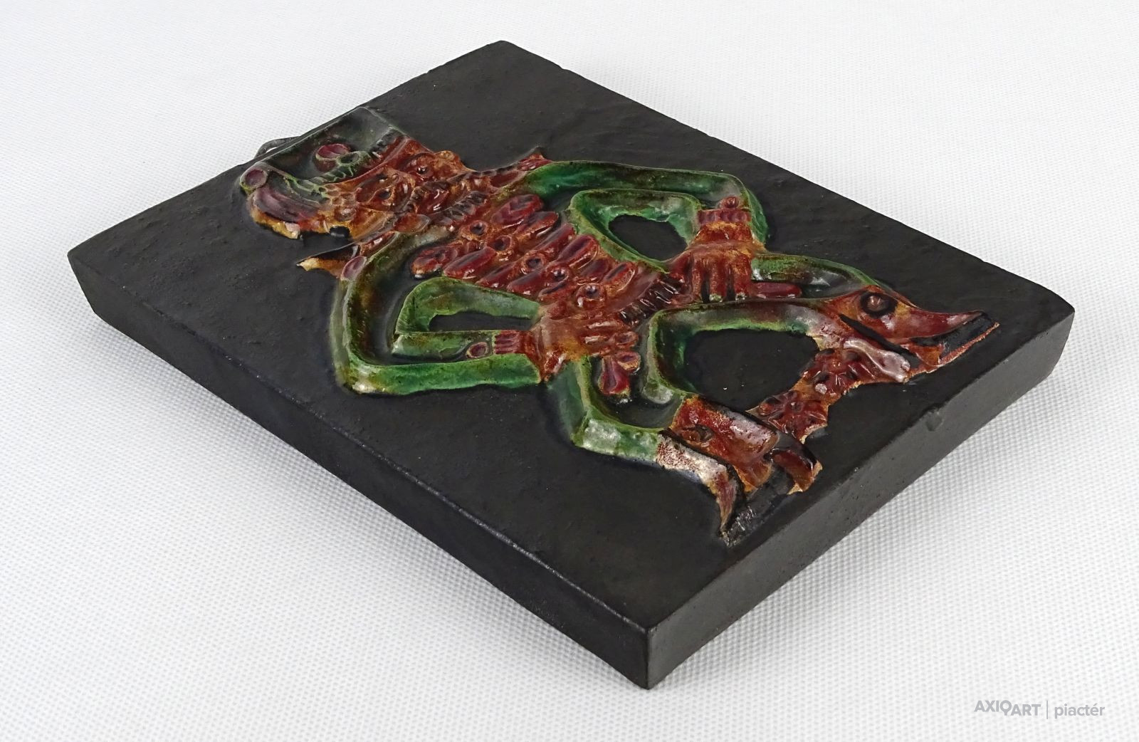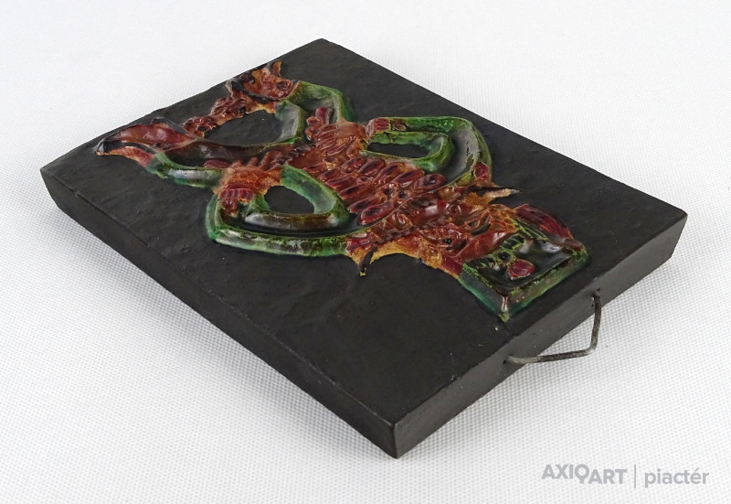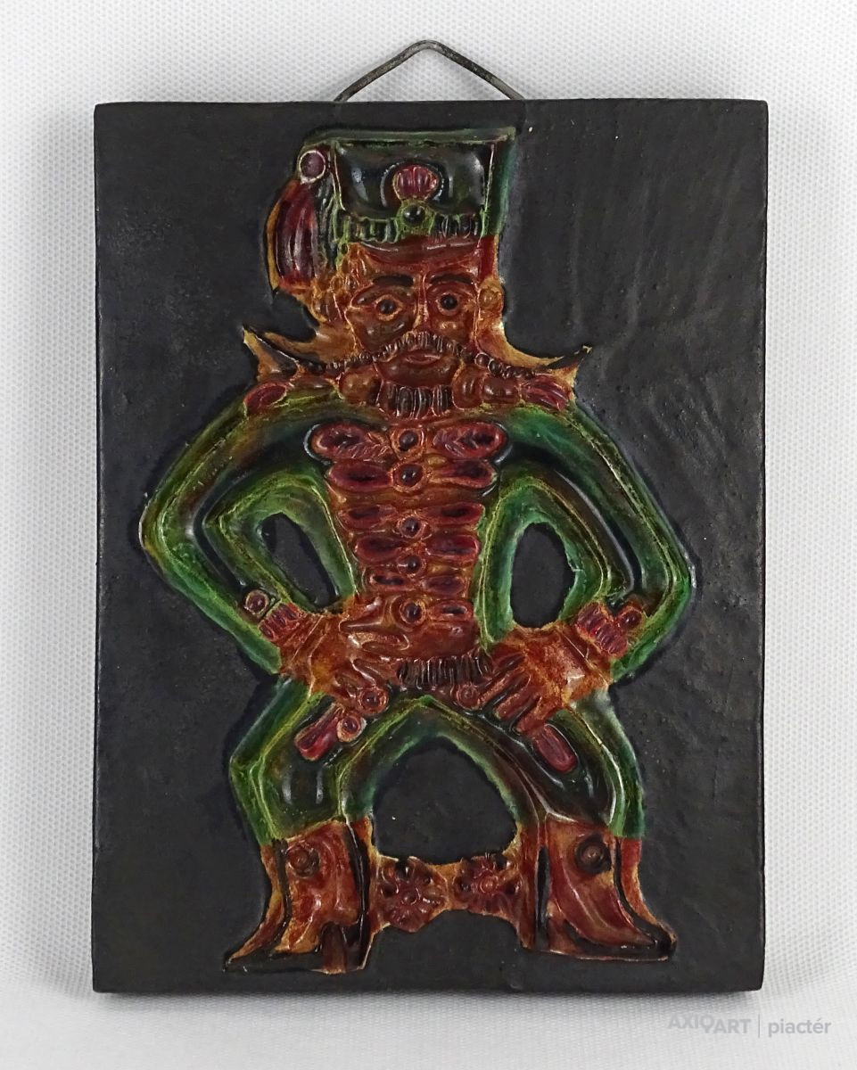 Hibátlan állapotú, kortárs iparművészeti alkotás, falra akasztási lehetőséggel. Fekete alapmázon zöld és barna mázas plasztikus huszár figura.