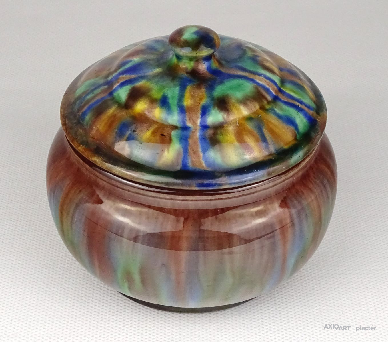 Hibátlan állapotú, jelzett, kis méretű fedeles mázas art deco kerámia bonbonier. Fedele pereme profi restaurátor által javított.