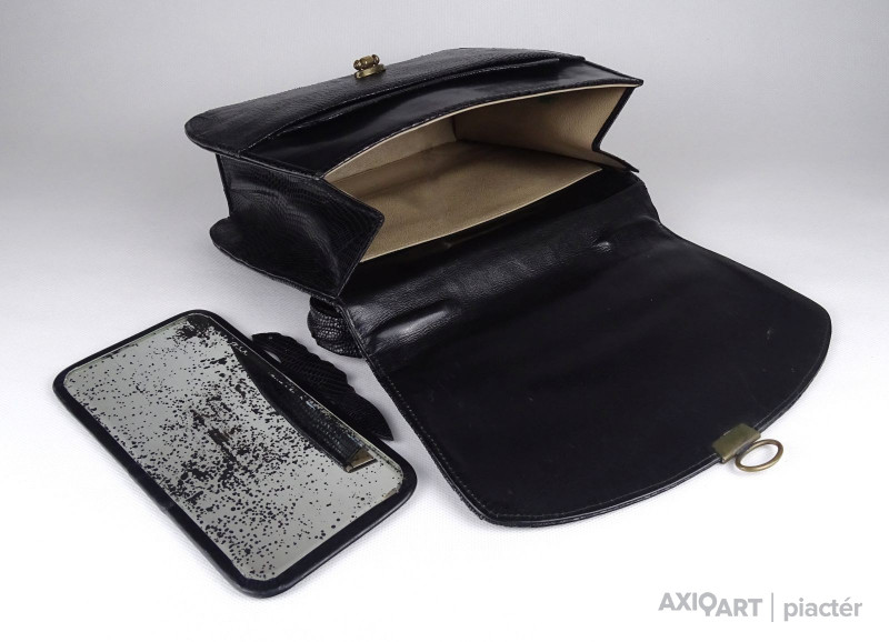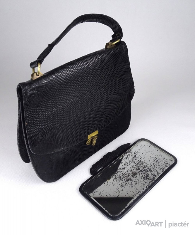 Gyönyörű igényes réz csatos, valódi bőrből készült kígyóbőr női színházi táska, retikül, koktéltáska. Belsejében több tároló, kivehető tükör található. Füle kissé viseltes, javítható.