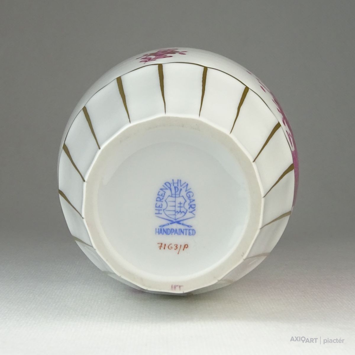 [0Q412/BX-8] Hibátlan állapotú, lila indiai kosaras mintával díszített (Fleurs des Indes) Herendi porcelán váza. Alján kék Herendi jelzés: HEREND HUNGARY HANDPAINTED Formaszám pirossal: 7163/P Mélynyomással: HEREND Aranyozása is kopásmentes, ajándékba adható! Magasság: 19.5 cm Szélesség: 9.5 cm Súly: 0.424 kg