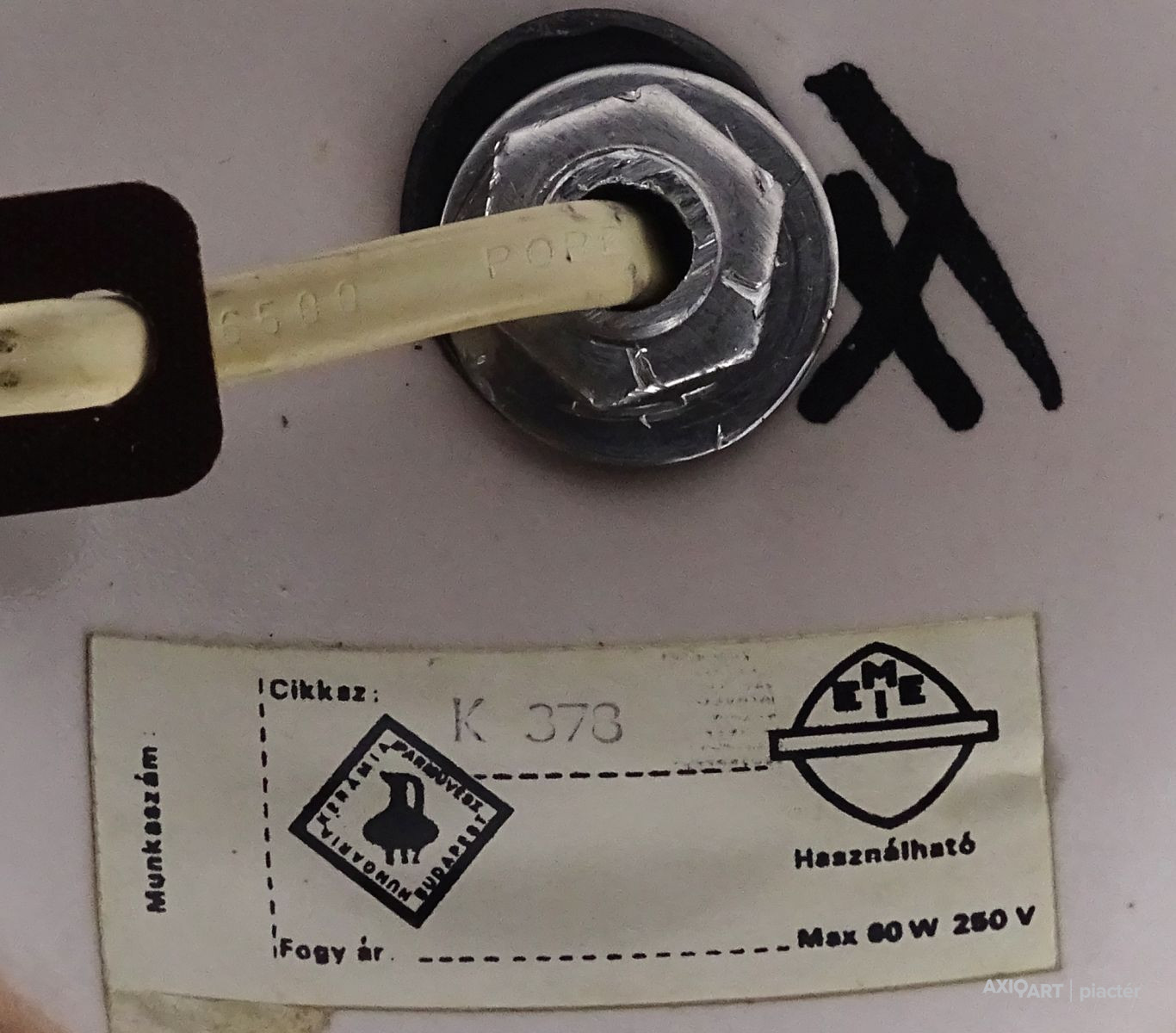 Alján jelzés és címke, rajta felirat: