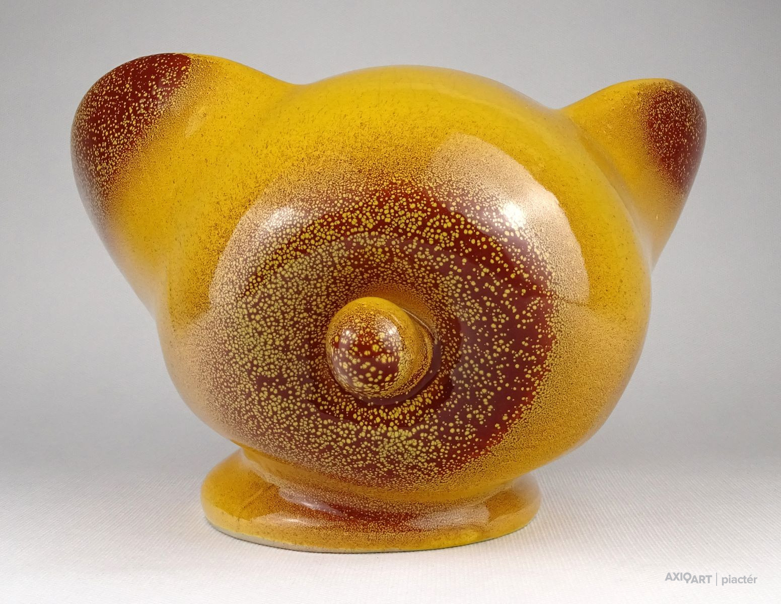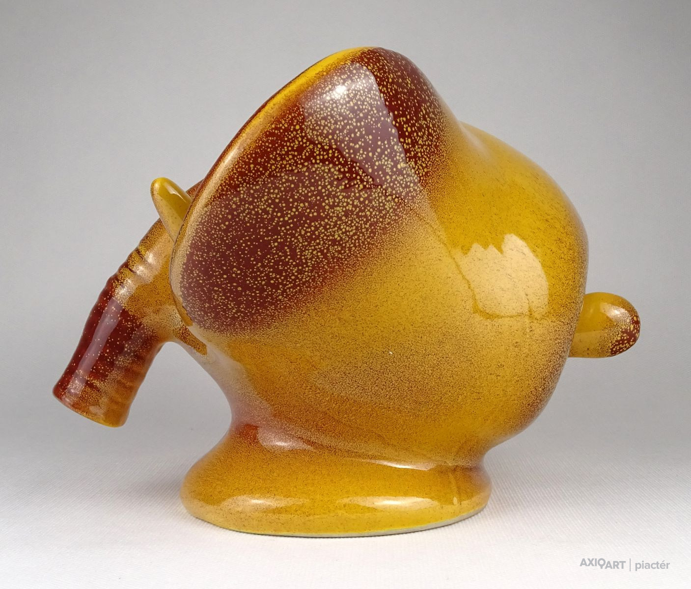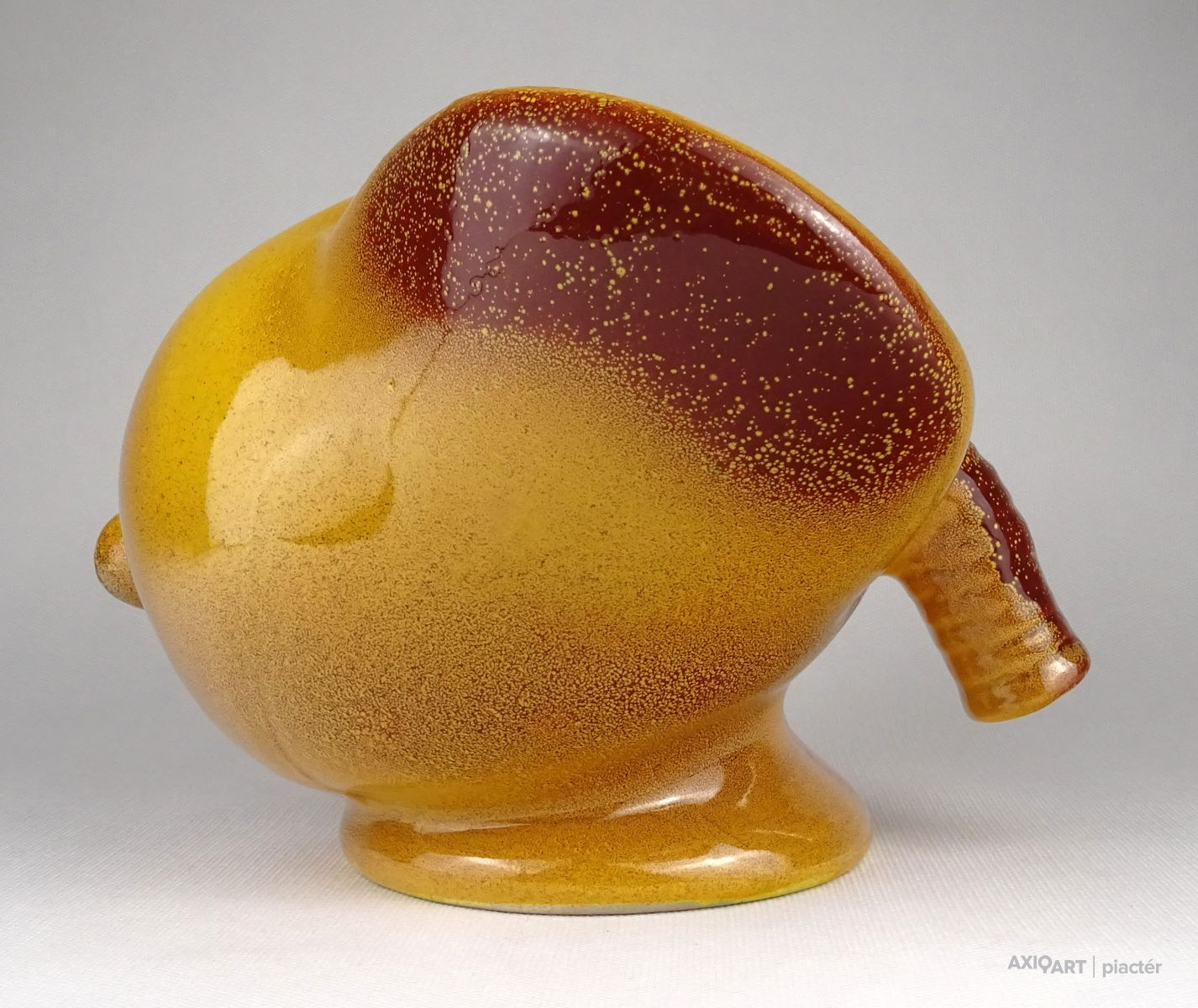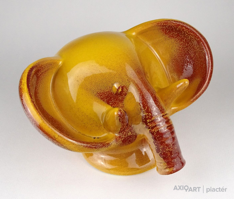 [1O510/X079] Mázas kerámia elefánt, elefánt fej. Hibátlan állapotú kerámia elefánt dísztárgy. Magasság: 16 cm Szélesség: 21.5 cm Hosszúság: 23.5 cm Súly: 1.015 kg Morvay Zsuzsa keramikus Budapest, 1946-05-11 Szerző: Faludy Judit Autodidakta. 1983: díszítő kerámia I. díj, Világkiállítás, Párizs; 1998: a Magyar Köztársaság érdemkeresztje. 1988-ban munkáiból galériát nyitottak Darmstadtban. Öt évig Németországban, majd Dél-Afrikában dolgozott, jelenleg Spanyolországban él, de rendszeresen kiállít Magyarországon is. Munkáit a kék-zöld színvilág jellemzi, figurális kompozícióin embereket és állatokat egyaránt ábrázol. Irodalom VADAS J.: Kiállítási jegyzet, Élet és Irodalom, 1973/38. Two Potters. ~, Gádor István, New Hungarian Quarterly, 1974/11. RÖSICKE, K.: Für Nürnberg ein "Schamnkerl": Ungarische Kunst, Daily News, 1981/7. Égetett órák, Ország-Világ, 1988. június 15. WIESER, R.: Saisoneröffnung begleitet von brüntender Hitze!, NŐ, 1989/28. Rhapsodie in blue, Votre Maison, 1990. augusztus-szept. kerámiavilága, Reform, 1992. január 9 TÖRZSÖK M.: Hetyke mesék, Reform, 1996. december 10. Egyéni kiállítások Egyéni kiállítások 1974 • Thermal Hotel, Margitsziget • Budapesti Műszaki Egyetem, Budapest 1976 • Termal Hotel, Hévíz • Balatonboglári Kápolna 1978 • Kalocsa • Tatabánya 1986 • Tavaszi Fesztivál, Budapest • Gulácsy Terem, Szeged 1991 • Csók Galéria, Budapest • Dehnberg (D) 1996 • Fokváros Elisabeth (Dél-Afrika) 1998 • Marbella, Malaga (SP).   Forrás: artportal.hu