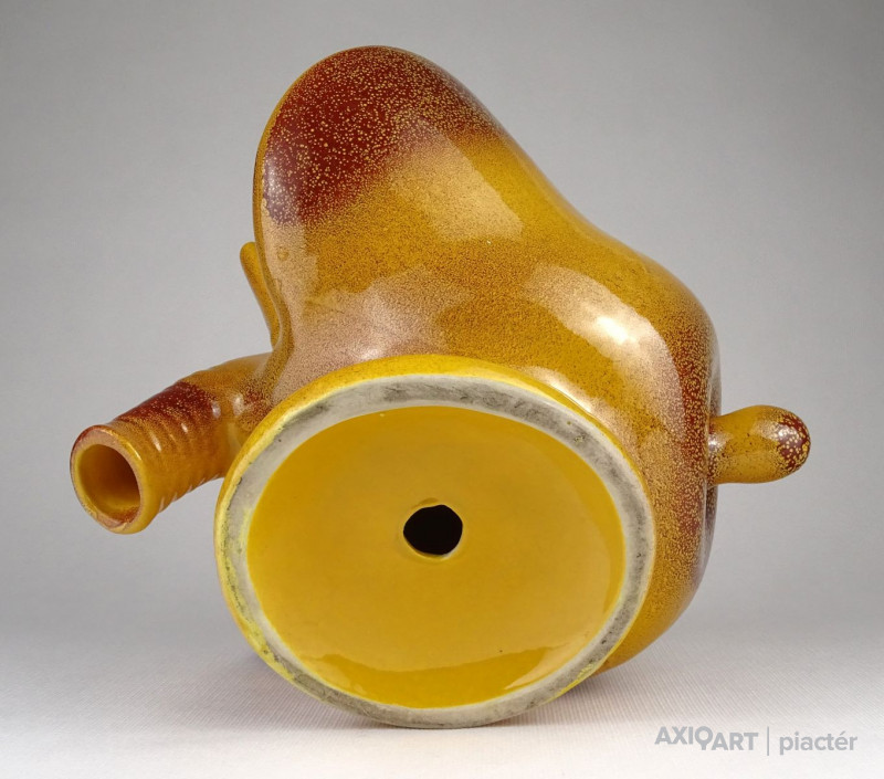 [1M055/X305] Retro hibátlan állapotú iparművészeti kerámia váza, díszváza. Alján jelzés: B. VÁRDEÁK Alján zsűri címke, rajta felirat: IPARMŰVÉSZETI VÁLLALAT ZSŰRISZÁM: 108154 69-995 Magasság: 10.5 cm Szélesség: 6.5 cm Hosszúság: 10.5 cm Súly: 0.35 kg B.Várdeák Ildikó keramikus Abony, 1929-05-13 Névváltozat: Bődy Oszkárné 1953-ban diplomázott a Magyar Iparművészeti Főiskolán Gádor István és Borsos Miklós növendékeként. 1971-ben és 1972-ben részt vett a Siklósi Kerámia Szimpóziumon. 1979: Faenza, aranyérem [Bődy Oszkárral]; 1980: Patikaedény-kiállítás, aranyérem, Gualdo Tadino. Kezdetben porcelán- és kerámiaedények tervezésével, kivitelezésével foglalkozott, majd kerti plasztikákat készített samottos agyagból. Jelenleg cserépkályhát, kandallót tervez és kivitelez, valamint régi épületkerámiák restaurálásával foglalkozik. Irodalom Mai magyar iparművészet. Kerámia, porcelán, üveg, Budapest, 1975. Egyéni kiállítások Egyéni kiállítások 1971 • Népház, Budapest-Óbuda 1980 • Faipari Szakiskola, Budapest 1992 • Angelika Cukrászda, Budapest. Válogatott csoportos kiállítások Válogatott csoportos kiállítások 1955 • Fiatal Iparművészek Kiállítása, Ernst Múzeum, Budapest 1955, 1959, 1965 • 2., 4., 5. Országos Iparművészeti kiállítás, Műcsarnok, Budapest 1958 • Magyar Iparművészek Kiállítása, Világkiállítás, Brüsszel 1959 • Magyar Képzőművésznők II. kiállítása, Műcsarnok, Budapest 1960 • Képzőművésznők nemzetközi kiállítása, Műcsarnok, Budapest 1963 • Modern magyar kerámia, Royal Festival Hall, London 1966 • Gádor István és tanítványai kiállítása, Ernst Múzeum, Budapest 1967 • Kerámia kiállítás, Vármúzeum, Siklós 1968, 1972, 1975, 1978, 1980 • I., III-VI. Országos Kerámia Biennálé, Pécs 1968, 1972, 1977, 1979 • Nemzetközi Kerámia Kiállítás, Faenza 1971, 1972 • Kerámia Szimpozion, Siklós 1972 • Edénykultúra, Műcsarnok, Budapest 1974 • Mai Magyar Iparművészet II., Iparművészeti Múzeum, Budapest 1975 • Jubileumi Iparművészeti Kiállítás, Műcsarnok, Budapest 1979 • Nemzetközi Kerámia Kiállítás, Sopot 1980 • Művészek az üzemekben, Magyar Nemzeti Galéria, Budapest 1982 • Magyar Kerámia, Palazzo delle Esposizione, Faenza 1983 • Nemzetközi Kerámia Kiállítás, Perugia – Gualdo Tadino 1995 • XX. századi magyar keramikusok. Válogatás az Iparművészeti Múzeum gyűjteményéből, Iparművészeti Múzeum, Budapest 1998 • In Memoriam Tornyai, Tornyai János Múzeum, Hódmezővásárhely 1998 • Őszi kerámia kiállítás, Palme Ház, Budapest Művek közgyűjteményekben Művek közgyűjteményekben Forrás: artportal.hu