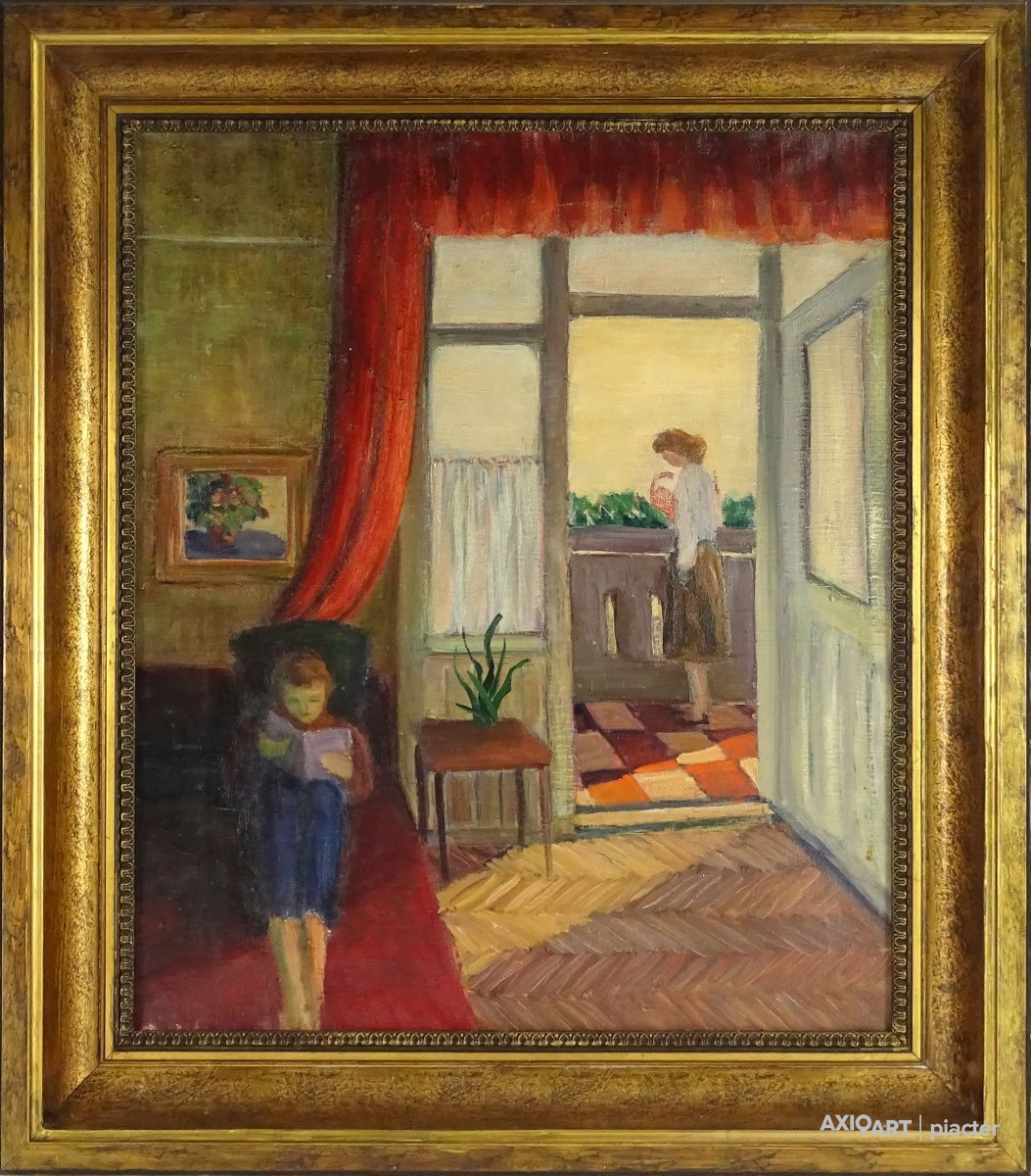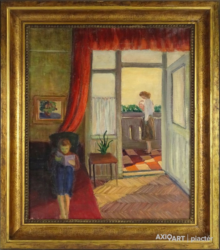 [1Y034/Z018] Olaj vászon festmény, üveglap mögött, szép állapotú képcsarnokos keretben. Akasztási lehetőséggel rendelkezik. Jelezve jobbra lent: Balog A. Hátoldalán a kereten Képcsarnok Vállalat címke töredék látható, rajta felirat: A művészeti alkotás címe: LEÁNY Magasság: 86 cm Szélesség: 66 cm Súly: 5.37 kg Balogh András (képei szignóján az 1960-as évektől Balog) (Budapest, 1919. március 14. — Budapest, 1992. március 18.) festőművész, kerttervező, művészeti szakíró, c. egyetemi tanár. Életpályája és munkássága Apai ágon a géresi Baloghok Szatmár megyéből a dél-erdélyi Alsó-Fehér megyébe származtak, anyai fölmenői a Székelyföldön: Csíkban, ill. Háromszéken éltek. Szülei az 1900-as évek elején költöztek Budapestre. A Képzőművészeti Főiskolán 1937-ben kezdte meg tanulmányait Burghardt Rezső tanítványaként. 1950-töl 1980-ig a Kertészeti Főiskolán (később Kertészeti Egyetem) tanított a kerttervezési tanszéken művészettörténetet, szabadkézi rajzot, ábrázoló geometriát és kertesztétikát. Az Iparművészeti Főiskolán óraadóként kertesztétikát adott elő. 1971-ben részt vett a firenzei Palazzo Strozziban rendezett biennálén, ahol aranyéremmel tüntették ki. Rendszeres önálló és csoportos kiállítások sora következett ezután nemcsak Magyarországon, hanem Olaszország és Németország számtalan városában, kiállított Finnországban, Kanadában is. Egyéni kiállításai gyakran katalógusokkal jelentek meg.[1][2][3] Nyaranként Tihanyban vagy Zsennyén alkotott. Festészetét poétikus realizmus jellemzi, dekoratív elrendezésű kompozíciói és lágy színvilága bensőséges hangulatot, szépséget, harmóniát árasztanak. (Lány egyszarvúval; Alvó, Emberpár és táj, stb.) Nagyon sok tájképet és portrét festett, történelmi személyiségekről is, 1978 és 1989 közt megfestette Mindszenty József bíboros portréját. Képei a Magyar Nemzeti Galériában, vidéki múzeumainkban, olasz, német, finn, észak-amerikai, kanadai, ausztráliai gyűjteményekben vannak.