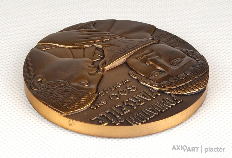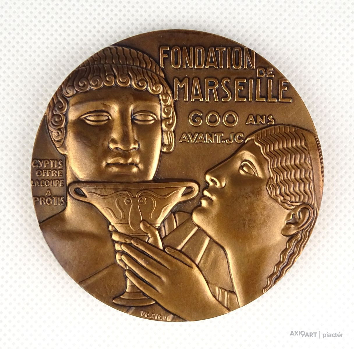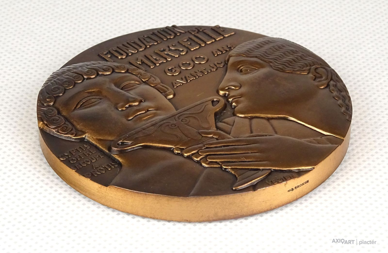[1F997/X043] Eredeti tokjában található feliratos, kétoldalas, bronz plakett, emlékplakett. Feliratok: FONDATION DE MARSEILLE 600 ANS AVANT. JC. GYPTIS OFFRE LA COUPE A PROTIS FACULTÉ DE MÉDECINE DE MARSEILLE H.D. Jelzés: VEZIEN BRONZE A doboz beelsejében felirat: MONNAIE DE PARIS Súly: 0.26 kg