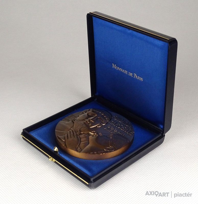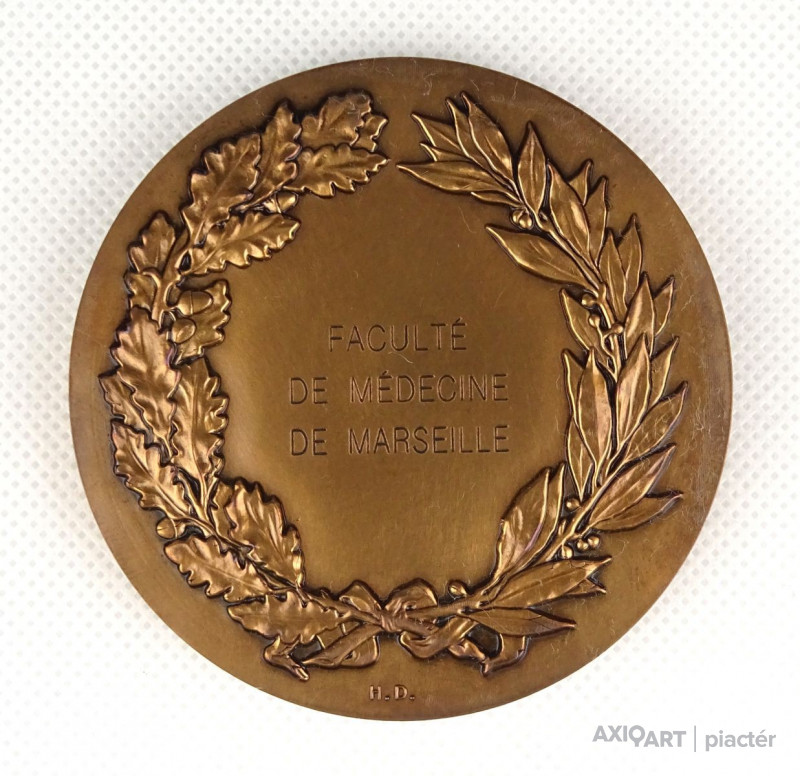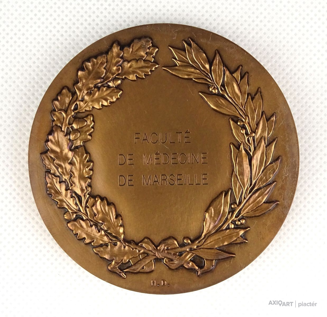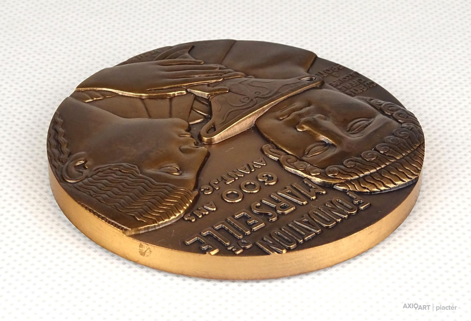[1F997/X043] Eredeti tokjában található feliratos, kétoldalas, bronz plakett, emlékplakett. Feliratok: FONDATION DE MARSEILLE 600 ANS AVANT. JC. GYPTIS OFFRE LA COUPE A PROTIS FACULTÉ DE MÉDECINE DE MARSEILLE H.D. Jelzés: VEZIEN BRONZE A doboz beelsejében felirat: MONNAIE DE PARIS Súly: 0.26 kg