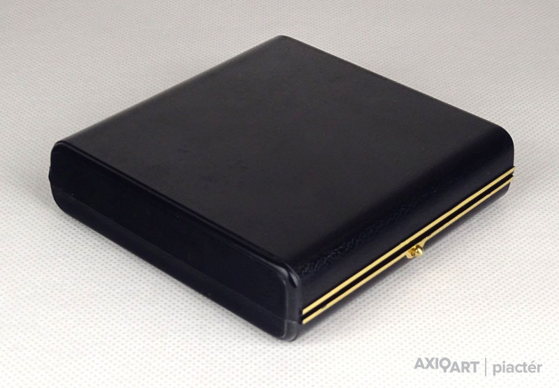 [1I390/X026] Hibátlan állapotú, jelzett bronz plakett szép bőrdíszműves bőr tokban. Elején plasztikus virágdíszítés mellett jelzés: KL Hátoldalán felirat: A KISZ. KIVÁLÓ PROPAGANDISTÁJA Súly: 0.485 kg Kutas László szobrász Budapest, 1936-04-17 Szerző: Matits Ferenc Gimnazistaként Sopronban Ágoston Ernő szabadiskolájában sajátította el a rajzművészet alapismereteit, majd 1954 és 1960 között a Magyar Képzőművészeti Főiskolára járt, ahol Gyenes Tamás és Pátzay Pál voltak a mesterei. Érzékletes mintázás, jó formaérzék, szellemes komponálás, választékos anyaghasználat tünteti ki plasztikai működését. A realista hagyományokra épülő, egyéni stílusát tükröző kő és bronz köztéri szobrokon kívül narratív kisplasztikákat, érmeket készít. A Magyar Nemzeti Bank pályázatain 11 alkalommal nyert emlékpénz készítésére megbízást. A firenzei Giorgio Vasari Nemzetközi emlékérem pályázaton 1974-ben I. díjat kapott, a Sportérem pályázaton 1975-ben II. és III. díjat, az Ezüstgerely pályázaton 1976-ban különdíjat érdemelt ki. 1979-ben a ravennai Dante Biennálé ezüst érmét, 1991-ben és 1995-ben pedig a soproni Országos Éremművészeti Biennálén Roisz Vilmos-díjat nyert. 1990 óta zsűritag a Ravennai Kisplasztikai Dante Biennálén. Figurális kisplasztikái egy-egy történetet mesélnek el. Az alakok kifejező megmintázása, környezetbe helyezése, dinamikus megfogalmazása elgondolkodásra késztetnek. Alkotásai népszerűek a hazai, valamint külföldi gyűjtők körében és szereztek a művésznek világhírnevet. Irodalom (kat. bev., Országos Széchenyi Könyvtár Galéria, 1994) ESZES A.: Otthon útközben. Műteremlátogatás ~nál, Anna, 1994/7. KOVÁCS P.: A tegnap szobrai, Szombathely, 1992 VEKERDY T.: ~ és szobrai, Várhely, 1997/3. Film BAYER I.: Művészportré, Civil Kurázsi Műsor, MTV, 1994-5. Egyéni kiállítások Egyéni kiállítások 1976 • Festőterem, Sopron • Haydn Művelődési Ház, Fertőd 1983 • Bank für Gemeinwirtschaft, Regensburg • Haydn Művelődési Ház, Fertőd • Munkás Művelődési Központ, Paks 1990 • Galerie Meerbusch, Düsseldorf 1993 • Városi Kórház Galéria, Grevenbroich (D) • Galerie Greve, Hamburg 1996 • G. P. Breughel, Venlo (gyűjt.) 1998 • Galéria, Tamási. Válogatott csoportos kiállítások Válogatott csoportos kiállítások Őszi Tárlatoknak és 1977-1999 • Országos Éremművészeti Biennáléknak. 1977-től vett részt a FIDEM nemzetközi kiállításain. A ravennai Dante Biennálén1975-ben, 1977-ben és 1979-ben vett részt. 1964 • Vásárhelyi Tárlatok 1954-1963, Magyar Nemzeti Galéria, Budapest 1968 • Az új Kecskeméti Művésztelep, Katona József Múzeum, Kecskemét 1970 • Kiállítás a Szakszervezetek Országos Tanácsa képzőművészeti pályázatára érkezett alkotásokból, Magyar Nemzeti Galéria, Budapest 1972 • 6. Balatoni Nyári Tárlat, Balatoni Múzeum, Keszthely 1974 • Vásárhelyi Tárlatok 1964-1973, Magyar Nemzeti Galéria, Budapest • G. Vasari nemzetközi Érembiennálé, Firenze 1976 • Balatoni Nyári Tárlat, Balatoni Múzeum, Keszthely 1979 • VI. Országos Kisplasztikai Biennálé, Pécs 1982 • Magyar mesterek, G. P. Breughel, Amszterdam 1990 • Ágoston Ernő tanítványai, Villamosipari Szakközépiskola Galéria, Sopron 1991 • Soproni Képes Céh Kiállítás, Collegium Hungaricum, Bécs • Soproni Képes Céh Kiállítás,Lajtaújfalu [Potzneusiedl] 1992 • Képes Céh Kiállítás, Lábasház, Sopron 1995 • Névjegy-érem kiállítás, OTP Galéria, Budapest 1996 • Képes Céh Kiállítás, Lábasház, Sopron. Művek közgyűjteményekben Művek közgyűjteményekben Királyi Éremtár, Stockholm Liszt Ferenc Múzeum, Sopron Városháza Gyűjteménye, Firenze Windsor Palota Gyűjteménye.  Forrás: artportal.hu