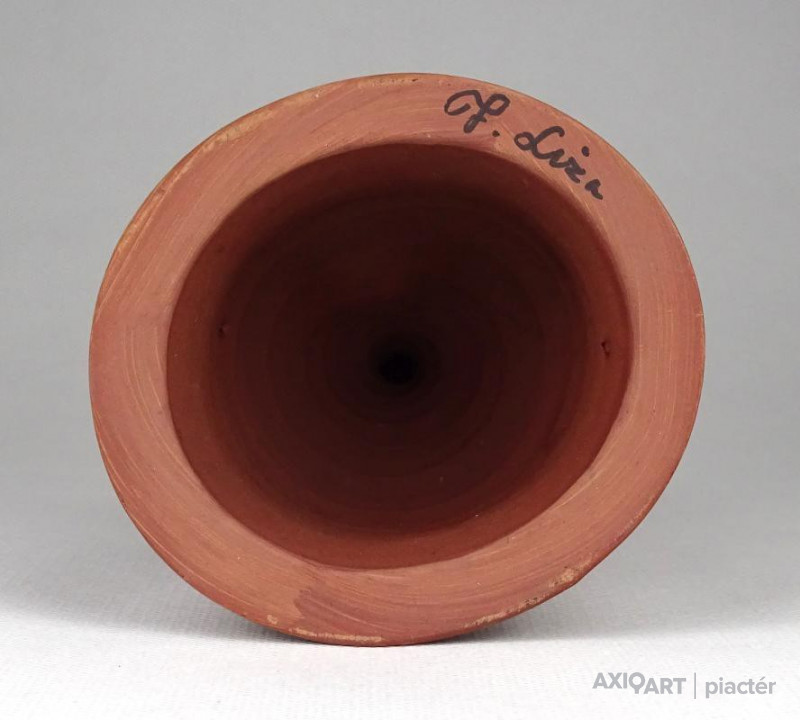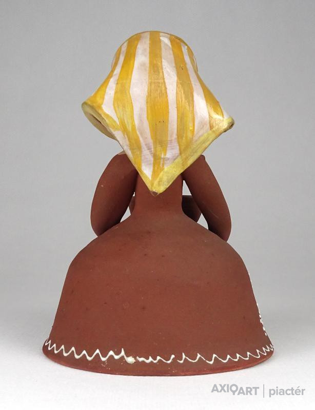 [0U704/BX-9] Hibátlan állapotú, jelzett, háromalakos kerámia figurális mécsestartó figura. Jelzés: KISS ROÓZ Magasság: 19 cm Szélesség: 6 cm Hosszúság: 16 cm Súly: 0.639 kg Kiss Roóz Ilona keramikus Születési hely: Szatmárnémeti [Satu Mare, RO] Születési dátum: 1920 Kiállítások az adatbázisban:  Kiss Roóz Ilona életműkiállítása Mesterei: Orbán Antal, Ohmann Béla. 1939-43: Iparművészeti Iskola, mesterei: Orbán Antal, Ohmann Béla. 1956, 1962: Munkácsy-díj; 1980: érdemes művész; 1984: SZOT-díj; 1994: MSZOSZ díja; 1995: Magyar Köztársasági Érdemrend Középkeresztje. A magyar kerámia Kovács Margit által teremtett naiv-népies irányzatának jeles művelője. Edényeit, kisplasztikáit, ill. murális alkotásait vidám színvilág és kedves humor jellemzi. 1948 és 1952 között tanított az Iparművészeti Főiskolán, azóta szabadfoglalkozású. Egyéni kiállítások 1966 • Csók Galéria, Budapest 1971 • Csók Galéria, Budapest 1980 • Budavári Ipaművészeti Bolt, Budapest 1984 • Petőfi Művelődési Ház, Tiszaluc 1989 • Kispréposti Palota, Eger (állandó kiállítás) 1992 • Bécs 1995 • Minigaléria, Miskolc 1996 • Petőfi Művelődési Ház, Tiszaluc 1997 • Derkovits Művelődési Központ, Tiszaújváros. Válogatott csoportos kiállítások 1947 • Karácsonyi kiállítás, Budapest • Fővárosi Művelődési Központ 1952 • Iparművészeti kiállítás, Ernst Múzeum, Budapest 1956 • Iparművészeti kiállítás, Iparművészeti Múzeum, Budapest 1958 • Magyar kerámia kiállítás, Vallauris 1959 • Magyar képzőművésznők kiállítása, Ernst Múzeum, Budapest 1959 • IV. Országos Iparművészeti Kiállítás, Műcsarnok, Budapest 1963 • Modern magyar kerámia, Royal Festival Hall, London 1965 • Országos Iparművészeti Kiállítás, Műcsarnok, Budapest 1968, 1970 • I., II. Országos Kerámia Biennálé, Pécs 1973 • Magyar kerámia, Ankara, Isztambul 1975 • Tárgy és alkotója, Iparművészeti Múzeum, Budapest 1982 • Magyar kézműves kerámia, Siklós 1995 • XX. századi magyar keramikusok, Iparművészeti Múzeum, Budapest • Az agyag mesterei, Vigadó Galéria, Budapest 1998 • Őszi Kerámia Kiállítás, Olaf Palme Ház, Budapest Művek közgyűjteményekben Köztéri művei kerámia dombormű (1958, Pereces, bölcsőde) kerámia napóra (1959, Székesfehérvár, Béke téri iskola) csempeburkolat (1961, Szeged, rendelőintézet) falikép (kerámia, 1962, Sopron, Gyermekszanatórium) kerámia falikép (1966, Békéscsaba, bölcsőde) Irodalom GÁL J.: ~ 77 éves. Beszélgetés a művésszel, Magyar Iparművészet, 1997/4. KESZTHELYI K.-LACZKÓ I.: A magyar kerámiaművészet I., Alkotók, adatok 1945-1998, Budapest, 1999. Vadas József + MAOE Forrás: artportal.hu