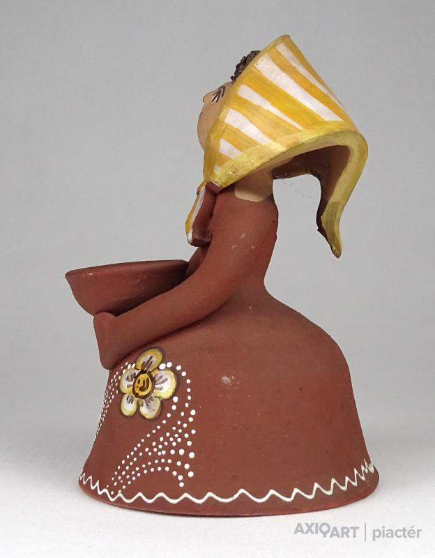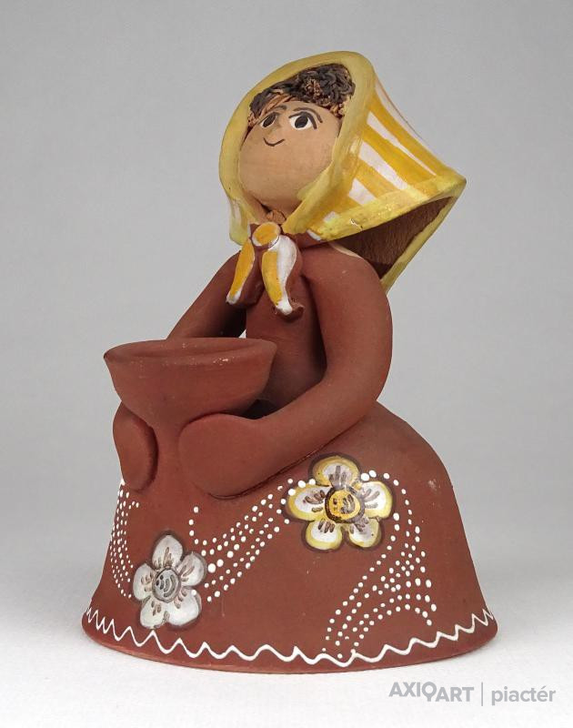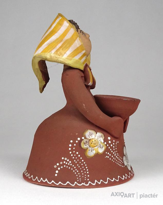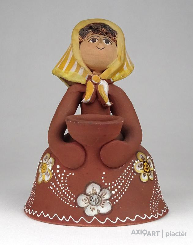 [1K837/X243] Hibátlan állapotú, kézi festéssel díszített fejkendős lány kerámia figura. Kezében tál, gyertyatartóként funkcionálhat. Alján jelzés: J. LIZA Magasság: 14.5 cm Szélesség: 10.3 cm Súly: 0.32 kg Jambrich Liza Keramikus Szigetvár, 1955-06-24 Szerző: Vaszary Emlékház anyaga   Bár részt vett néhány „szakmai” képzésben, pl., elvégezte a pécsi Zsolnai-gyár porcelánfestő iskoláját, úgy tartja, hogy az egyszerű fazekas mesteremberektől tanult igazán. Indíttatása nagyban volt köszönhető a Bakkócán dolgozott Sáfrány Gézának, az Óbányán élt Teimel Istvánnak vagy a kaposvári Tamás Lászlónak. A legnagyobb hatást, egy Marosvásárhelyt született, de Budapesten dolgozó keramikusművész tette Jambrich Lizára: Simó Ágoston munkássága lenyűgözi a mai napig. 17 éves kora óta készíti műveit, amelyek többsége jókedvre deríti a közönséget.   Az ars poeticájáról ennyit mond: „Ha az én bölcsőmbe egy kis tehetséget bele tettek, akkor azoknak az embereknek szeretnék vele segíteni, akik nehezen élnek.” Kaposváron él és alkot.   Válogatott csoportos kiállítások: Több csoportos és egyéni kiállításon szerepelt már munkáival, így többek között Szombathelyen, Kőszegen, Pécsett, Kaposváron. Rendszeresen hívták a szervezők a Művészetek Völgye rendezvényeire. Forrás: artportal.hu