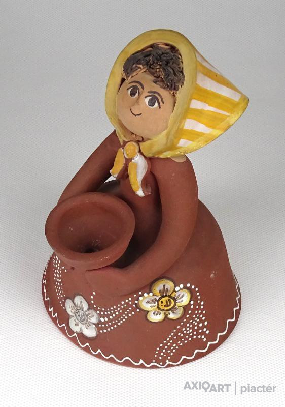 Hibátlan állapotú, kézi festéssel díszített fejkendős lány kerámia figura. Kezében tál, gyertyatartóként funkcionálhat.