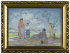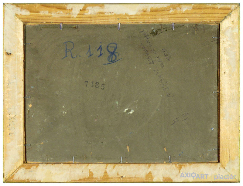 [FK2739/FL-4] A kép mérete: 33 x 48,5 cm keret nélkül. Készült: Olaj, Karton A kép Viski János (Szokolya, 1891, Budapest, 1970) alkotása. Jelezve Jobbra lent "Viski" A festmény jó állapotban van. Keret: Ép Magyar festők és grafikusok életrajzi lexikona I-II. Festő. A budapesti Képzőművészeti Főiskola Rajztanárképző szakán Zemplényi Tivadar növendéke volt. 1912-ben a kecskeméti művésztelep nyári tanfolyamán Olgyai Ferenc és Iványi-Grünwald Béla korrigálta. Tanulmányúton járt Franciaországban. 1913-tól főleg naturalista állatképeket állított ki a budapesti Műcsarnokban és a Nemzeti Szalonban. Számos tájképet is festett. A háború után több évig Dél-Amerikában dolgozott. 1929-től Budapesten tevékenykedett. 1930-ban a Független Művészek Társasága klubjában volt gyűjteményes tárlata. 1934-ben a Műcsarnokban "Hazafelé" című alkotására megkapta a Halmos Izor zsánerdíjat. "Terelés a Hortobágyon" című képének reprodukciója az 1934-es 50 pengős bankjegyet díszítette. Az állat (főleg a ló) karaktere, mozgási formaproblémái, a szabadtéri világítás színhatásai érdekelték impresszionista festőiséggel. Leggyakoribb modellje a ló. Több munkája a Magyar Nemzeti Galéria tulajdona. Művészete a természetből indul ki, annak formáihoz hű marad, képeiből mégis kiérezhető az egyéni temperamentumformáló ereje. (Éber, PZ-SzMF, KM) Magyar festők és grafikusok adattára A Képzőművészeti Főiskolán Zemplényi Tivadar növendéke. Tanulmányutakat tett Franciaországban és Dél-Amerika számos városában. 1913 óta állított ki. Főképpen állatképeket fest, bár témakörében más műfajok is szerepelnek. Az állat karaktere, mozgási és formaproblémái, a szabadtéri világítás színhatásai érdeklik impresszionista festőiséggel. Leggyakoribb modellje a ló. Festészete a természetből indul ki, annak formáihoz hű marad, képeiből mégis kiérezhető az egyéni temperamentumformáló ereje. - Irod:: Pipics Zoltán: Száz magyar festő. Bp. 1943. Magyar festők és grafikusok életrajzi lexikona I-II. Műgyűjtők és kereskedők kézikönyve Festő. A bp.-i Képzőművészeti Főiskolán Zemplényi Tivadar növendéke volt. Tanulmányúton járt Franciaországban. 1913-tól főleg naturalista állatképeket állított ki a Műcsarnokban és a Nemzeti Szalonban. A háború után több évig Dél-Amerikában dolgozott. 1929-től Budapesten tevékenykedett. 1930-ban a Független Művészek Társasága klubjában volt gyűjteményes kiállítása. 1934-ben a Műcsarnokban "Hazafelé" című festményére megkapta a Halmos Izor genreredíjat. "Terelés a Hortobágyon" c. képének reprodukciója az 1934-es 50 pengős bankjegyet díszítette. Az állat karaktere, mozgási formaproblémái, a szabadtéri világítás színhatásai érdekelték impresszionista festőiséggel. Leggyakoribb modellje a ló. Egy képe a MNG tulajdona. Festészete a természetből indul ki, annak formáihoz hű marad, képeiből mégis kiérezhető az egyéni temperamentumformáló ereje. (Éber, PZ-SzMF) Művészeti lexikon I-IV. Festő. A Képzőművészeti Főiskolán Zemplényi Tivadarnál tanult. 1913-tól főleg naturalista állatképeket állított ki a Műcsarnokban és a Nemzeti Szalonban. 1919-29 között D-Amerikában dolgozott. 1933-ban A Független Művészek Társasága klubhelyiségében volt gyűjt. kiállítása. Történelmi témákat is festett: Koppány leveretése (1938), Rákóczi búcsúja (1941). Várakozó kocsi c. képét a Nemz. Gal. őrzi.