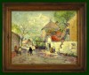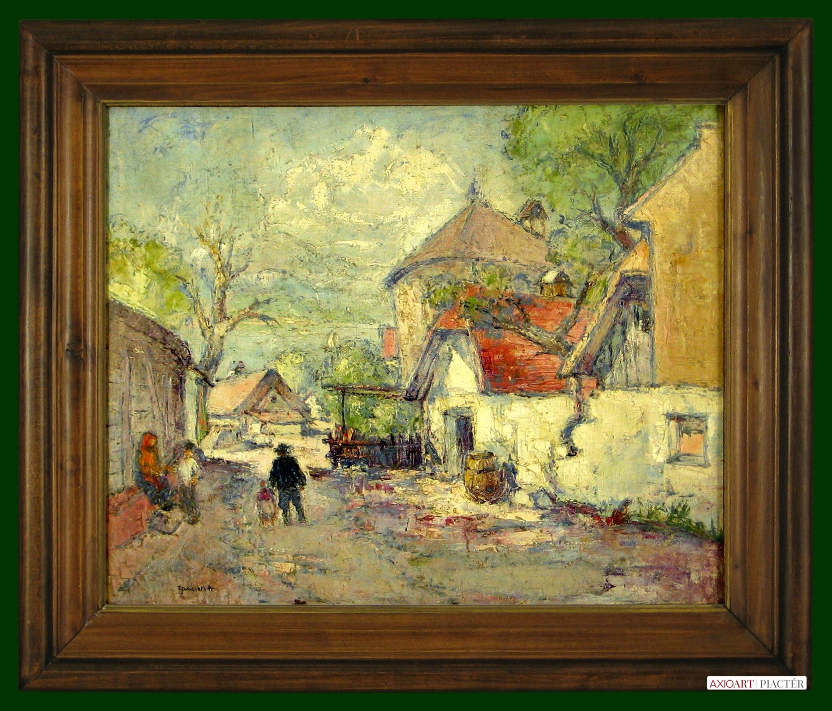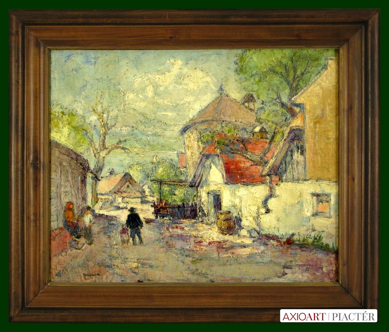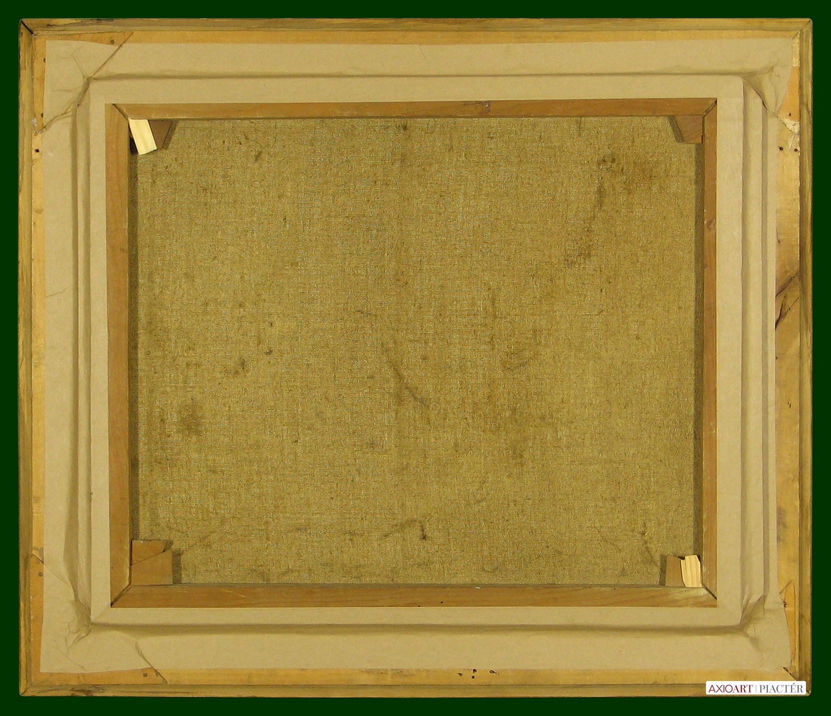 [FK3252/Bp9/8] A kép mérete: 60 x 50 cm keret nélkül. Készült: Olaj, Vászon A kép Szüle Péter (Cegléd, 1886, Budapest, 1944) alkotása. Jelezve Balra lent "Szüle" A festmény jó állapotban van. Keret: Ép Magyar festők és grafikusok életrajzi lexikona I-II. Festő és grafikus. A budapesti Képzőművészeti Főiskolán Zemplényi Tivadar, Ferenczy Károly és Balló Ede voltak a mesterei. Egy ideig Budapesten dolgozott, majd 1928-ig a szolnoki művésztelep tagja volt. Német- és Franciaországban, Itáliában, valamint Hollandiában járt tanulmányúton. Hollandiában Rembrandt művészete gyakorolt rá jelentős hatást. Rembrandti festői realizmussal előadott alakos képekkel (A tükör előtt, Templomban, stb.) keltett feltűnést. Később a tiszta impresszionizmus felé fejlődött stílusa, és ilyen értelemben festett plein air képeivel szerepelt külföldi tárlatokon. Erőteljesen jellemzett portrékon kívül (Herczeg Ferenc, Wlassics Gyula, stb.) tájképeket, leginkább érdekes karakterfejeket, mély tónusú belsőségeket festett, tömör előadásban. 1923-ban és 1929-ben a budapesti Ernst Múzeumban, 1924-ben és 1934-ben a Műcsarnokban, 1940-ben Debrecenben, (Kárpáthy Jenővel közösen) rendezett kiállításokat. 1920-ban kis állami aranyérmet és Halmos Izor-díjat, 1922-ben a Szinyei Merse Pál Társaság Ernst-múzeum díját, 1925-ben a Szinyei-jutalmat, 1927-ben nagy állami aranyérmet, 1940-ben állami vízfestménydíjat kapott. Fontosabb alkotásai: A kártyavetőnél, Műteremben, Öreg asszony, Főkötős lány, A Zagyva áradása, Templomban). Több munkáját a Magyar Nemzeti Galéria őrzi. (Éber, ML, Műv. 1966/9, Új Idők Lexikona) Magyar festők és grafikusok életrajzi lexikona I-II. Műgyűjtők és kereskedők kézikönyve Festő és grafikus. A bp.-i Képzőművészeti Főiskolán Zemplényi Tivadar, Ferenczy Károly és Balló Ede voltak a mesterei. Egy ideig Budapesten működött, majd 1928-ig a szolnoki művésztelep tagja volt. Német-, Olasz- és Franciaországban, valam. Hollandiában járt tanulmányúton. Hollandiában Rembrandt művészete gyakorolta reá a legnagyobb hatást. Rembrandti festői realizmussal előadott alakos képekkel (A tükör előtt, Templomban, stb.) keltett feltűnést. Később a tiszta impresszionizmus felé fejlődött stílusa, és ilyen értelemben festett plein air képeivel szerepelt külföldi tárlatokon. 1923-ban és 1929-ben az Ernst Múzeumban, 1924-ben és 1934-ben a Műcsarnokban, 1940-ben Debrecenben, (Kárpáthy Jenővel közösen) rendezett kollektív kiállításokat. 1920-ban kis állami aranyérmet és Halmos Izor-díjat, 1922-ben a Szinyei Merse Pál Társaság Ernst-múzeum díját, 1925-ben a Szinyei-jutalmat, 1927-ben nagy állami aranyérmet, 1940-ben állami vízfestménydíjat kapott. Több művét a MNG őrzi. (Éber, ML, Műv. 1966/9) Magyar festők és grafikusok adattára A Képzőművészeti Főiskolán, Balló Ede, Zemplényi Tivadar és Benczúr Gyula voltak a mesterei. Tanulmányutakat tett Német-, Francia- és Olaszországban. Képviselve az állami és fővárosi gyűteményekben. 1909 óta állít ki. Alakfestésünknek a klasszikus nyomdokain haladó egyik vezető mestere. Egyszerű átélésekkel teljes művészete, amely nem elméletekre, hanem érzésekre utaló. A fény és árnyék misztikus játéka indítja, ebből fejti ki alakjait. Nem rabja a rajznak és a szín sem csábítja hatáskeresésre. Kevés arcképfestőnél érezzük, mint nála azt a többletet, amely ezt a műfajt művészetté emeli és élményszerűvé teszi. 1923-ban és 1929-ben az Ernst Múzeumban, 1924-ben és 1934-ben a Műcsarnokban volt kiállítása. Számos díjat nyert. Több művét őrzi a Magyar Nemzeti Galéria. - Irod.: Felvinczi Takács Zoltán: Szüle Péter. Bp. 1923; Dévényi Iván: Szüle Péter. Művészet, 1966. 9. sz. Művészeti lexikon I-IV. Festő. Ferenczy Károly, Balló Ede és Zemplényi Tivadar voltak mesterei. Bp.-en és Szolnokon működött. Művészetére hatott a plein air festés is, de legismertebb képei inkább a Munkácsy-tradíció stílusjegyeit mutatják. Legerőteljesebb képei portrék. Életműve egyenetlen. 1923-ban és 1929-ben az Ernst Múzeumban, 1924-ben és 1934-ben a Műcsarnokban, 1940-ben Debrecenben (Kárpáthy Jenővel) nyílt kollektív kiállítása. Több díjat nyert. Számos műve (Nő fekete kalappal, Tükör előtt, Zagyvapart, Zsuzsánna és a vének, Varrás közben stb.) a Nemz. Gal. tulajdona. - Irod.: Felvinczi Takács Z.: Sz. P. Bp., 1923. Művészeti lexikon I-II. Budapesten végezte tanulmányait, u.o. és Szolnokon működik. Festői realizmussal előadott alakos képekkel (Tükör előtt, Templomban stb.) keltett feltűnést. Később a tiszta impresszionizmus felé fejlődött stílusa és ilyen értelemben festett sikerült plein-air-képeivel szerepelt tárlatainkon. 1920. a kis állami aranyérmet és a Halmos Izor-díjat, 1922. a Szinyei Társaság Ernst-múzeum-díját, 1925. a Szinyei-jutalmat, 1927. a nagy állami aranyérmet nyerte. 1923. és 1929. az Ernst-múzeumban, 1924. és 1934. a Műcsarnokban volt kollektív kiállítása. Nő fekete kalappal, Tükör előtt, Zagyvapart, Zsuzsanna és a két öreg és Varrás közben c. képei a Szépművészeti Múzeumban. Öregek, a Zagyva áradása, Műteremben és Zagyva című festményei a Fővárosi Képtárban vannak. - Irodalom: Felvinczi Takács (Bp., 1923).