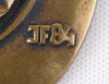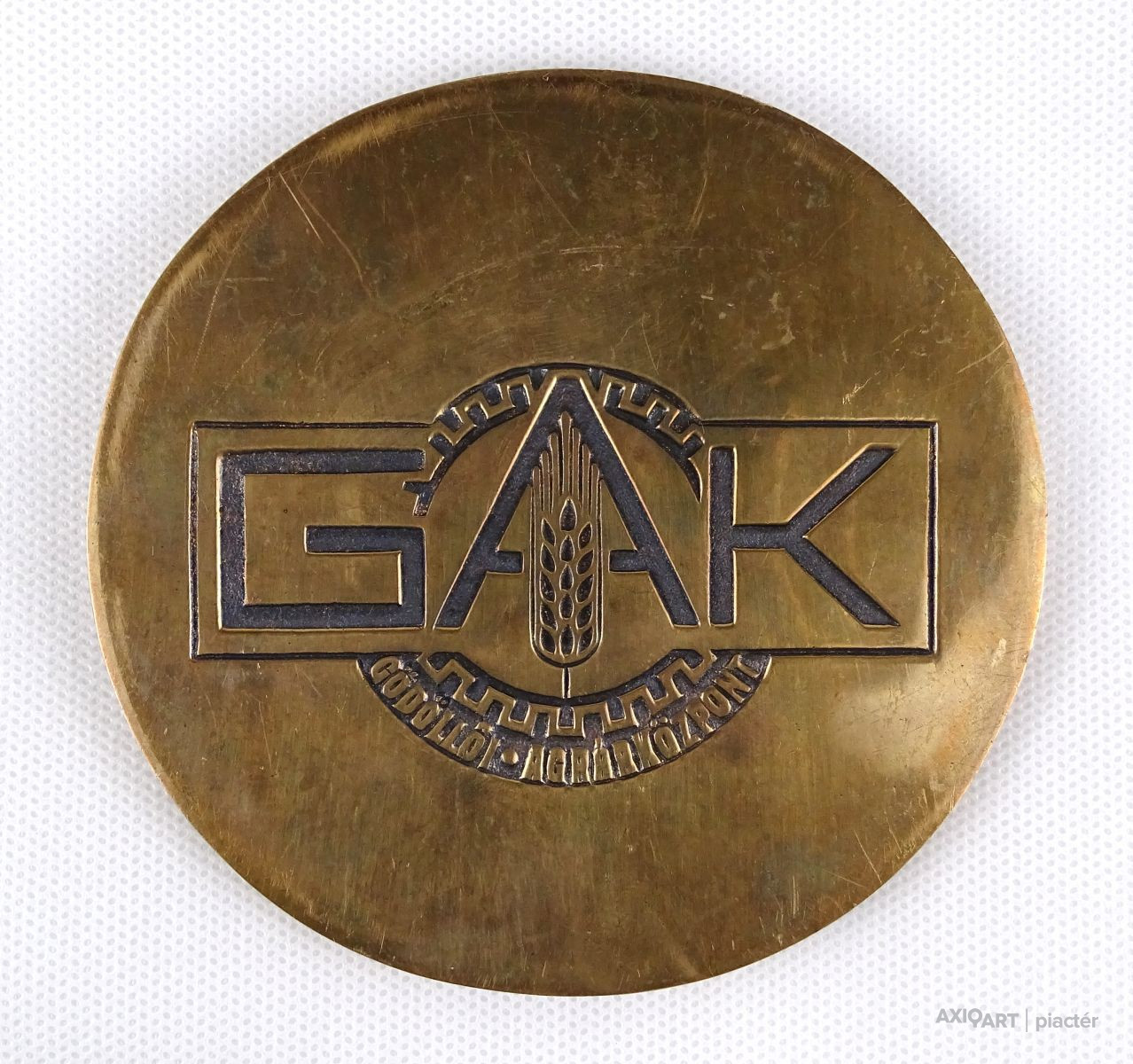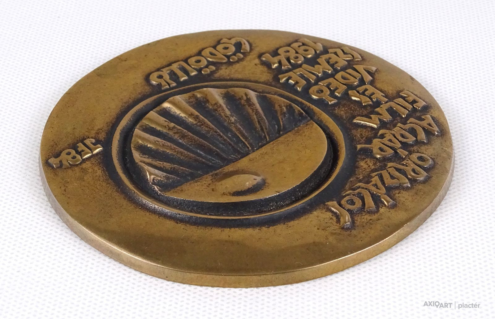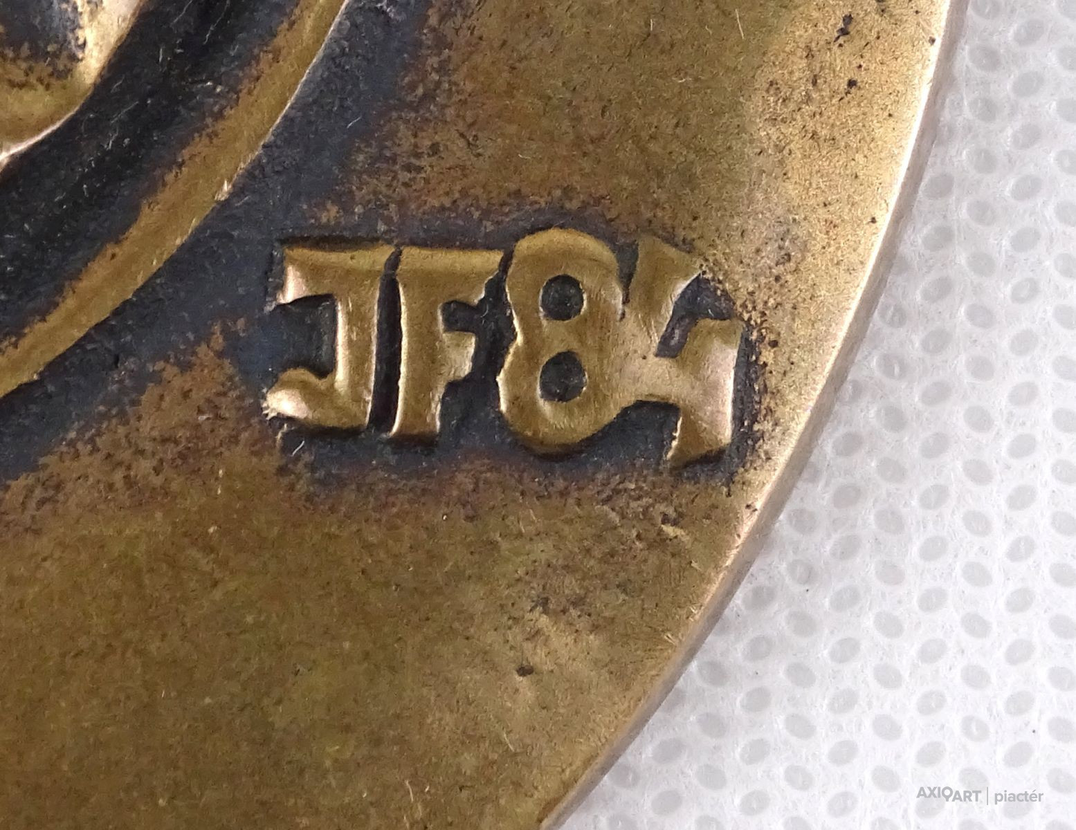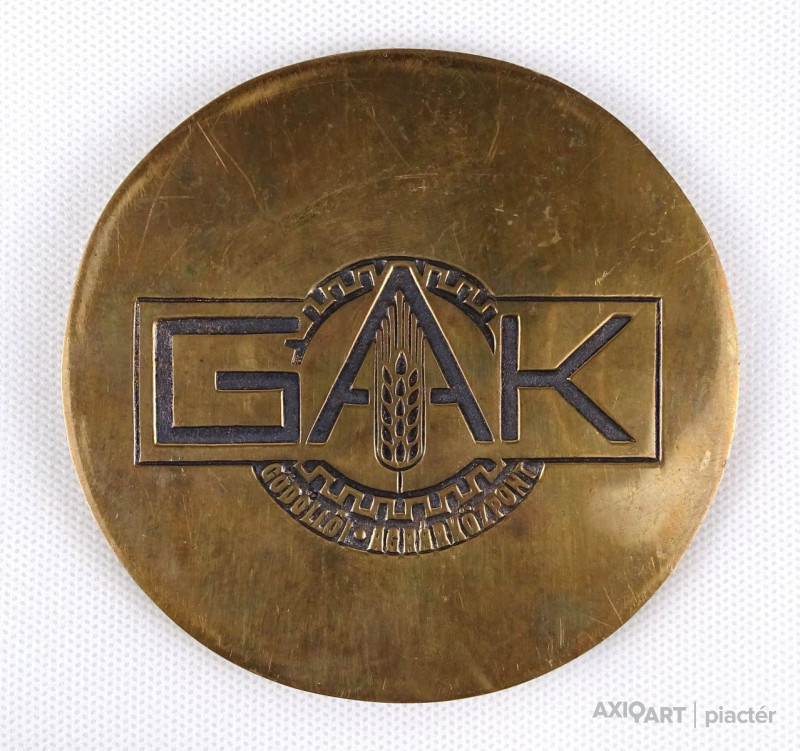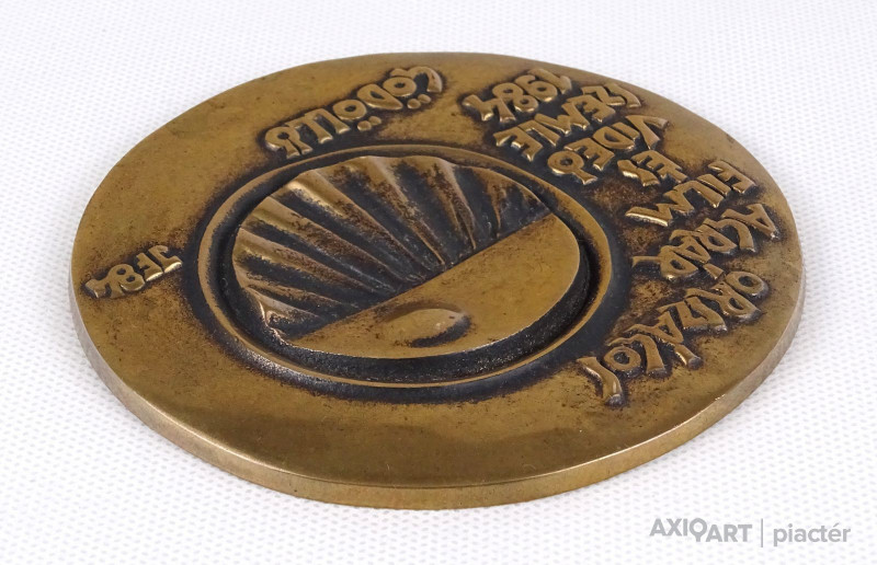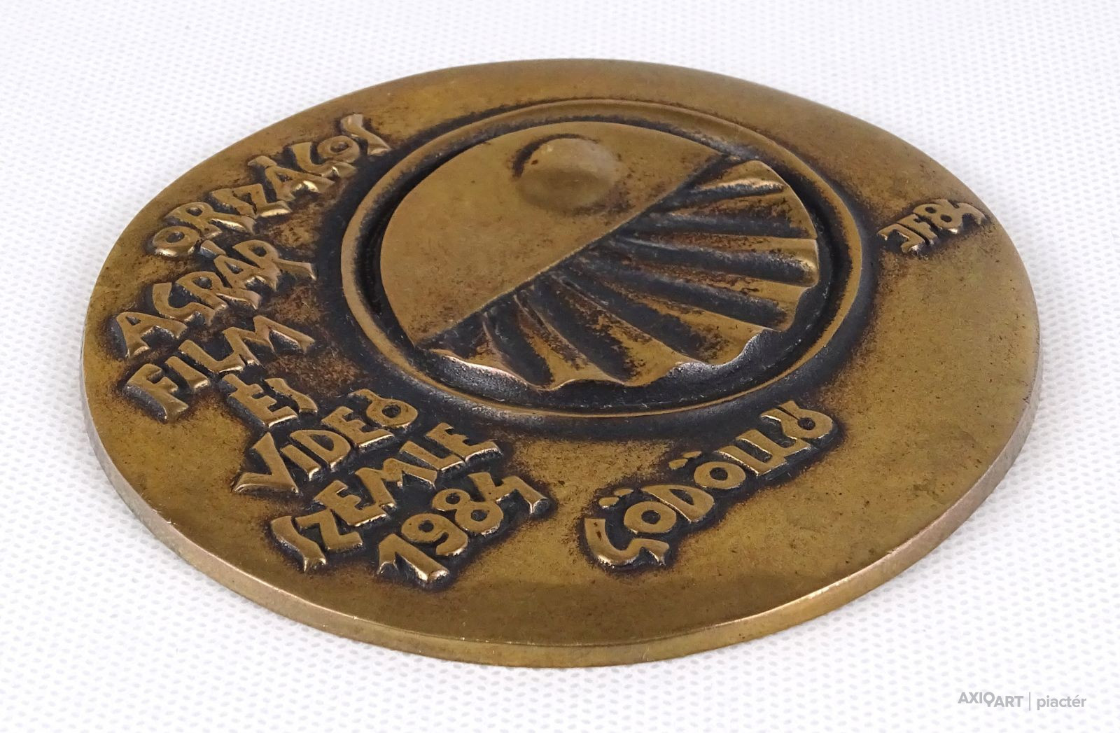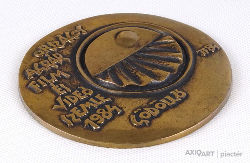 [1M095/X000] Szép állapotú kétoldalas nehéz, plasztikus bronzplakett. Felirat: - ORSZÁGOS AGRÁR FILM ÉS VIDEÓ SZEMLE 1984 GÖDÖLLŐ - GAK GÖDÖLLŐI AGRÁRKÖZPONT Jelzés a plaketten: JF84 Szélesség: 11 cm Súly: 0.39 kg Janzer Frigyes éremművész, szobrász Budapest, 1939-03-4 Szerző: Ladányi József 1960-1964: Bánki Donát Gépipari Technikum, emellett magánúton folytatott szobrászati tanulmányokat. 1969-1971: Derkovits-ösztöndíj; 1971: Derkovits-nívódíj; 1977: a salgótarjáni Tavaszi Tárlat szobrászati díja; 1978: Munkácsy-díj; a Kulturális Minisztérium képzőművészeti nívódíja; 1979: III. díj a hatvani Portrébiennálén; a Városi Tanács díja a 26. Vásárhelyi Őszi Tárlaton; 1984: Szakszervezetek Országos Tanácsa-ösztöndíj; a Csongrád megyei Tanács díja a Vásárhelyi Őszi Tárlaton; 1985: a XV. salgótarjáni Szabadtéri Szoborkiállítás fődíja; 1986: érdemes művész; 1988: a Képző- és Iparművészeti Lektorátus díja a XVIII. salgótarjáni Szabadtéri Szoborkiállításon; 1989: a hatvani Portrébiennálé III. díja; 2002: Magyar Köztársasági Ezüst Érdemkereszt. A Fiatal Képzőművészek Stúdiója Egyesületében vezetőségi tag volt. 1973-tól 1981-ig a Magyar Képzőművészek és Iparművészek Szövetsége Szobrász szakosztálya vezetőségi tagja, 1986-1990 között titkára. 1975-ben megalapította a Budapesti XXII. ker.-i Mészáros László Képzőművészeti Kört, melynek tanára és művészeti vezetője. 1987-ben egyik alapítója volt a DunapART Művészeti Társaságnak. Budapesten él. Jugoszláviában, Franciaországban, Olaszországban és a Szovjetunióban járt tanulmányúton. 1966 óta szerepel kiállításokon. Minden jelentős hazai tárlaton részt vett. Érmeire a lírai hangvétel, portréira a karakter tárgyilagos visszaadása jellemző. Szobraiban a harmónia és a dinamika kifejezésére törekszik. Irodalom Egyéni kiállítások Egyéni kiállítások 1980 • Hatvani Galéria, Hatvan 1989 • Nagy Balogh J. Terem, Budapest Válogatott csoportos kiállítások Válogatott csoportos kiállítások 1969-től • Országos Kisplasztikai Biennálé, Pécs 1970-től • Stúdió-kiállítás, Ernst Múzeum, Budapest 1972-től • Nyári Tárlat, Móra Ferenc Múzeum Képtára, Szeged 1974-től • Tavaszi Tárlat, József Attila Megyei Művelődési Központ, Salgótarján 1976-tól • Őszi Tárlat, Tornyai János Múzeum, Hódmezővásárhely Magyar Szobrászat, Műcsarnok, Budapest 1983-tól • Országos Éremművészeti Biennálé, Sopron 1985 • Nemzetközi Kisplasztikai Biennálé, Poznań 1989 • Téli Tárlat, Magyar Képzőművészek és Iparművészek Szövetsége, Műcsarnok, Budapest Művek közgyűjteményekben Művek közgyűjteményekben Petőfi Irodalmi Múzeum, Budapest Vak Bottyán Múzeum, Vác. Forrás: artportal.hu