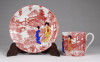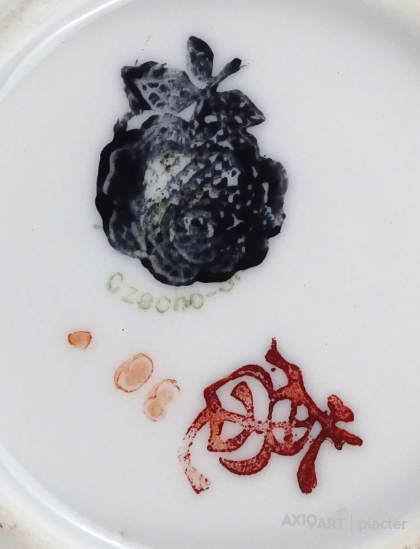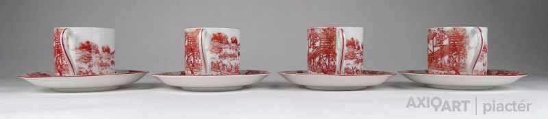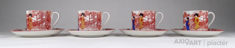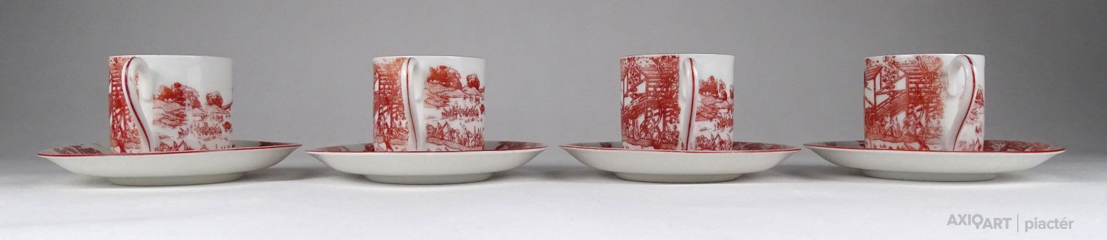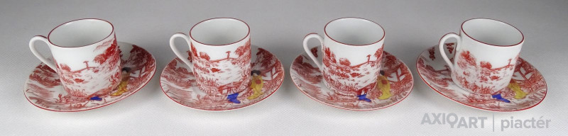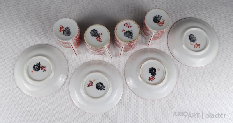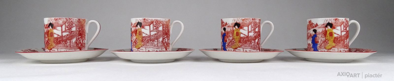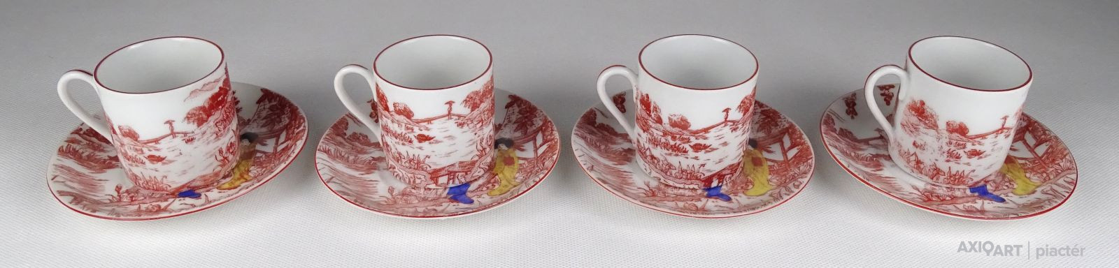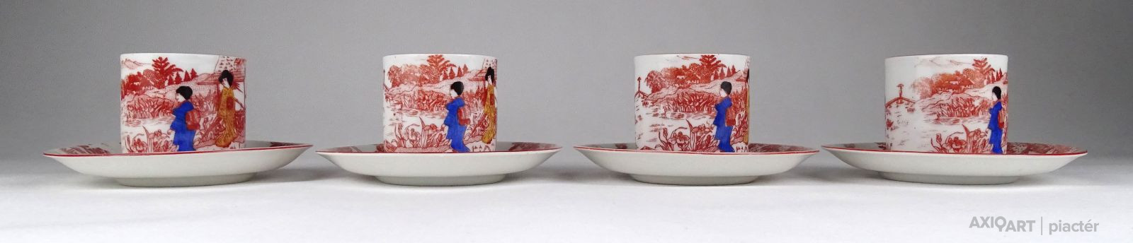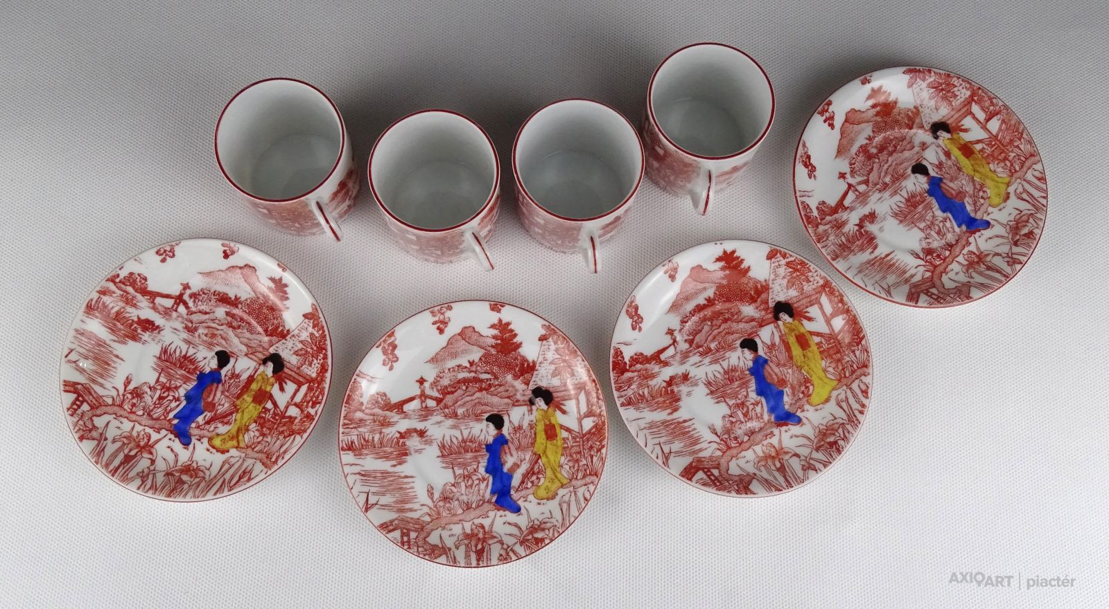 [1Q850/X017] Hibátlan állapotú, jelzett, keleti motívumos porcelán kávéskészlet. A darabokon két gésa, tipikus japán táj, és épületek láthatók. Alján zöld márkajelzés: VICTORIA CZECHO-SLOVAKIA Felette fekete rózsa pecsét. Mellette piros japán jelzés, lásd fotó. A készlet darabjai: - 4 darab csésze (5.1 x 5.2 x 7.1 cm) - 4 darab alátét tányér (11 cm) Súly: 0.44 kg