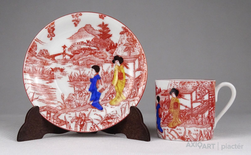 Hibátlan állapotú, jelzett, keleti motívumos porcelán kávéskészlet. A darabokon két gésa, tipikus japán táj, és épületek láthatók.