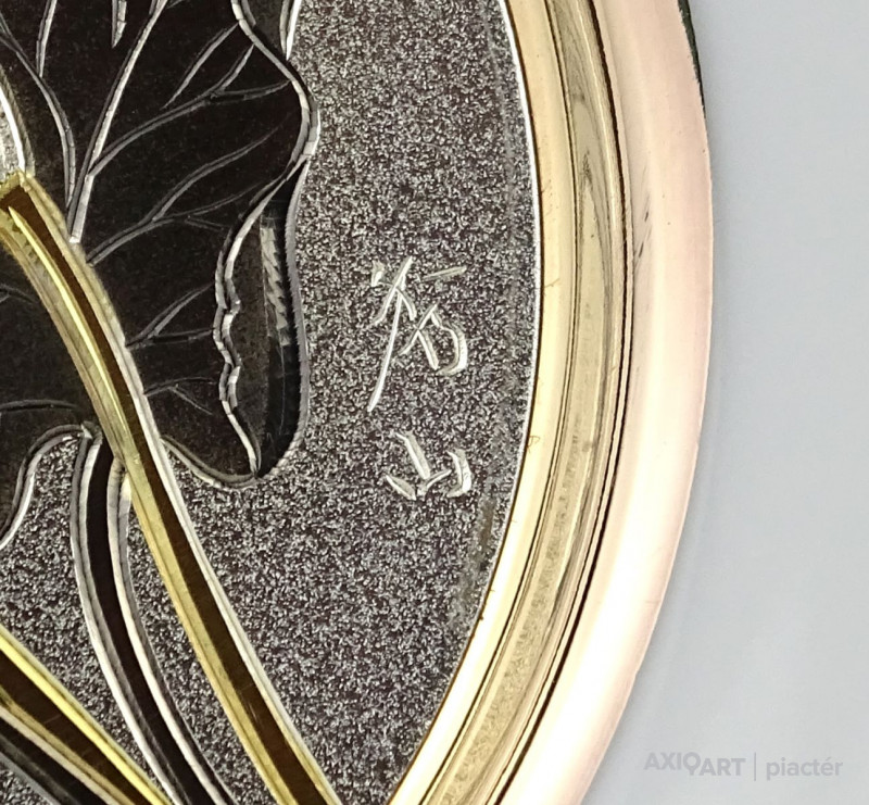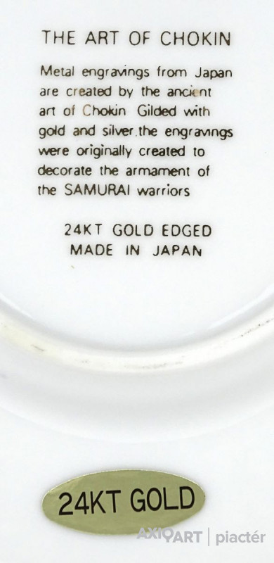 [1P246/X118] Gyönyörű, jelzett, ezüstözött és aranyozott japán porcelán tányér, dísztányér. Közepén Kála díszítés található. A Kálák mellett japán kalligrafikus jelzés, lásd fotó. Hátoldalán jelzés, felirat: THE ART OF CHOKIN METAL ENGRAVING FROM JAPAN ARE CREATED BY THE ANCIENT ART OF CHOKIN GILDED WITH GOLD AND SILVER THE ENGRAVINGS WERE ORIGINALLY CREATED TO DECORATE THE ARMAMENT OF THE SAMURAI WARRIORS 24KT GOLD EDGED MADE IN JAPAN Szélesség: 15.3 cm Súly: 0.165 kg