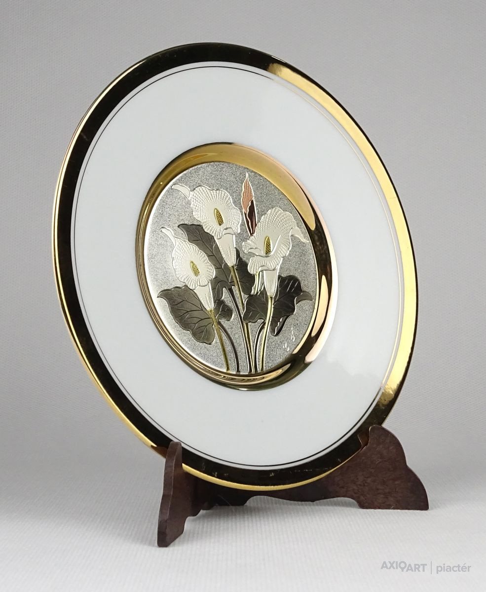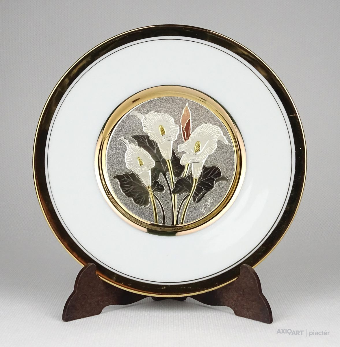 Gyönyörű, jelzett, ezüstözött és aranyozott japán porcelán tányér, dísztányér. Közepén Kála díszítés található. A Kálák mellett japán kalligrafikus jelzés, lásd fotó.