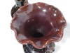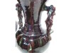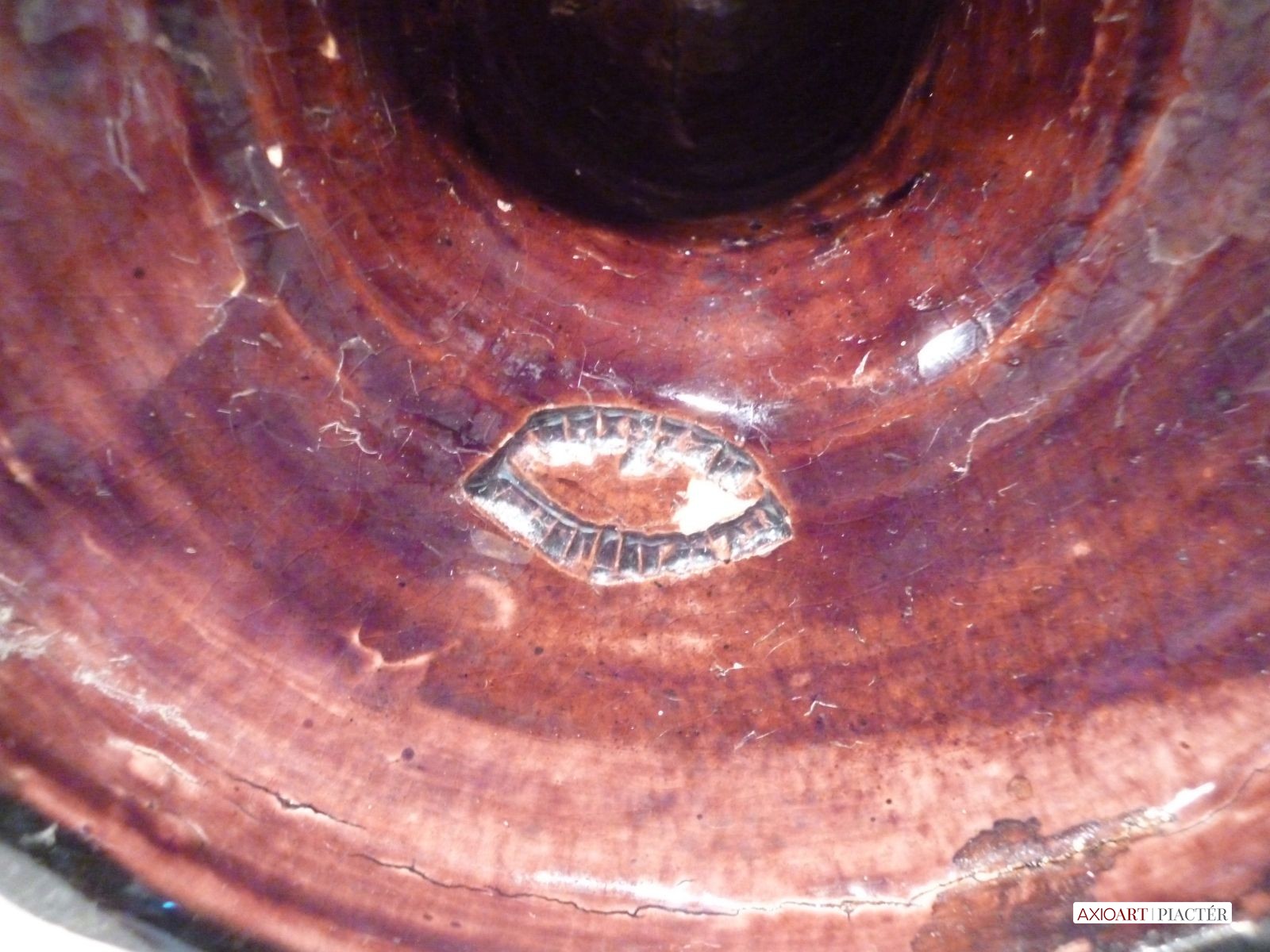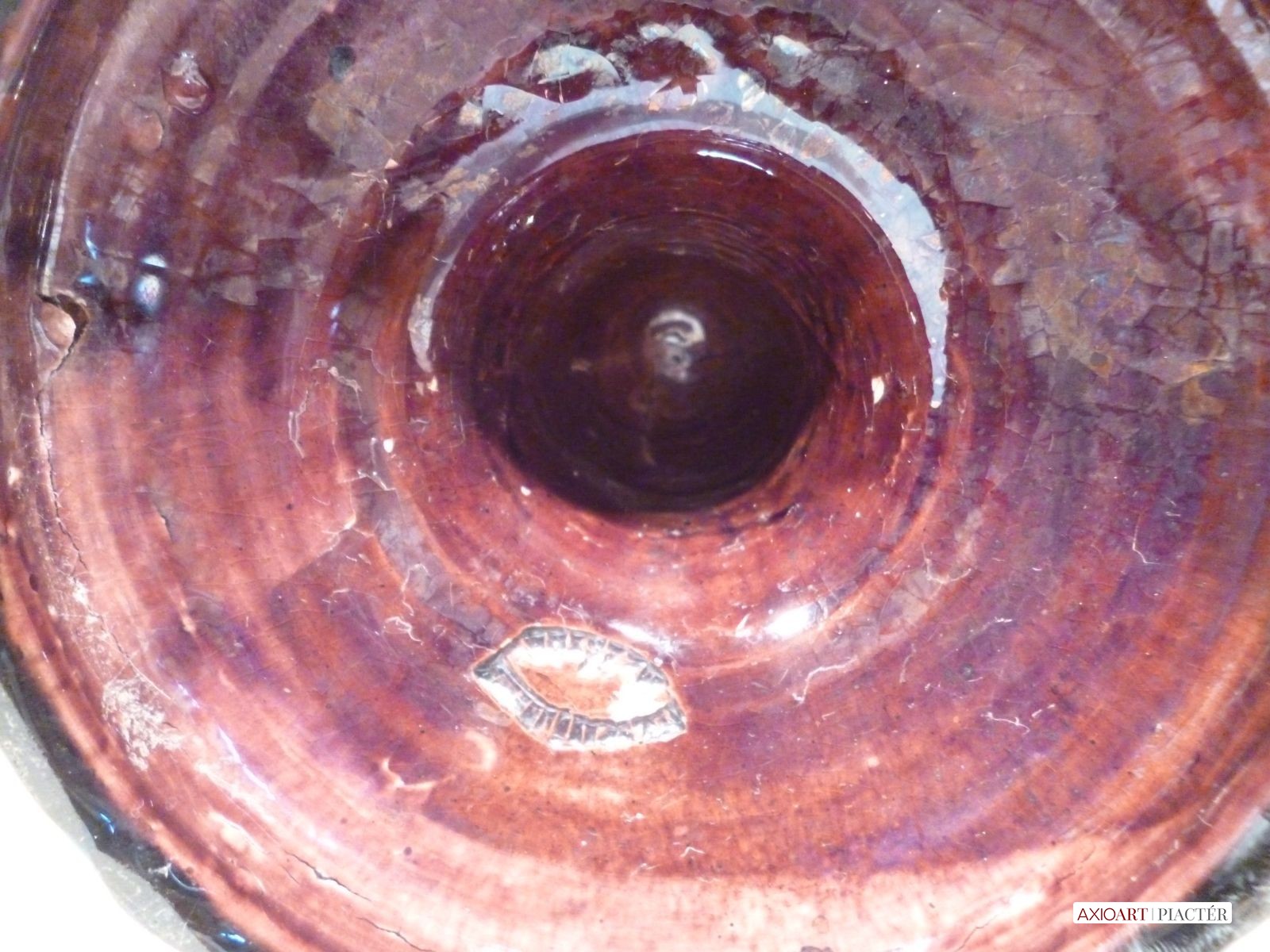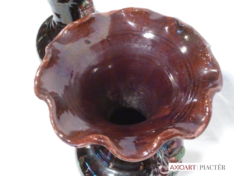 Virág mintás füles, zöld, barna folyatott mázas kerámia, gyűjteménybe való darab.