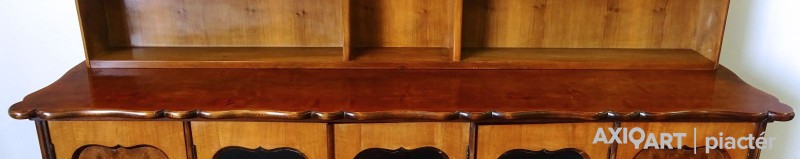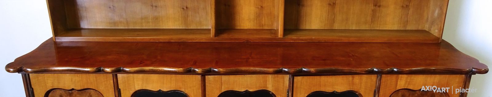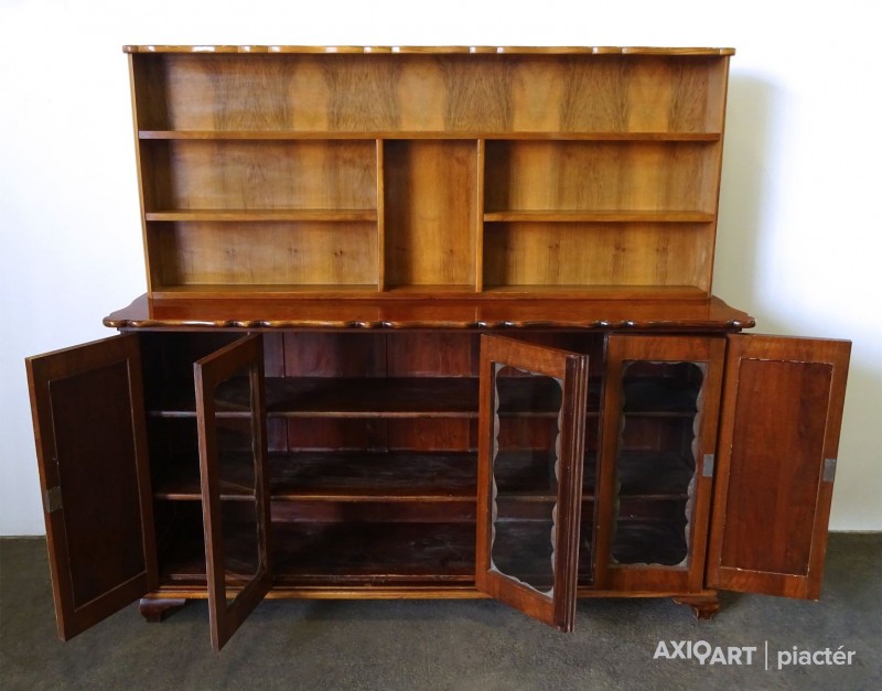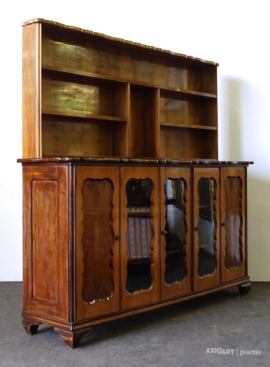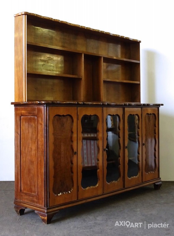 Régi, szép állapotú, ritka ötajtós, vitrines, polcos szekrény.