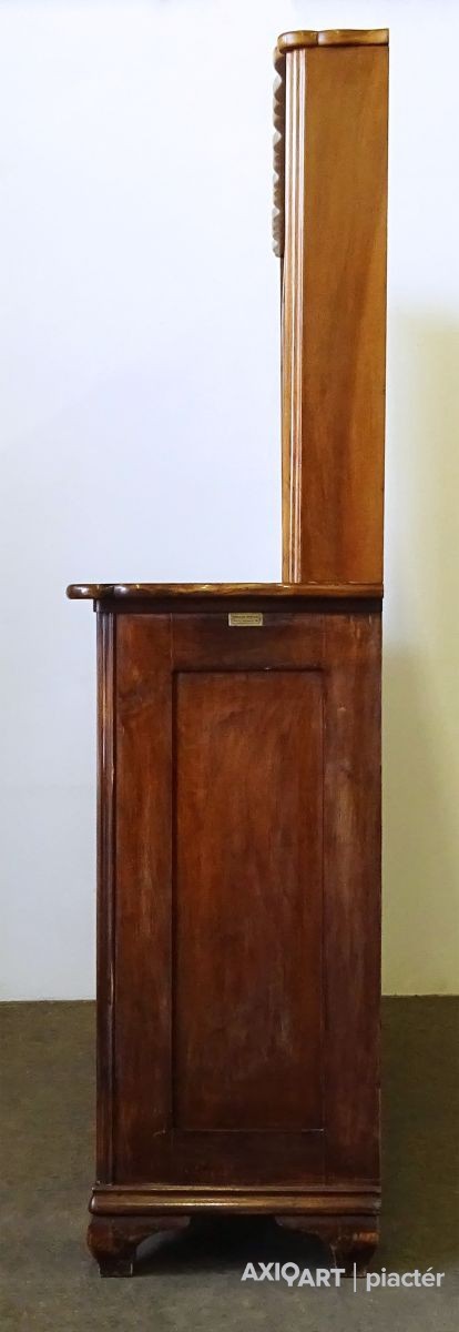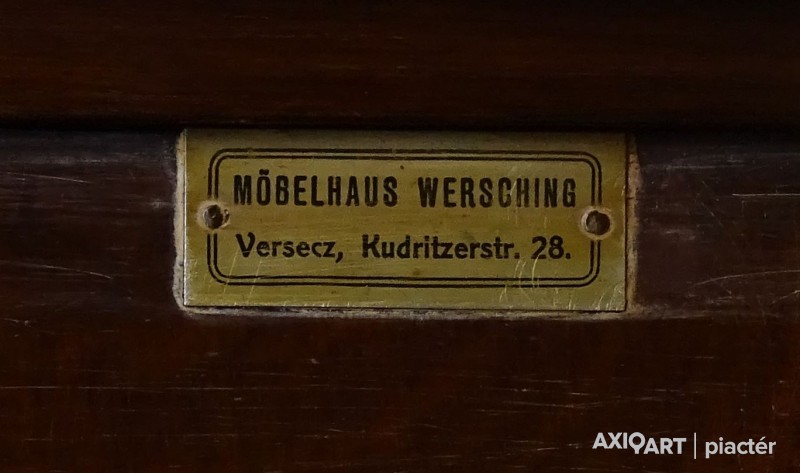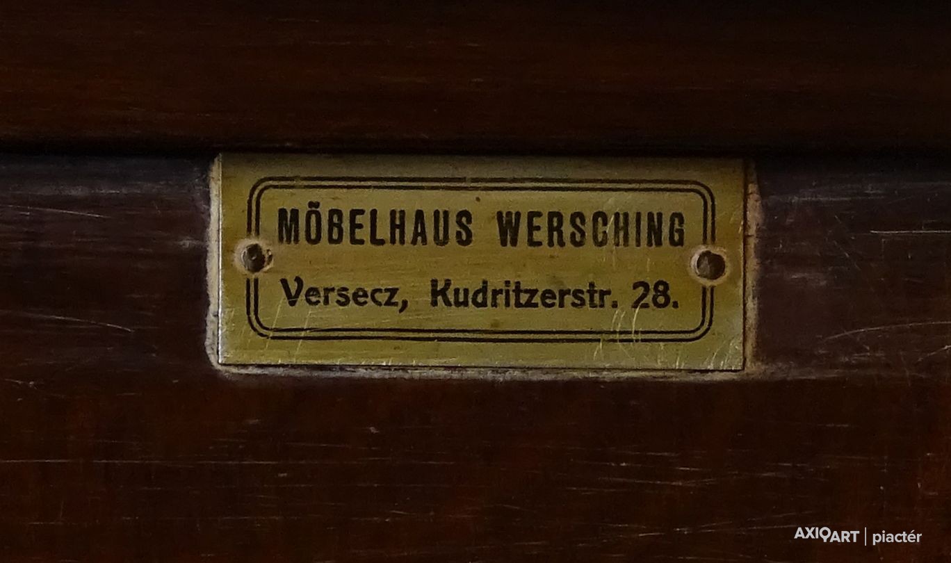 [0O936/KCS] Régi, szép állapotú, ritka ötajtós, vitrines, polcos szekrény. Oldalán jelzés: MÖBELHAUS WESCHING VERSECZ KUDRITZER STR. 28. Magasság: 195 cm Szélesség: 210 cm