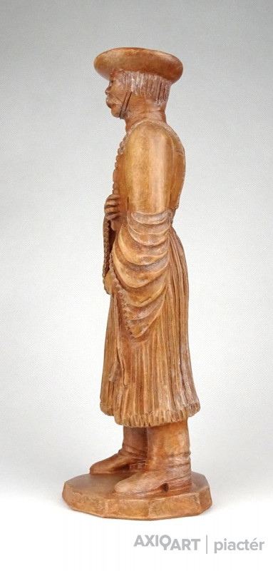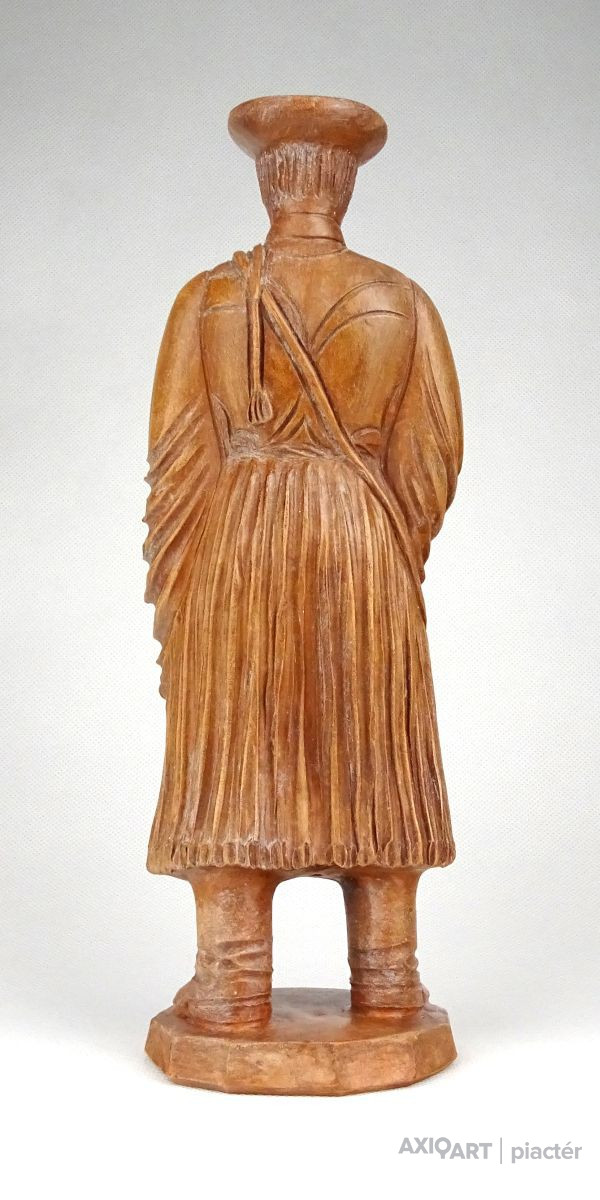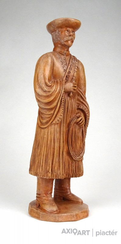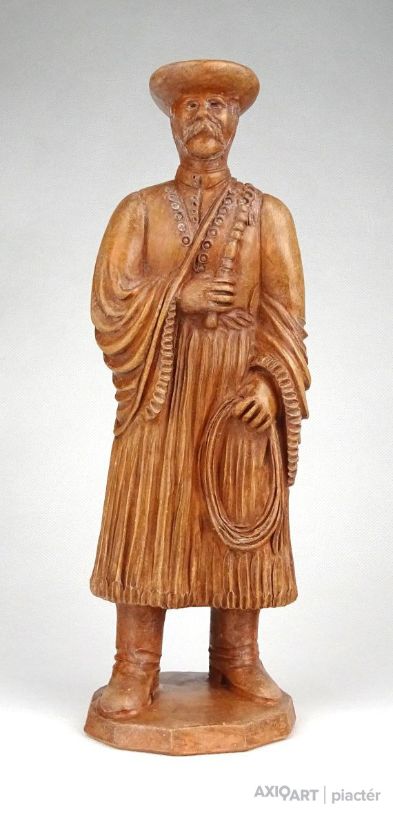Hibátlan állapotú, máz nélküli, talapzaton álló népviseletes kerámia férfi. Kezében karikás ostor.