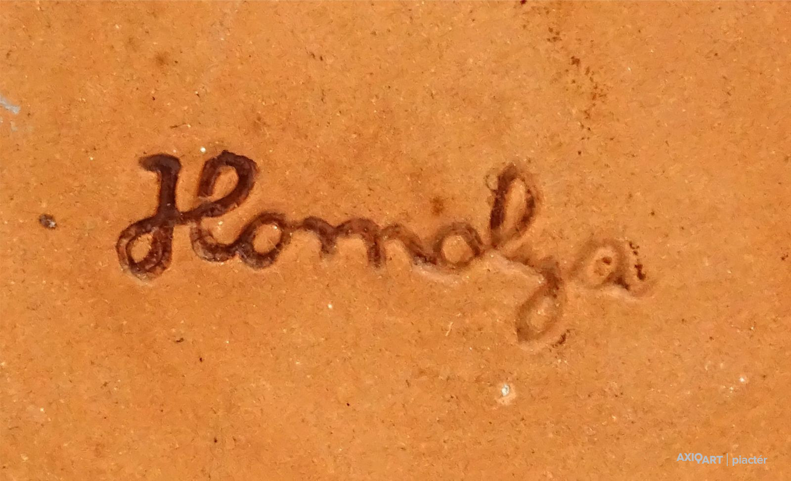 [0U704/BX-9] Hibátlan állapotú, jelzett, háromalakos kerámia figurális mécsestartó figura. Jelzés: KISS ROÓZ Magasság: 19 cm Szélesség: 6 cm Hosszúság: 16 cm Súly: 0.639 kg Kiss Roóz Ilona keramikus Születési hely: Szatmárnémeti [Satu Mare, RO] Születési dátum: 1920 Kiállítások az adatbázisban:  Kiss Roóz Ilona életműkiállítása Mesterei: Orbán Antal, Ohmann Béla. 1939-43: Iparművészeti Iskola, mesterei: Orbán Antal, Ohmann Béla. 1956, 1962: Munkácsy-díj; 1980: érdemes művész; 1984: SZOT-díj; 1994: MSZOSZ díja; 1995: Magyar Köztársasági Érdemrend Középkeresztje. A magyar kerámia Kovács Margit által teremtett naiv-népies irányzatának jeles művelője. Edényeit, kisplasztikáit, ill. murális alkotásait vidám színvilág és kedves humor jellemzi. 1948 és 1952 között tanított az Iparművészeti Főiskolán, azóta szabadfoglalkozású. Egyéni kiállítások 1966 • Csók Galéria, Budapest 1971 • Csók Galéria, Budapest 1980 • Budavári Ipaművészeti Bolt, Budapest 1984 • Petőfi Művelődési Ház, Tiszaluc 1989 • Kispréposti Palota, Eger (állandó kiállítás) 1992 • Bécs 1995 • Minigaléria, Miskolc 1996 • Petőfi Művelődési Ház, Tiszaluc 1997 • Derkovits Művelődési Központ, Tiszaújváros. Válogatott csoportos kiállítások 1947 • Karácsonyi kiállítás, Budapest • Fővárosi Művelődési Központ 1952 • Iparművészeti kiállítás, Ernst Múzeum, Budapest 1956 • Iparművészeti kiállítás, Iparművészeti Múzeum, Budapest 1958 • Magyar kerámia kiállítás, Vallauris 1959 • Magyar képzőművésznők kiállítása, Ernst Múzeum, Budapest 1959 • IV. Országos Iparművészeti Kiállítás, Műcsarnok, Budapest 1963 • Modern magyar kerámia, Royal Festival Hall, London 1965 • Országos Iparművészeti Kiállítás, Műcsarnok, Budapest 1968, 1970 • I., II. Országos Kerámia Biennálé, Pécs 1973 • Magyar kerámia, Ankara, Isztambul 1975 • Tárgy és alkotója, Iparművészeti Múzeum, Budapest 1982 • Magyar kézműves kerámia, Siklós 1995 • XX. századi magyar keramikusok, Iparművészeti Múzeum, Budapest • Az agyag mesterei, Vigadó Galéria, Budapest 1998 • Őszi Kerámia Kiállítás, Olaf Palme Ház, Budapest Művek közgyűjteményekben Köztéri művei kerámia dombormű (1958, Pereces, bölcsőde) kerámia napóra (1959, Székesfehérvár, Béke téri iskola) csempeburkolat (1961, Szeged, rendelőintézet) falikép (kerámia, 1962, Sopron, Gyermekszanatórium) kerámia falikép (1966, Békéscsaba, bölcsőde) Irodalom GÁL J.: ~ 77 éves. Beszélgetés a művésszel, Magyar Iparművészet, 1997/4. KESZTHELYI K.-LACZKÓ I.: A magyar kerámiaművészet I., Alkotók, adatok 1945-1998, Budapest, 1999. Vadas József + MAOE Forrás: artportal.hu