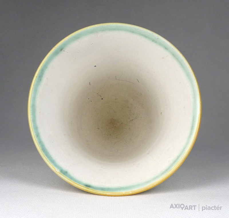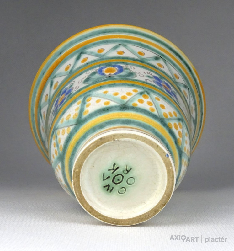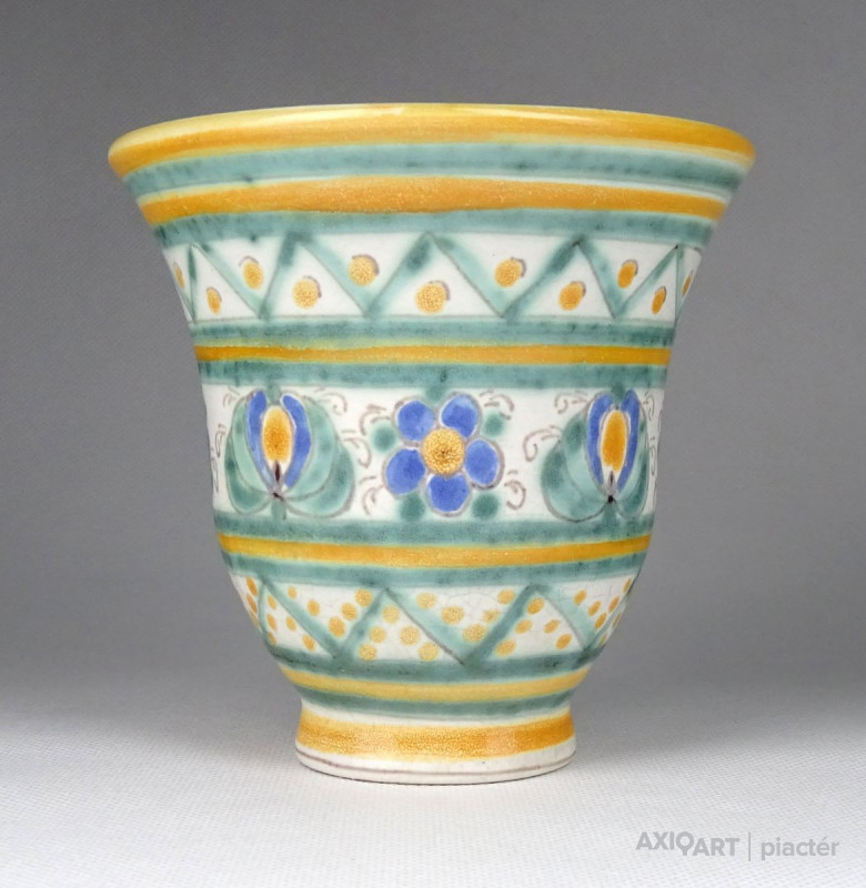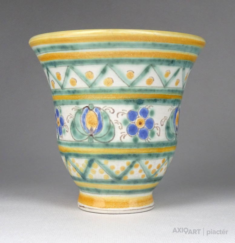[1G808/X112] Szép állapotú, Gorka Géza kerámia váza, díszváza. Rajta habán jellegű kézi festésű díszítések. Száján kisebb sérülés található, lásd fotó. Alján halvány jelzés: GORKA Magasság: 11 cm Szélesség: 11.2 cm Súly: 0.325 kg