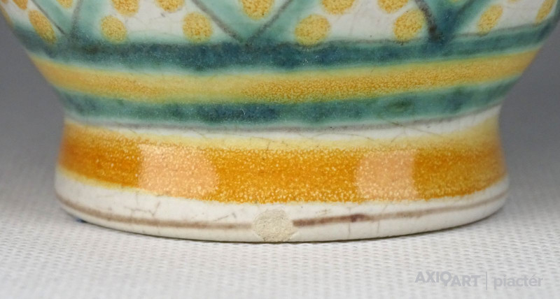 Szép állapotú, Gorka Géza kerámia váza, díszváza. Rajta habán jellegű kézi festésű díszítések. Száján kisebb sérülés található, lásd fotó.