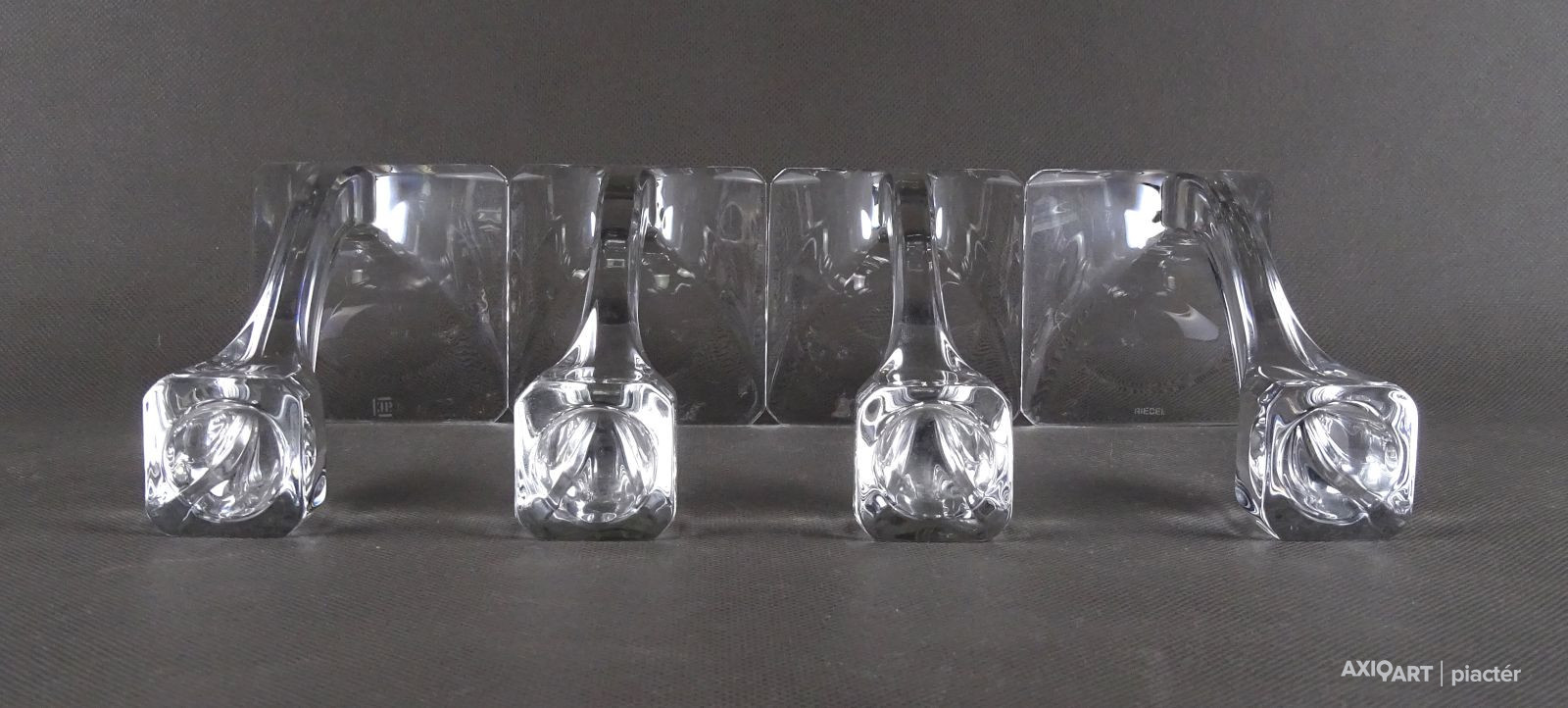 [1T681/X257] Hibátlan állapotú, négy darabból álló, art deco stílusú, formatervezett, jelzett osztrák üveg gyertyatartó szett. Alján jelzés: RIEDEL Magasság: 14.8 cm Szélesség: 7.2 cm Súly: 1.28 kg Riedel (üveggyártó) Tiroler Glashutte GmbH Kereskedelmi név Riedel Vállalat típusa Magán Ipar Üveggyártás Alapított 1756 (eredeti) 1956 (jelenlegi) Elhunyt 1945 (eredeti) Központ Kufstein , Ausztria Kulcsemberek Maximilian Riedel (vezérigazgató) Működési bevétel  € Összes eszköz  € Riedel  A Crystal az ausztriai Kufsteinben székelő üvegárugyártó cég , amely leginkább a különféle borfajták kiemelésére tervezett üvegárujáról ismert. Petr Novy, a csehországi Jablonec nad Nisou - i Üveg- és Ékszermúzeum vezető kurátora szerint a Riedel a legrégebbi ,  családi tulajdonban lévő és üzemeltetett globális kristályüvegmárka világszerte. Az 1756-ban Csehországban alapított céget Georg Riedel és Maximilian Riedel irányítja . Később Claus J. Riedel 1956-ban újjáalapította a Swarovski család támogatásával. Történelem   Josef Riedel   Josef Riedel (1885 körül) Josef Riedel (1816–1894) az ipari forradalom idején született . 1858-ban nyolc üveggyára volt, köztük két textilgyár és szénbányák. Üvegeművei üvegékszereket, gyöngyöket és csillár alkatrészeket gyártottak, majd 1873-ban megkezdték a luxus üreges üvegtermékek gyártását is. Eredményeiért számos elismerésben részesült: 1873-ban a bécsi világkiállításon „Grand Prix”-ben tüntették ki, a franzesbadi és a wiesenthali önkormányzat díszpolgári címet kapott, a pápa pedig renddel tüntette ki. Kemény munkája és szorgalom révén az üzleti siker kortárs modellje volt. Alkalmazottai tisztelettel úgy szólítottak hozzá: „Mr. Apa” és kortársai az „Iser-hegység üvegkirályaként” emlegették. Josef Riedel életét egy szilárd alapokon nyugvó birodalom felépítésének szentelte. Az árak leengedése helyett csak kiváló minőségű termékeket kínált, amelyeket a vásárlók nagyra értékeltek. Walter Spiegl,  a 19. századi üveg témájára szakosodott szerző szerint Josef Riedel volt az első, aki feltalálta az uránüveget. Josef Riedel ezt az üvegtípust Annagelbnek és Annagrünnek nevezte el felesége, Anna után, akivel 1840-ben házasodtak össze. Ezenkívül Josef kiterjedt földterülettel rendelkezett, és jól ismert bankár és pénzember volt a hegyekben. Segítségével 6%-os kamatozású kölcsönöket nyújtott a tőkeigényes vállalkozásoknak, sőt anyagilag is segítette őket exportpiacra találni. 1861-ben például az ő anyagi támogatása tette lehetővé az albrechtsdorfi Gebrüder Feix cég elindítását, amely a gombok, fekete divatékszerek és kristályáruk egyik legnagyobb gyártójává vált az országban. Daniel Swarovski később ebben a cégben kezdte pályafutását. A Riedel cég kiskereskedelmi raktárakat üzemeltetett Gablonz környékén minden nagyobb gyártási helyen. Ezeknek a cégeknek a tulajdonosai rendszeresen tájékoztatták a Riedeleket az aktuális keresletről, a versenyről és a nagy megrendelésekről, amelyeket az exportőrök továbbítottak beszállítóiknak gyártás céljából. Josef Riedelt saját jogán üvegszakértőként is tisztelték. Josef Schreiber ipari mágnás, a nagy bécsi üvegipari cég, Josef Schreiber & Neffen vezetője, még Csehország legnagyobb üveggyártásának szakértőjének is nevezte. Josef „A Jizera-hegység üvegkirályaként” volt ismert (1844–94). Nem sokkal halála után Josef fiai 1895-ben regisztrálták az első Riedel logót.   Forrás: Wikipédia