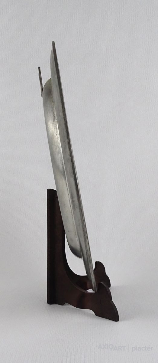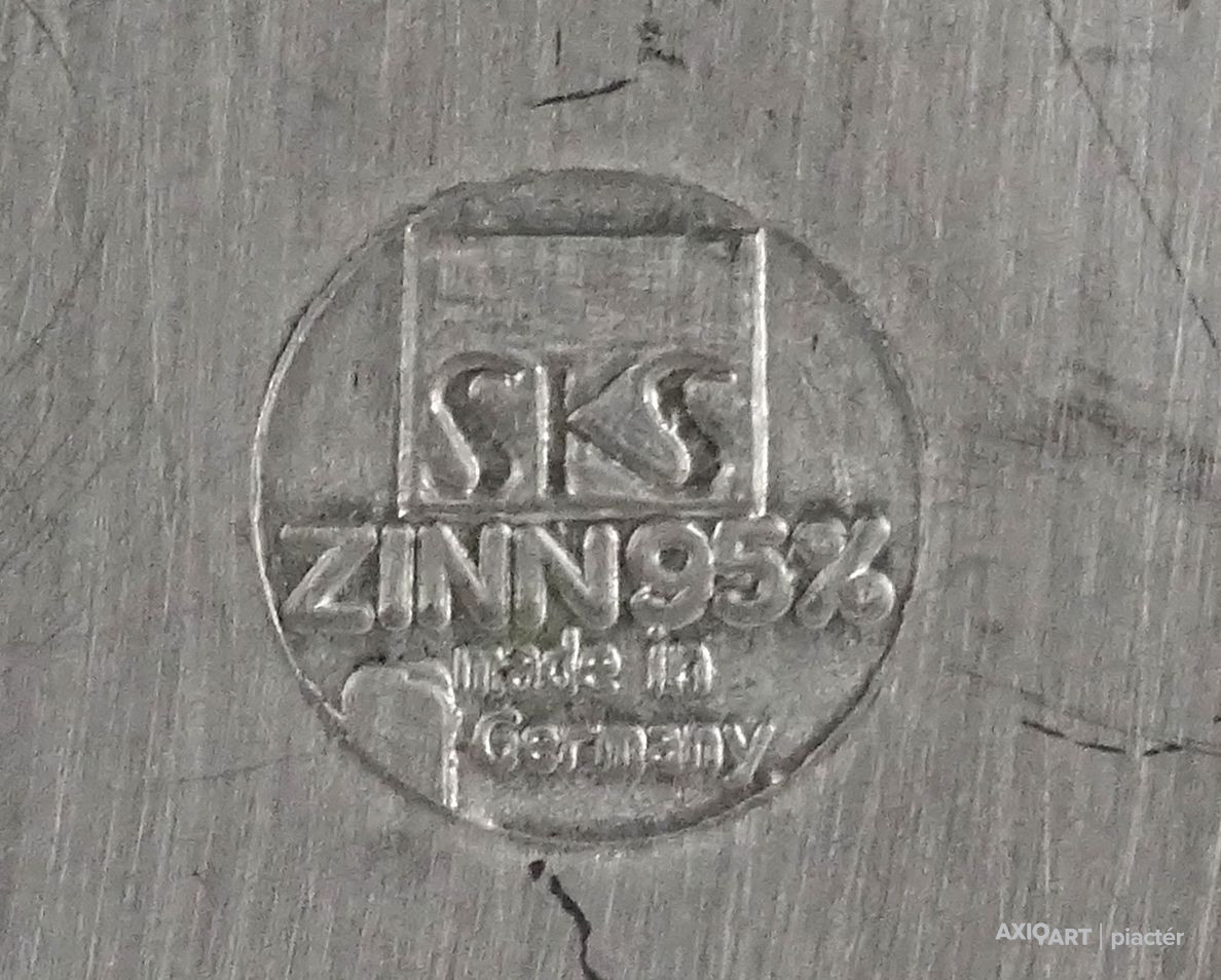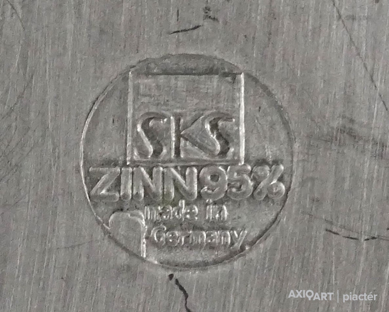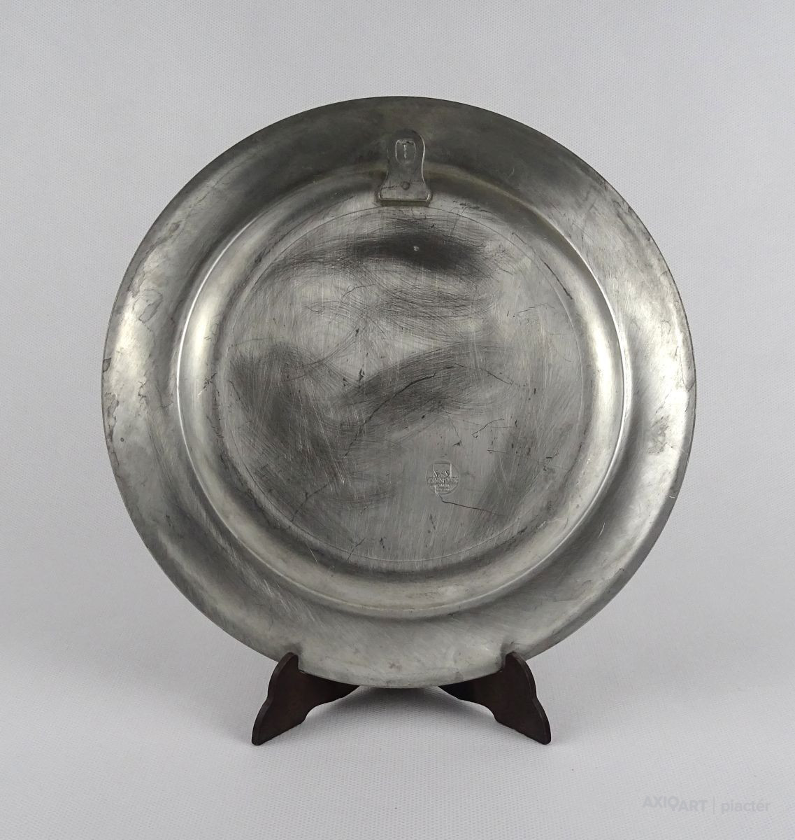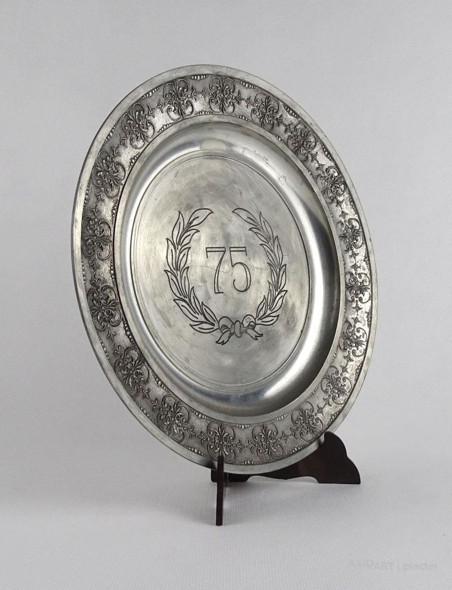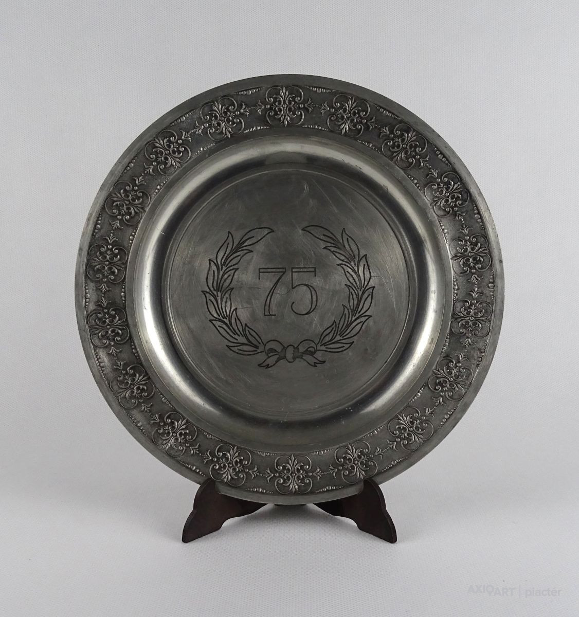 Szép állapotú, falra akasztási lehetőséggel rendelkező jelzett ón tányér, fali dísztányér. A tányér széle körben gazdagon díszített, közepén 75-ös szám látható. Születésnapi ajándék.