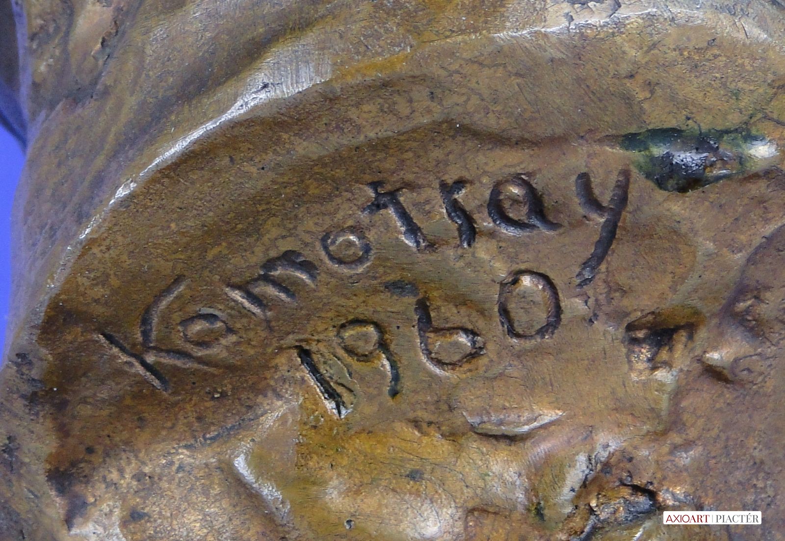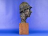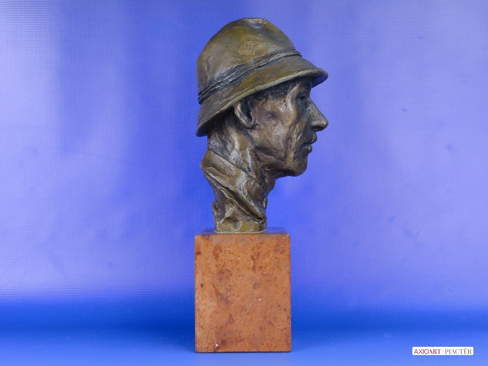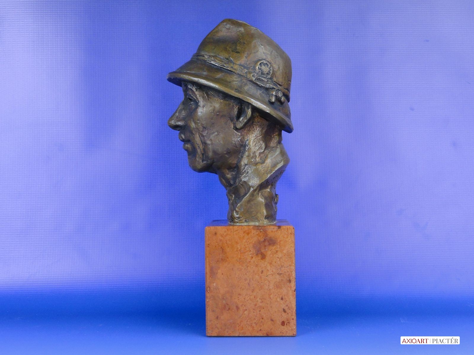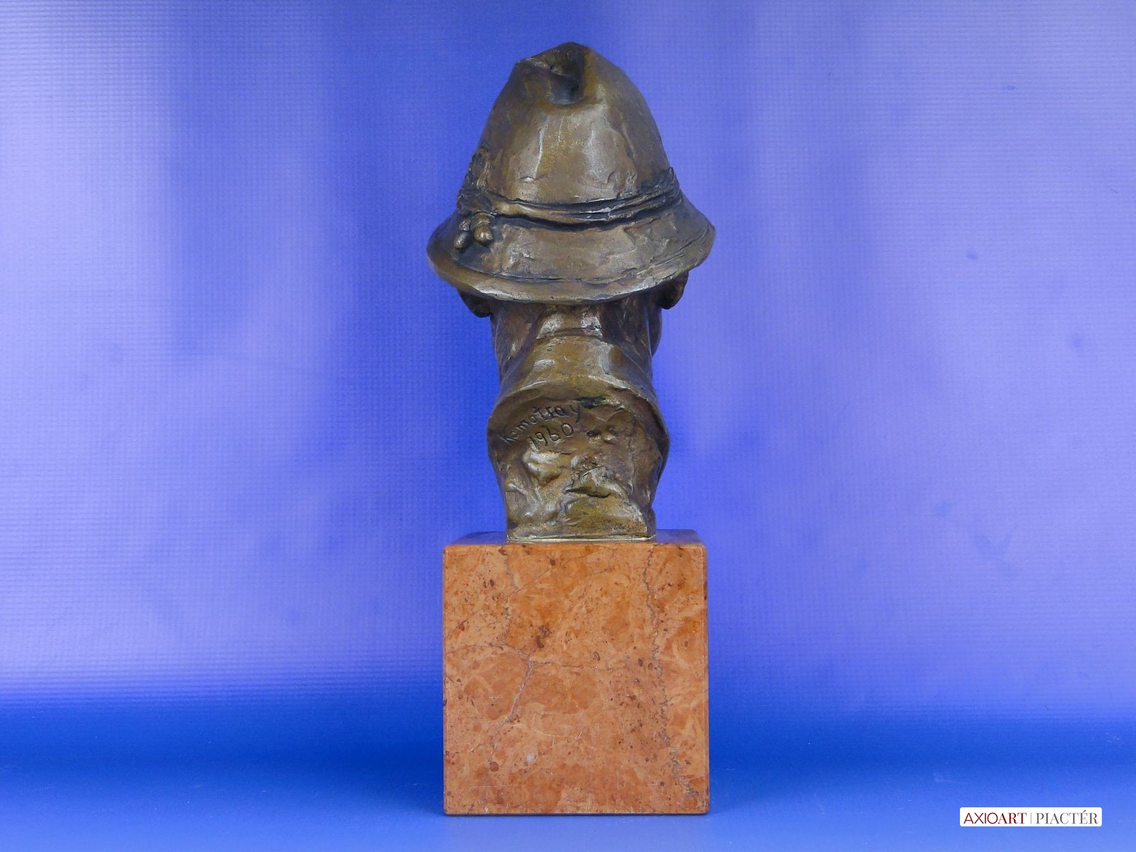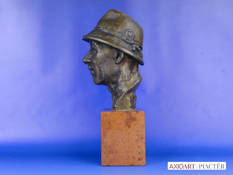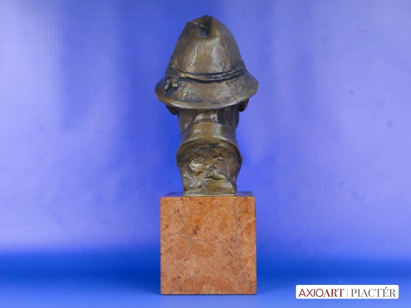 [0E638/UZ-K] Régi jelzett, datált kalapos férfi réz mellszobor márvány talapzaton. Jelzés hátul: KAMOTSAY 1960 Magasság: 31 cm Szélesség: 12 cm Súly: 6.5 kg Kamotsay István szobrász Születési hely: Hódmezővásárhely Születési dátum: 1923 Honlap: Kiállítások az adatbázisban: Mesterei: Bory Jenő, Pásztor János, Pátzay Pál, Medgyessy Ferenc. 1941-1949: Magyar Képzőművészeti Főiskola, mesterei: Bory Jenő, Pásztor János, Pátzay Pál, Medgyessy Ferenc. 1953, 1973: Munkácsy-díj; 1966: Szakszervezetek Országos Tanácsa-díj; 1947-től a Százados úti Művésztelep tagja. Szerepet játszott a vásárhelyi telep újraindulásánál, a város művészeti életében. 1952-1955 között a Magyar Képzőművészek és Iparművészek Szövetsége szobrász szakosztályának titkára volt. Az anyagelvű gondolkodás híve. Nagy természettudományos felkészültséggel készítette vásárhelyi, ill. szolnoki, miskolci kútjait, Bioszféra c. kisplasztikáját (1980 k.). Dekoratív térplasztikákat, sporttárgyú szobrokat, portrékat készített. Biológiai eseményekről szól a miskolci Fotoszintézis c. kút. Dekoratív térplasztikáira kísérletező kedv, a különféle anyagok (vas, ón, vörösréz, bronz, üveg, műanyag, kő) együttes használatának kikísérletezése jellemző. Portréi, sporttárgyú szobrai hagyományosabb megoldásúak. Egyéni kiállítások Válogatott csoportos kiállítások 1948 • Fővárosi Képtár 35. kiállítása 1950-től Magyar Képzőművészeti kiállítások, Műcsarnok, Budapest 1954-től Vásárhelyi Őszi Tárlatok 1959 • Csongrád megyei képzőművészeti kiállítás 1962 • Szegedi Nyári Tárlat, Szeged • Miskolci képzőművészek kiállítása • Dolgozó emberek között,Ernst Múzeum, Budapest 1965 • Százados úti Művésztelep jubileumi kiállítás, Magyar Nemzeti Galéria, Budapest 1964 • Vásárhelyi Tárlatok 1954-1963, Magyar Nemzeti Galéria, Budapest 1967 • Debreceni Országos Nyári Tárlat, Debrecen 1971 • Új művek, Műcsarnok, Budapest 1974 • Vásárhelyi tárlatok 1964-1973, Magyar Nemzeti Galéria, Budapest 1978 • Magyar szobrászat, Műcsarnok, Budapest 1984 • X. Szabadtéri szobor kiállítás, Zánka. Művek közgyűjteményekben Magyar Nemzeti Galéria, Budapest Tornyai János Múzeum, Hódmezővásárhely. Köztéri művei Sportoló nő (vörösrézlemez, 1956, Almásfüzitő, Timföldgyár Sporttelep) Orosz katona (bronzszobor, 1954, Hódmezővásárhely, református gimnázium, ?) Győztes atléta (1958, Budapest, II. ker.) Vörösmarty (kő, 1960, Debrecen) Építész lány (alumínium, 1961, Miskolc, Építőipari Tanulóotthon) Hárfázó nő (1962, Kapuvár) 1919-es emlékmű (bronz, 1963, Bélapátfalva) Vívó (mészkő, 1967, Dunaújváros, Sporttelep) Az életről (díszkút, 1967, Hódmezővásárhely) Leány virággal (1966, Gyógyszerkutató Intézet, Újpest) Csokonai (mellszobor, 1967, Csurgó) Benedek Jenő-síremlék (1968, Budapest, Kerepesi temető) Rottenbiller (mellszobor, 1973, Budapest, X. ker.) Hensch Árpád (kő portrédombormű, 1975, Mosonmagyaróvár, Agrártudományi Egyetem) anyaghoz (1979, Gépipari Techn., Szolnok) Fotoszintézis (díszkút, 1979, Miskolc) Horváth Géza (mellszobor Kőrösi Csoma Sándor (bronzszobor, 1984, Balatonfüred, Tagore sétány)  (1987, Hódmezővásárhely). Irodalom Új szobrok Debrecenben, Alföld, 1961/6. POGÁNY Ö. G.: ~ vásárhelyi kútja, Csongrád megyei Néplap, 1967. november 16. ALMÁSI GYULA B.: Vásárhely és a képzőművészet, Tiszatáj, 1967/4. Így kezdődött, így folytatódott, Művészet, 1974/3. NÉMETHI GY.: Valami újat, és..., Ország-Világ 1979/10. DÖMÖTÖR J.: Vásárhely szobrai, Hódmezővásárhely, 1978 Budapest köztéri szobrainak katalógusa, Budapest, 1989. Forrás: www.artportal.hu