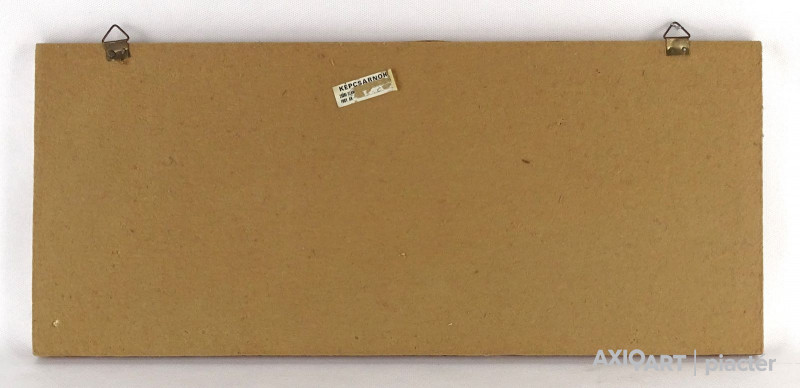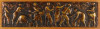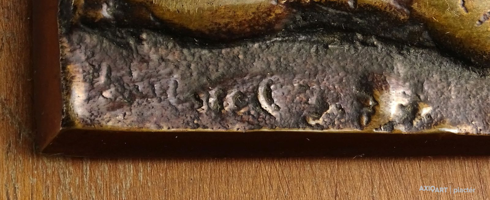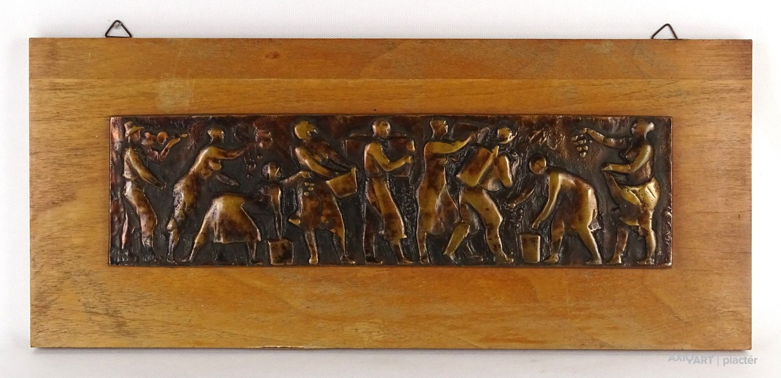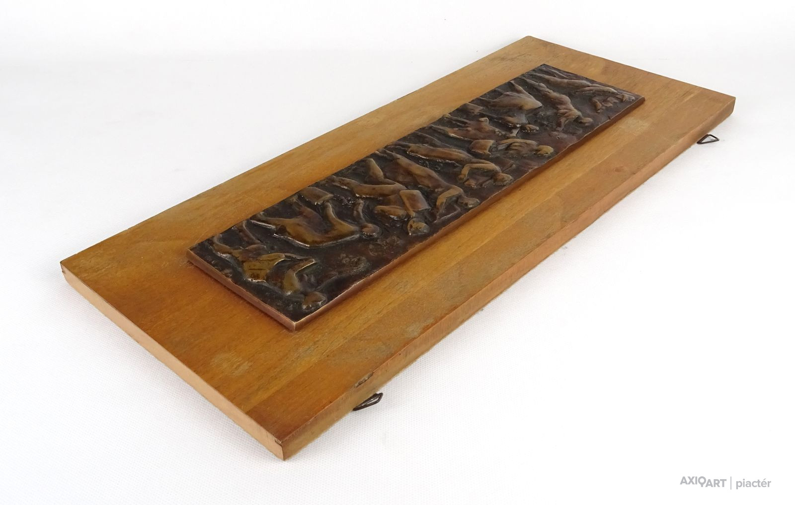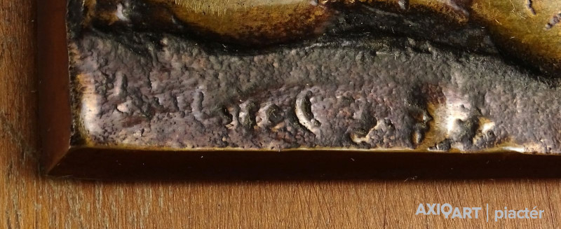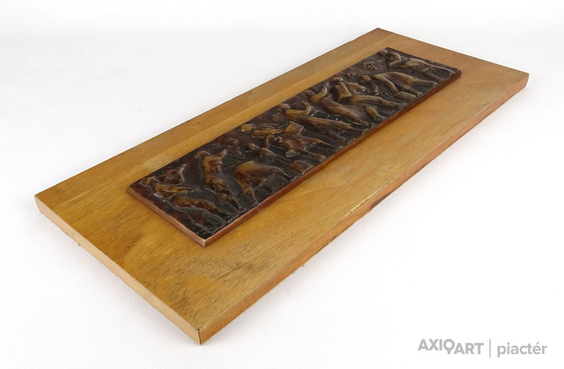 Nagy méretű, fa táblára illesztett jelzett plasztikus bronz plakett, bronz relief. Akasztási lehetőséggel rendelkezik.