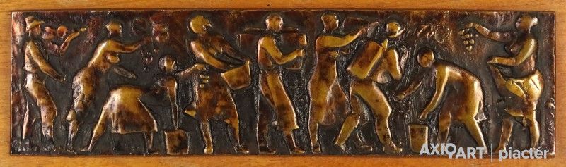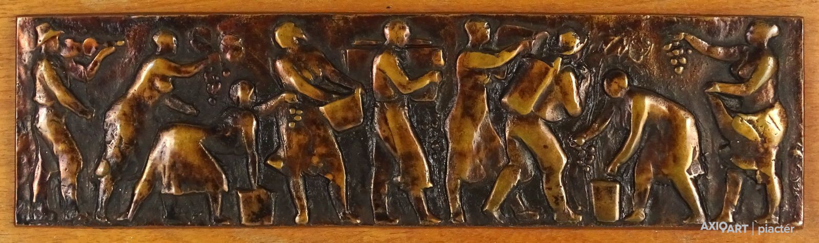 Kubisch János jelzett képcsarnokos szőlőszüret bronz relief 21 x 49 cm