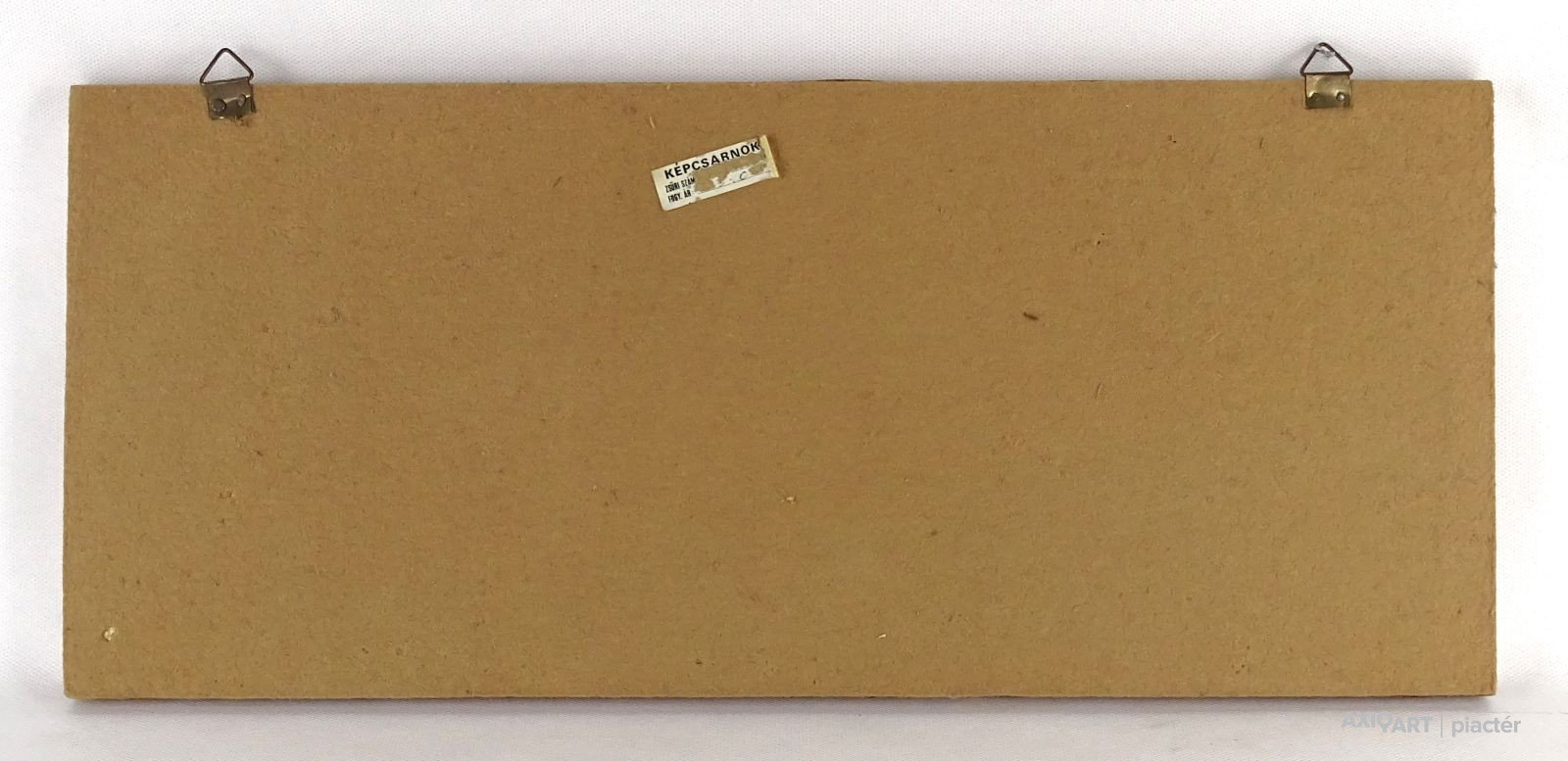 [1Y029/Z018] Olaj farost festmény, üveglap mögött, hibátlan képcsarnokos keretben. Hátoldalán Képcsarnok Vállalat papír címkéje: A művész neve: SCHÉNER MIHÁLY A kép címe: TÁJ Magasság: 66.5 cm Szélesség: 86 cm Súly: 6.54 kg Schéner Mihály festő, grafikus, szobrász, keramikus, bábtervező Medgyesegyháza, 1923-01-9 Elhalálozott: Budapest, 2009. május 11. Honlap: http://www.kormendigaleria.hu/kiadvany.html 1942-1947: Magyar Képzőművészeti Főiskola, tanára: Rudnay Gyula. 1978: Munkácsy-díj; 1984: érdemes művész; 1989: kiváló művész; 1995: Kossuth-díj. 1992-től a Magyar Művészeti Akadémia, 1993-tól a Széchenyi Irodalmi és Művészeti Akadémia tagja. 1956-ig tanított. 1982: Nagyatádi Faszobrász Alkotótelep, 1985: Nemzetközi Acélszobrász Alkotótelep, Dunaújváros. A stílusában felismerhető, mégis sokféle műtárgyat létrehozó ~ gazdag, állandóan alakuló életműve a folyton változó világban helyét kereső, az alkotói szabadságot megvalósító XX. századi képzőművész példázata lehetne. Magát expresszív-szürrealista alkotónak nevezi. Egyaránt dolgozik festékkel, textillel, fával, fémmel. Rajzol, szerkeszt, farag, épít, gyúr, varr és ragaszt, felhasználja a mézesbábok öntőformáit. Festő, rajzoló, textilszobor- és bábkészítő, fazekas, asztalos, esztergályos. Háromlépcsős folyamatban gondolkozik: rajzban tervez, majd fest, szobrot készít, “formába önt”, mindig a végső plasztikai megoldást keresi. Ami állandó és mégis játékosan változékony megjelenésű Schéner művészetében, az a gyermekkori emlékek által meghatározott népi mesterségek iránti tiszteletet kifejező motívumkincs, a tárgyi folklór formakészlete, amely már-már kézjegyként ismétlődik munkáin. Mitologikussá nőtt képzelete új lényeket teremt, pl: a Pigulát, amely disznótestű, emberfejű teremtmény. Schéner festményein a szürrealista motívumokat konstruktív szerkezetbe rendezi, a geometriát és az organikus természeti motívumokat egyaránt beépíti műveibe. A népi, népművészeti formakincsből merített lovas huszárok, betyárok, szegénylegények cifra szűr mentéje, piros csákója, fekete csizmája, az önálló életet élő zsinórdíszek és mézeskalács bábok, a kiskocsik a gyermekkori vásárok, búcsúk színes forgatagába vezet. A primér motívumokat aztán felváltják a vastagon felhordott felületbe karcolt jelek, vonalhálózatok, amelyek a játszó gyermek homokba rajzolt ábráit, a pásztorember fába vésett üzeneteit, az ősember barlang falába rótt mágikus jeleneteit idézik meg. A művész pillanatnyi érdeklődésének megfelelően a színek búvópatakként tűnnek el és jelennek meg ismét. A 60-as években leginkább a formákkal való játék érdekelte, a festmények felülete egyre gazdagodott: a táblaképek felületén applikációk jelentek meg, vagy lemállasztott rétegek hagyták maguk után hiányukat, motívumok nélküli ősformák, archetipikus képzetek bukkantak fel művészetében. A véletlenszerűnek látszó rétegekkel való játék azonban tudatos komponálás eredménye, amely később nyilvánvaló ritmusnak és formai szerkesztettségnek adja át a helyét, mint a Törvénytáblák c. sorozaton. A különböző művészi kifejezési formák egymásra termékenyítő hatással vannak, át- meg áthatják egymást. Textilszobrai, amelyekkel új műfajt teremtett, ugyanazzal az automatikus, expresszív-szürrealista módszerrel készülnek, mint festményei. A hagyományosan a népművészetben alkalmazott anyag, a filc lehetőséget ad a népi formakincs felelevenítésére, amely azonban a művész különös szürrealista átiratában jelenik meg. A szívekkel kivarrt, zsinórdíszes Posztókotlós c. művén mézesbábok lógnak, hátán huszárok lovagolnak. Egész sor textilből készült kéz-plasztikát alkot, amelyeket az ujjakra rávarrt díszekkel öltöztet, személyesít meg. A színes-különös világból aztán ~ újra puritán képi és formai rendbe juttatja el a nézőt, majd nemsokára tépett, gyűrt, vágott, csorgatott, repedezni hagyott szenvedélyesen vonagló képi felületeket hagy hátra. Schéner készített apró gyermekjátékokat, térstruktúra-tereket, mászókákat is. A magyar népi formák mellett szürreális játékaiban gyakran alkalmaz görög mitológiai alakokat, “elkentaurosodott” lovakat, Gorgó-fejeket, sellőket, hárpiákat, Pán-ábrázolásokat. Schéner nemcsak saját művészetéről publikál, hanem művésztársairól is számos írása jelenik meg, elsősorban az Új Auróra c. folyóiratban, amelynek egy ideig főmunkatársa volt. Irodalom kiállítása, Magyar Építőművészet, 1962/4. Húsz év után, Művészet, 1965/4. BOZÓKY M.: ~, Tiszatáj, 1968/5. PERNECZKY G.: Nincs uborkaszezon, Élet és Irodalom, 1969. augusztus 8. BARÁNSZKY-JÓB L.: ~, Művészet, 1969/9. LÁSZLÓ GY.: ~ kaposvári kiállítása, Jelenkor, 1969/4. MAJOR M.: Pásztorok, betyárok, huszárok - kezek, Tükör, 1970. szeptember 15. FRANK J.: Bemutatjuk ~t, Élet és Irodalom, 1972. május 6. ról kiállítása ürügyén, Képzőművészeti Almanach, Budapest, 1972 Sötétkék kokasok, Élet és Irodalom, 1973. szeptember 9. MAJOR M.: ~ játékai, Élet és Irodalom, 1974. július 27. BARTA J.: Egy különös művész, Alföld, 1974/6. VADAS J.: Szárnykészítők, Élet és Irodalom, 1975. október 4. JUHÁSZ F.: A halál ellen játszani, Élet és Irodalom, 1975. május 17. PAP G.: Kincsek és műkincsek, Művészet, 1975/6. P. SZŰCS J.: Az utak kettéválnak, Művészet, 1978/3. Békési művészet, Művészet, 1978/7. SZAMOSI F.: ~ [kismonográfia], Budapest, 1978 VADAS J.: Játék a játékkal, Élet és Irodalom, 1979. augusztus 18. NÉMETH L.: ~ műveiről, Művészet, 1979/4. MIKLÓS P.: Mit akar ez a múzeum?, Művésze