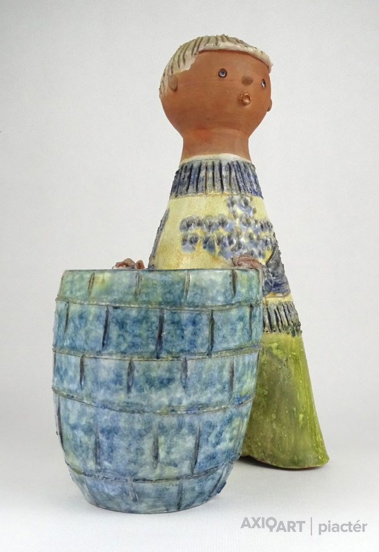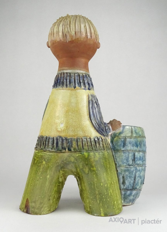 [1S119/Z059] 25% ÁRENGEDMÉNY MINDEN TERMÉKÜNKRE Dec. 14-ig Nagy méretű, jelzett, kézifestett, mázas kerámia szobor. A fiú lábánál máz lepattanások találhatók. Alján jelzés: KISS ROÓZ Magasság: 31 cm Szélesség: 22.5 cm Súly: 1.495 kg Kiss Roóz Ilona keramikus Születési hely: Szatmárnémeti [Satu Mare, RO] Születési dátum: 1920 Honlap: Kiállítások az adatbázisban: Kiss Roóz Ilona életműkiállítása Mesterei: Orbán Antal, Ohmann Béla. 1939-43: Iparművészeti Iskola, mesterei: Orbán Antal, Ohmann Béla. 1956, 1962: Munkácsy-díj; 1980: érdemes művész; 1984: SZOT-díj; 1994: MSZOSZ díja; 1995: Magyar Köztársasági Érdemrend Középkeresztje. A magyar kerámia Kovács Margit által teremtett naiv-népies irányzatának jeles művelője. Edényeit, kisplasztikáit, ill. murális alkotásait vidám színvilág és kedves humor jellemzi. 1948 és 1952 között tanított az Iparművészeti Főiskolán, azóta szabadfoglalkozású. Egyéni kiállítások 1961 • Csók Galéria, Budapest [Bódy Irénnel, Csányi Árpádnéval és Pecz Jánossal] 1964 • Katona József Múzeum, Kecskemét 1966 • Csók Galéria, Budapest 1967 • Gulácsy Terem, Szeged 1971 • Csók Galéria, Budapest 1972 • Balatonfüred 1973 • Derkovits Galéria, Szombathely 1976 • Zürich 1977 • Csepel Vas és Fémművek, Budapest 1978 • Juhász Gyula Művelődési Központ, Szeged • Fővárosi Művelődési Ház, Budapest 1979 • Csók Galéria, Budapest 1980 • Budavári Ipaművészeti Bolt, Budapest 1981 • Kaesz Gyula Szakmunkásképző Intézet, Budapest 1982 • Offenburg 1983 • Nógrádi Sándor Múzeum, Salgótarján 1984 • Petőfi Művelődési Ház, Tiszaluc 1986 • Festőterem, Sopron 1987 • Petőfi Művelődési Ház, Tiszaluc 1989 • Kispréposti Palota, Eger (állandó kiállítás) 1991 • Csók Galéria, Budapest 1992 • Bécs 1994 • Petőfi Művelődési Ház, Tiszaluc 1995 • Minigaléria, Miskolc 1995 • Csók Galéria, Budapest [Pannonhalmi Zsuzsával és Sarkantyu Judittal] 1996 • Petőfi Művelődési Ház, Tiszaluc 1997 • Derkovits Művelődési Központ, Tiszaújváros. Válogatott csoportos kiállítások 1947 • Karácsonyi kiállítás, Budapest • Fővárosi Művelődési Központ 1952 • Iparművészeti kiállítás, Ernst Múzeum, Budapest 1956 • Iparművészeti kiállítás, Iparművészeti Múzeum, Budapest 1958 • Magyar kerámia kiállítás, Vallauris 1959 • Magyar képzőművésznők kiállítása, Ernst Múzeum, Budapest 1959 • IV. Országos Iparművészeti Kiállítás, Műcsarnok, Budapest 1963 • Modern magyar kerámia, Royal Festival Hall, London 1965 • Országos Iparművészeti Kiállítás, Műcsarnok, Budapest 1968, 1970 • I., II. Országos Kerámia Biennálé, Pécs 1973 • Magyar kerámia, Ankara, Isztambul 1975 • Tárgy és alkotója, Iparművészeti Múzeum, Budapest 1982 • Magyar kézműves kerámia, Siklós 1995 • XX. századi magyar keramikusok, Iparművészeti Múzeum, Budapest • Az agyag mesterei, Vigadó Galéria, Budapest 1998 • Őszi Kerámia Kiállítás, Olaf Palme Ház, Budapest Művek közgyűjteményekben Déri Múzeum, Debrecen • Iparművészeti Múzeum, Budapest • Janus Pannonius Múzeum, Pécs • Kispréposti Palota, önálló gyűjtemény, Eger. Köztéri művei Kukorica-Búzakalász (homlokzati kerámia, 1956, Mezőgazdasági Kiállítás, Budapest) kerámia dombormű (1958, Pereces, bölcsőde) kerámia napóra (1959, Székesfehérvár, Béke téri iskola) csempeburkolat (1961, Szeged, rendelőintézet) kerámia falikút (1961, Monor, gimnázium) falikép (kerámia, 1962, Sopron, Gyermekszanatórium) kerámia falikép (1964, Kecskemét, Ének-zenei Általános Iskola) kerámia falikép (1966, Békéscsaba, bölcsőde) kerámia falikép (1967, Esztergom, kórház). Irodalom KOCZOGH Á.: ~, Budapest, 1987 GÁL J.: ~ 77 éves. Beszélgetés a művésszel, Magyar Iparművészet, 1997/4. KESZTHELYI K.-LACZKÓ I.: A magyar kerámiaművészet I., Alkotók, adatok 1945-1998, Budapest, 1999. Forrás: artportal.hu