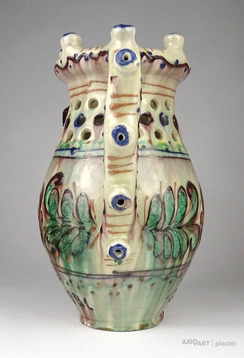 Szép állapotú, áttört motívumokkal díszített, mázas kerámia füles korsó, csalikancsó. Oldalát nagy méretű plasztikus bajszos férfi arc díszíti.