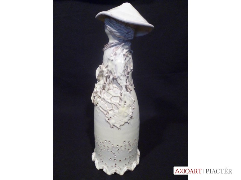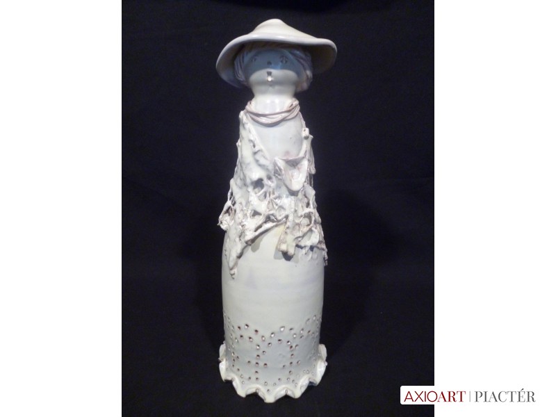 [1O012/UZ-K] Márvány talapzaton álló, jelzett, fém hatású kerámia nő szobor virágcsokorral és gyümölcstállal a kezében. A kerámia felülete bronzoxid. Körpecséten jelzés: DEBRECZENI - PELCZ 2008 Magasság: 31.5 cm Szélesség: 10 cm Súly: 1.53 kg Debreceni Zsóka keramikus Szolnok, 1950-04-14 Szerző: Szolláth György 1968: Képzőművészeti Szakközépiskola, mestere: Csekovszky Árpád. 1993: Nyári Tárlat, Eger, Önkormányzat díja; 1993: Szüret a képzőművészetben, Eger, Heves megye díja, 1997: PELSO ’97, Keszthely, Balatoni Múzeum díja, Hévíz Város díja. 1988-93 között a Debreceni Műhely Alkotóközösségben és 1989-92 között a budapesti Manufaktúra Alkotóközösségben figurális kerámiákat készített. 1990 óta férjével, Pelz Zoltánnal együtt dolgozik. Egyéni kiállítások Egyéni kiállítások 1983 • Medgyesy Terem, Debrecen 1991 • Derkovits Terem, Budapest 1994 • Pince Galéria, Gyöngyös 1995 • Balatoni Múzeum, Keszthely 1997 • Keszthely. Válogatott csoportos kiállítások Válogatott csoportos kiállítások 1974 • Iparterv 1975 • Iparművészet ’75 1990 • Nemzetközi kerámiaverseny, Tadino 1990 • Miskolci Téli Tárlat 1992 • Tavaszi Tárlat, Csók Galéria, Budapest 1993 • Egri Nyári Tárlat. Pelcz Zoltán szobrász, keramikus Kaposvár, 1957-05-8 Szerző: Szolláth György-Wehner Tibor 1978-83: Magyar Iparművészeti Főiskola, kerámia szak, mesterei: Csekovszky Árpád, Segesdi György. 1993: Nyári Tárlat, Eger, a Salgótarjáni Önkormányzat díja; 1993: Szüret a képzőművészetben pályázat, Heves Megye díja; 1993: Díszkút-pályázat, Budapest, oklevél; 1997: Pelso ’97, Hévíz Város Díja. 1990-ig leginkább nagyméretű korongolt samott edényeket készített. 1990 óta feleségével, Debreczeni Zsókával közösen tervezik és alkotják figurális, archaizáló kerámiaszobraikat, melyeket samottos masszából magas hőfokon égetnek ki. Figuráik türkiz mázzal vagy fémoxidokkal színezettek. Gyakran alkalmazzák a raku-eljárást. Irodalom KESZTHELYI K.-LACZKÓ I.: A magyar kerámiaművészet I. Alkotók, adatok 1945-1998, Budapest, 1999. Egyéni kiállítások Egyéni kiállítások 1993 • Eger 1995 • Balatoni Múzeum, Keszthely 2000 • Gulácsy Terem, Szeged. Válogatott csoportos kiállítások Válogatott csoportos kiállítások Nemzetközi Kerámia Kiállítás, Faenza (OL) 1984 • Országos Kerámia Biennálé, Pécs 1987 • Ünnep, Vigadó Galéria, Budapest 1990 • Nemzetközi Kerámia Verseny, Perugia-Gualdo Tadino (OL) 1993 • Szüret a képzőművészetben, Eger 1995 • Magyar Kerámia Tárlat, Csók Galéria, Budapest • Vigadó Galéria, Budapest 1997 • Kerámia Fesztivál, Vigadó Galéria, Budapest • Pelso ’97, Balatoni Múzeum, Keszthely 1997, 1999 • Őszi Kerámia Kiállítás, Palme Ház, Budapest 1998 • In memoriam Tornyai János, Tornyai János Múzeum, Hódmezővásárhely Pelso ’99, Balatoni Múzeum, Keszthely • G., Ljubljana Művek közgyűjteményekben Művek közgyűjteményekben   Forrás: artportal.hu