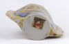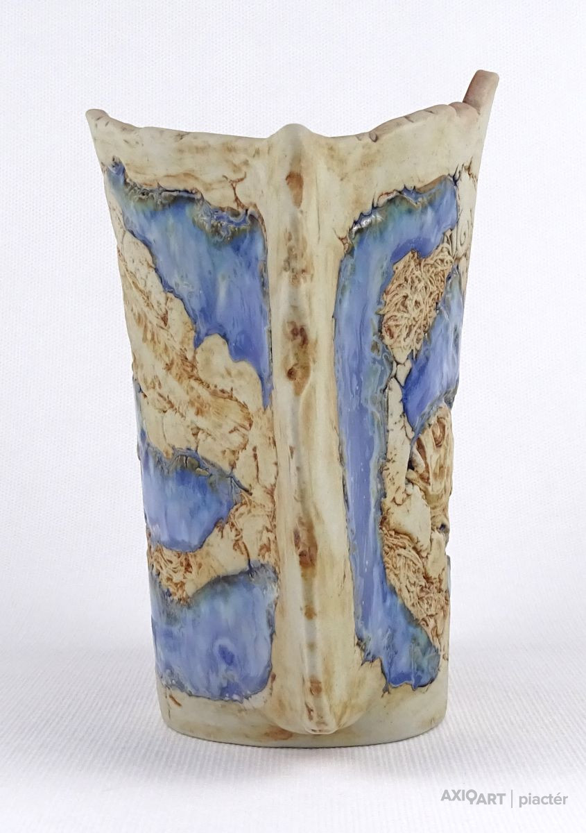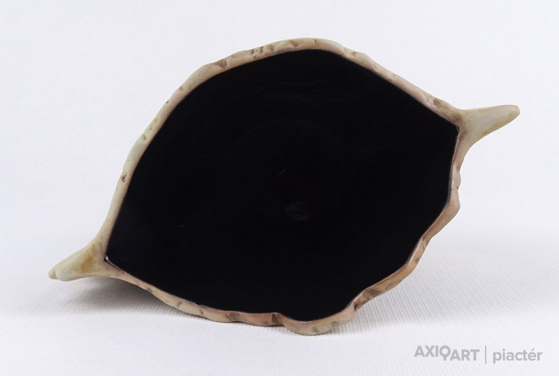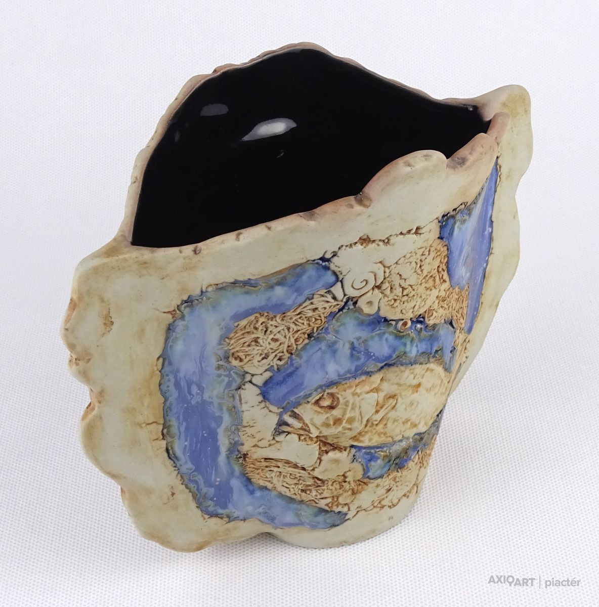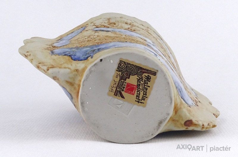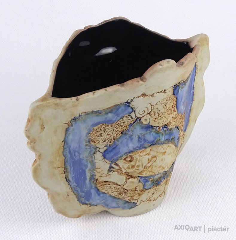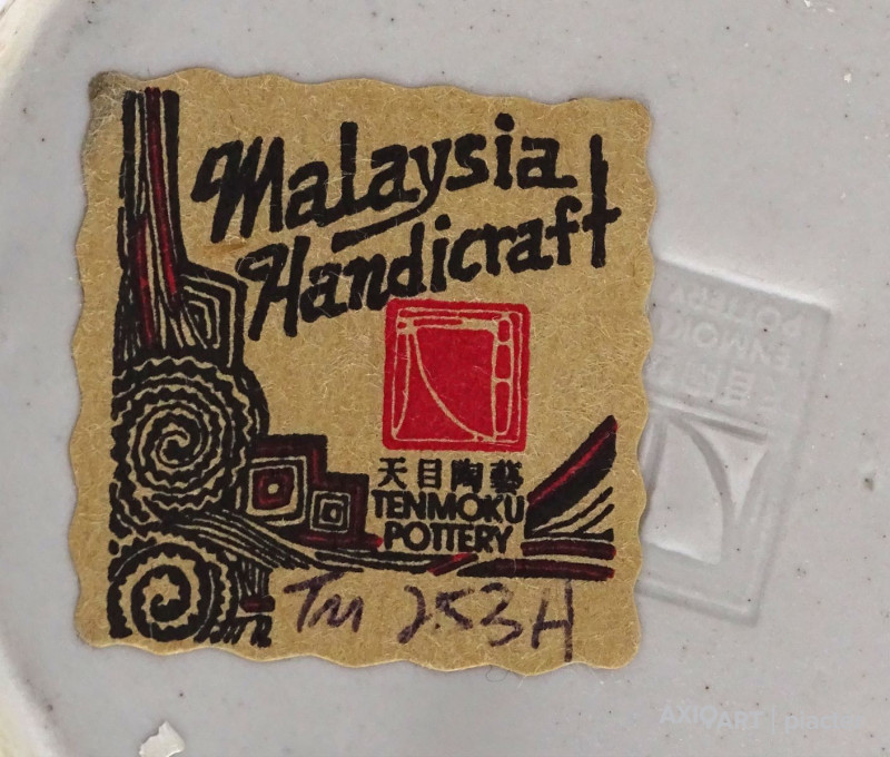 [1Q624/X076] Hibátlan állapotú különleges jelzett porcelán váza. Két oldalát hal motívumok díszítik. Alján mélynyomott jelzés: TENMOKU POTTERY Mellette címke, rajta felirat: MALAYSIA HANDCRAFT TENMOKU POTTERY ZM 253H Magasság: 16 cm Szélesség: 10 cm Hosszúság: 18.5 cm Súly: 0.575 kg