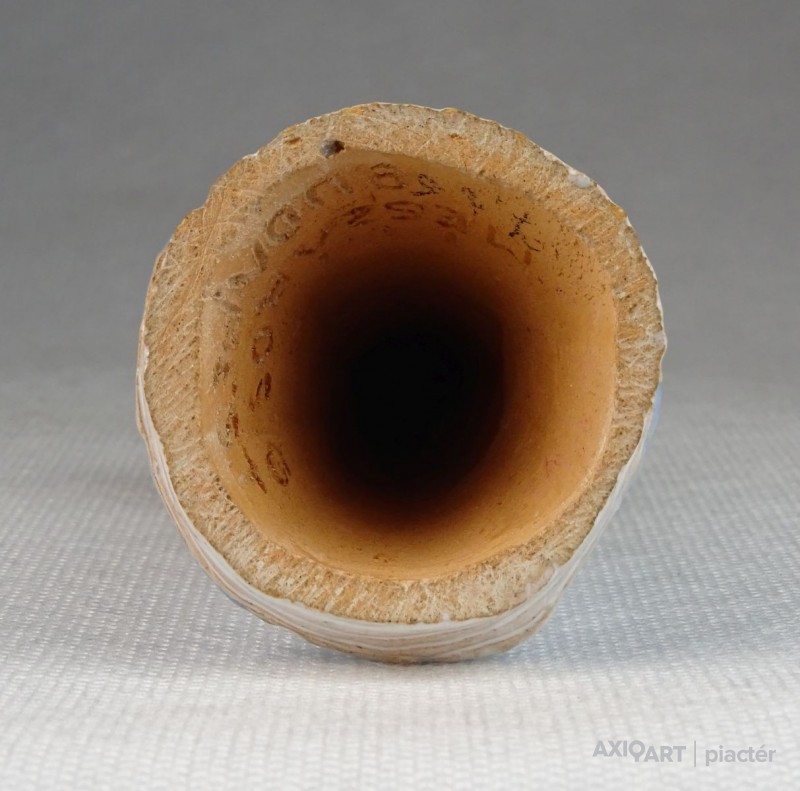 [0U704/BX-9] Hibátlan állapotú, jelzett, háromalakos kerámia figurális mécsestartó figura. Jelzés: KISS ROÓZ Magasság: 19 cm Szélesség: 6 cm Hosszúság: 16 cm Súly: 0.639 kg Kiss Roóz Ilona keramikus Születési hely: Szatmárnémeti [Satu Mare, RO] Születési dátum: 1920 Kiállítások az adatbázisban:  Kiss Roóz Ilona életműkiállítása Mesterei: Orbán Antal, Ohmann Béla. 1939-43: Iparművészeti Iskola, mesterei: Orbán Antal, Ohmann Béla. 1956, 1962: Munkácsy-díj; 1980: érdemes művész; 1984: SZOT-díj; 1994: MSZOSZ díja; 1995: Magyar Köztársasági Érdemrend Középkeresztje. A magyar kerámia Kovács Margit által teremtett naiv-népies irányzatának jeles művelője. Edényeit, kisplasztikáit, ill. murális alkotásait vidám színvilág és kedves humor jellemzi. 1948 és 1952 között tanított az Iparművészeti Főiskolán, azóta szabadfoglalkozású. Egyéni kiállítások 1966 • Csók Galéria, Budapest 1971 • Csók Galéria, Budapest 1980 • Budavári Ipaművészeti Bolt, Budapest 1984 • Petőfi Művelődési Ház, Tiszaluc 1989 • Kispréposti Palota, Eger (állandó kiállítás) 1992 • Bécs 1995 • Minigaléria, Miskolc 1996 • Petőfi Művelődési Ház, Tiszaluc 1997 • Derkovits Művelődési Központ, Tiszaújváros. Válogatott csoportos kiállítások 1947 • Karácsonyi kiállítás, Budapest • Fővárosi Művelődési Központ 1952 • Iparművészeti kiállítás, Ernst Múzeum, Budapest 1956 • Iparművészeti kiállítás, Iparművészeti Múzeum, Budapest 1958 • Magyar kerámia kiállítás, Vallauris 1959 • Magyar képzőművésznők kiállítása, Ernst Múzeum, Budapest 1959 • IV. Országos Iparművészeti Kiállítás, Műcsarnok, Budapest 1963 • Modern magyar kerámia, Royal Festival Hall, London 1965 • Országos Iparművészeti Kiállítás, Műcsarnok, Budapest 1968, 1970 • I., II. Országos Kerámia Biennálé, Pécs 1973 • Magyar kerámia, Ankara, Isztambul 1975 • Tárgy és alkotója, Iparművészeti Múzeum, Budapest 1982 • Magyar kézműves kerámia, Siklós 1995 • XX. századi magyar keramikusok, Iparművészeti Múzeum, Budapest • Az agyag mesterei, Vigadó Galéria, Budapest 1998 • Őszi Kerámia Kiállítás, Olaf Palme Ház, Budapest Művek közgyűjteményekben Köztéri művei kerámia dombormű (1958, Pereces, bölcsőde) kerámia napóra (1959, Székesfehérvár, Béke téri iskola) csempeburkolat (1961, Szeged, rendelőintézet) falikép (kerámia, 1962, Sopron, Gyermekszanatórium) kerámia falikép (1966, Békéscsaba, bölcsőde) Irodalom GÁL J.: ~ 77 éves. Beszélgetés a művésszel, Magyar Iparművészet, 1997/4. KESZTHELYI K.-LACZKÓ I.: A magyar kerámiaművészet I., Alkotók, adatok 1945-1998, Budapest, 1999. Vadas József + MAOE Forrás: artportal.hu